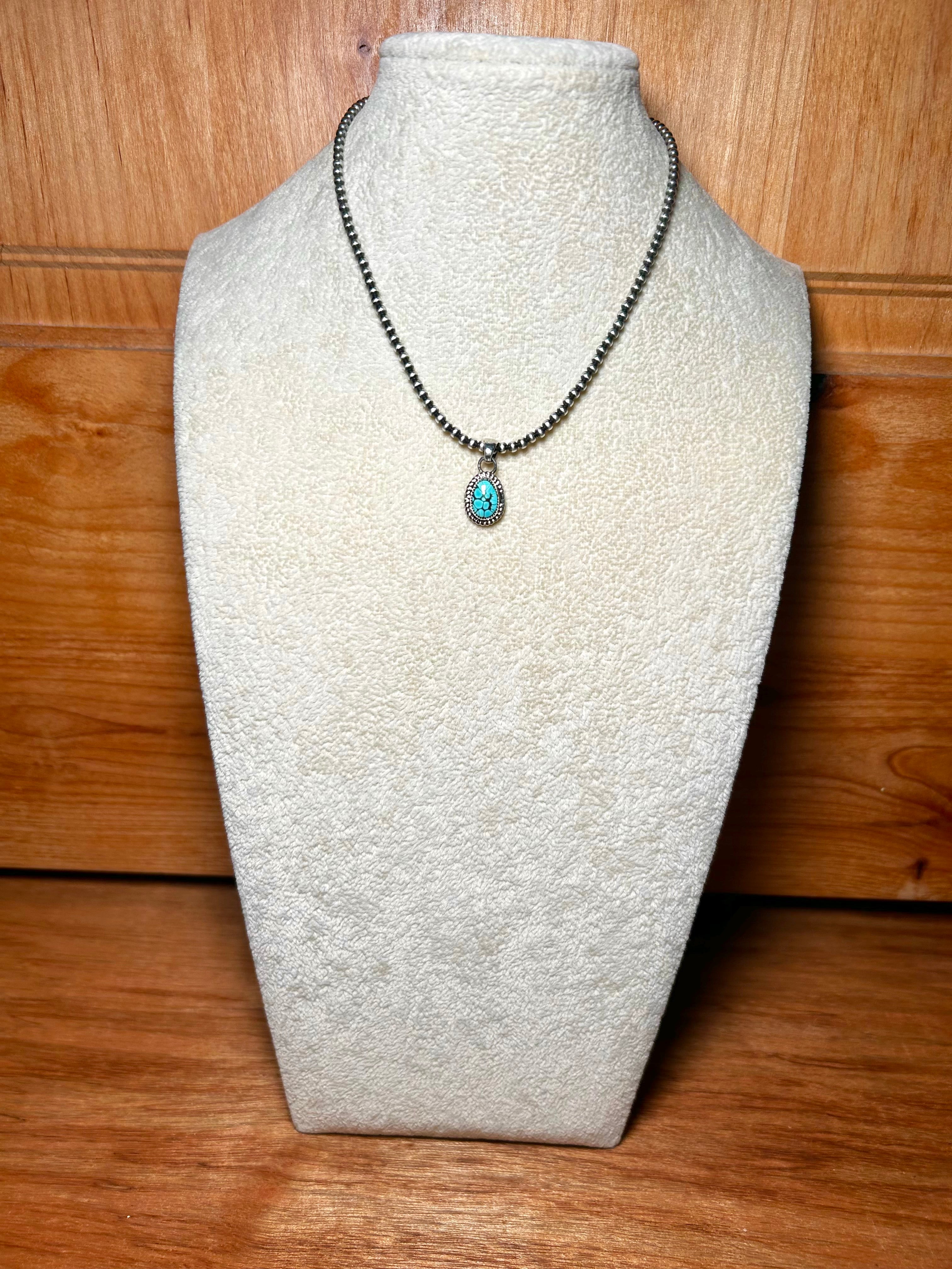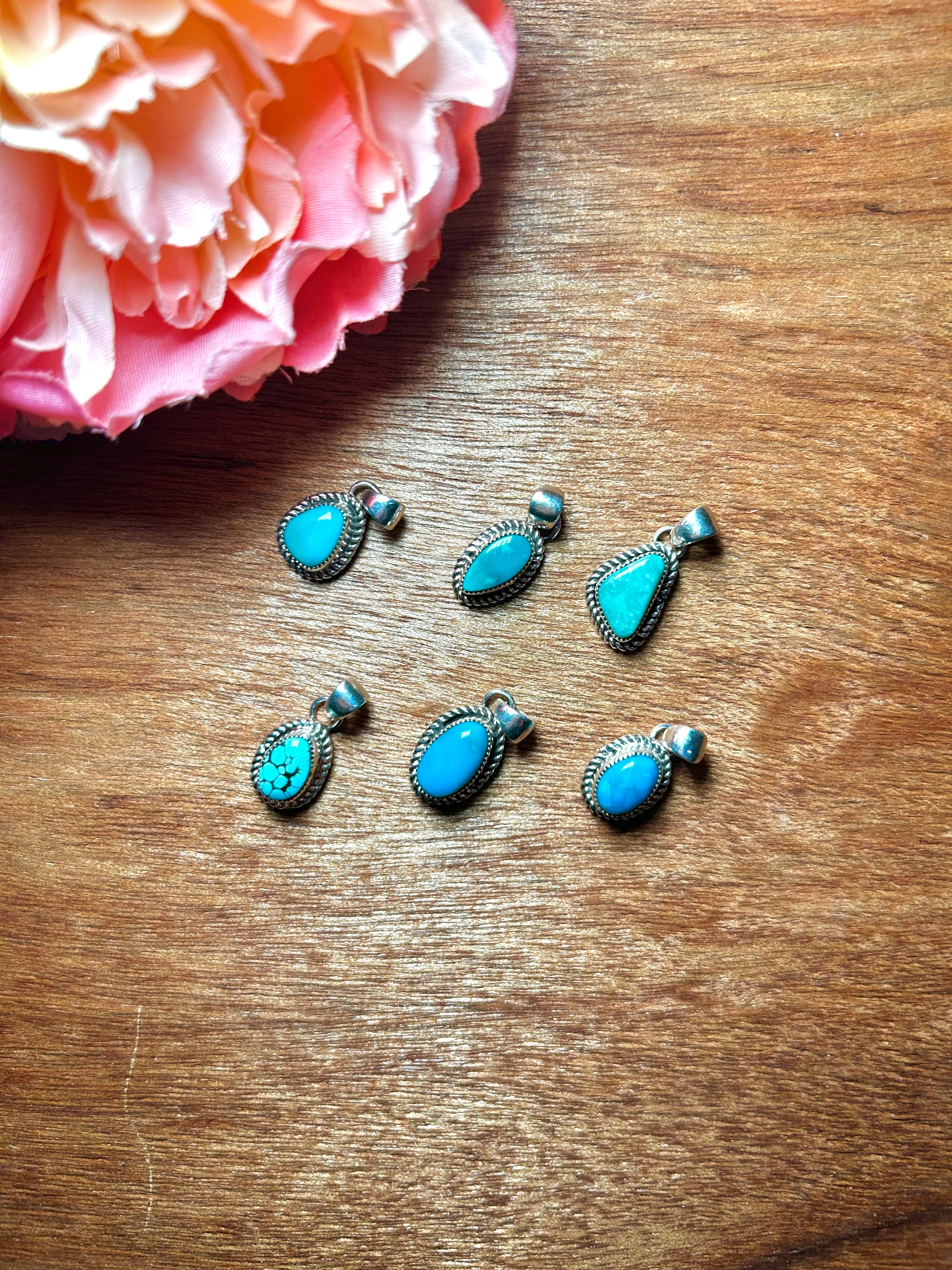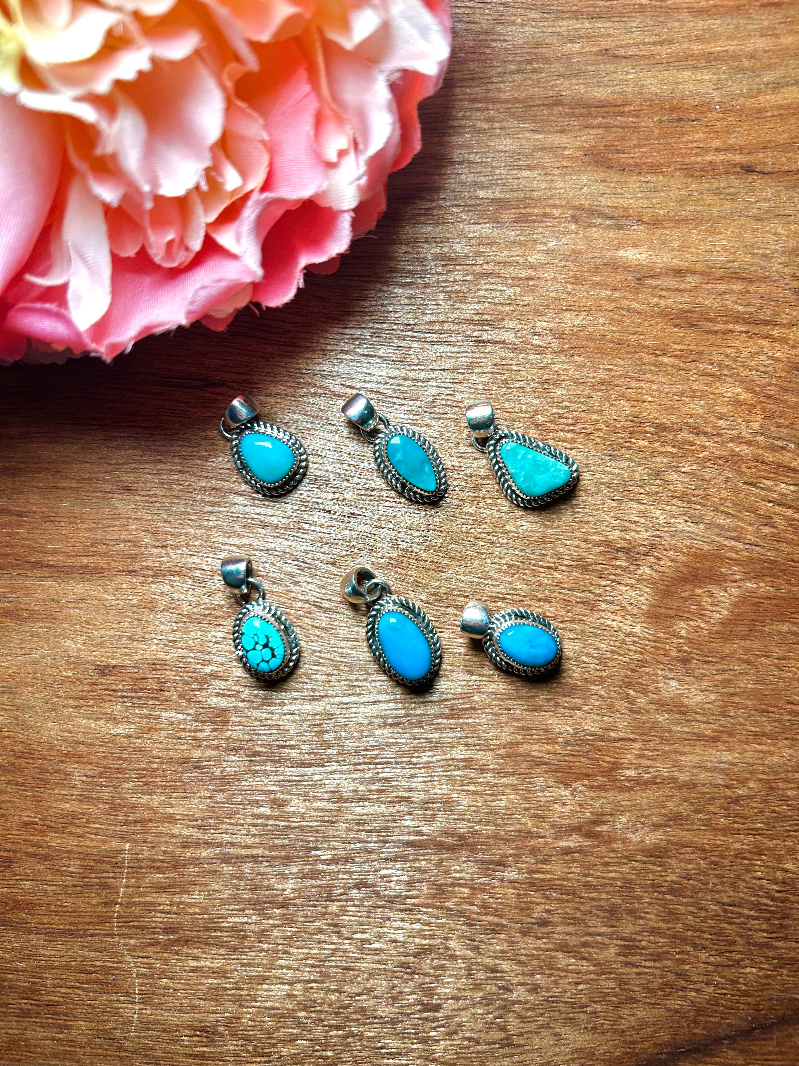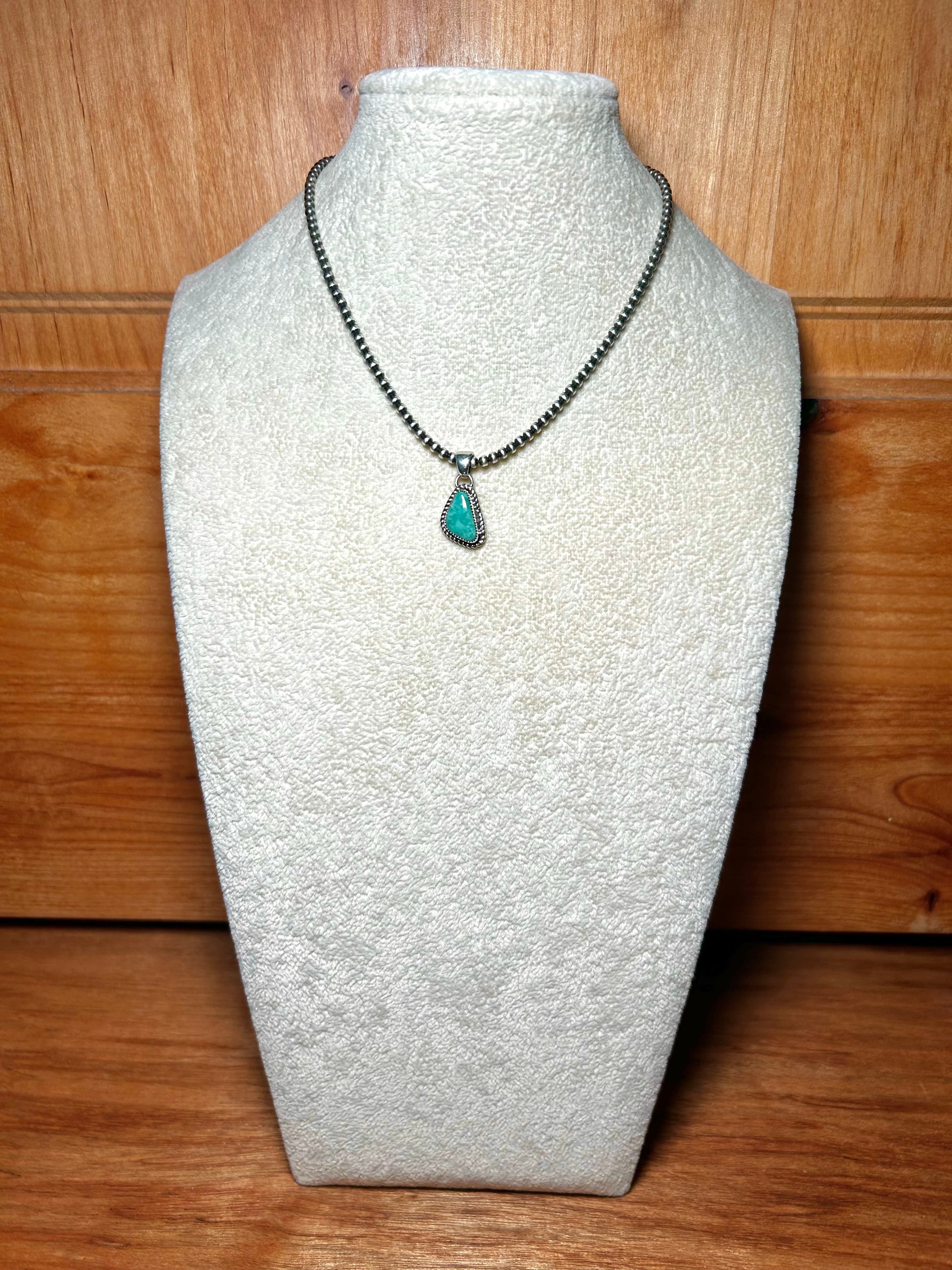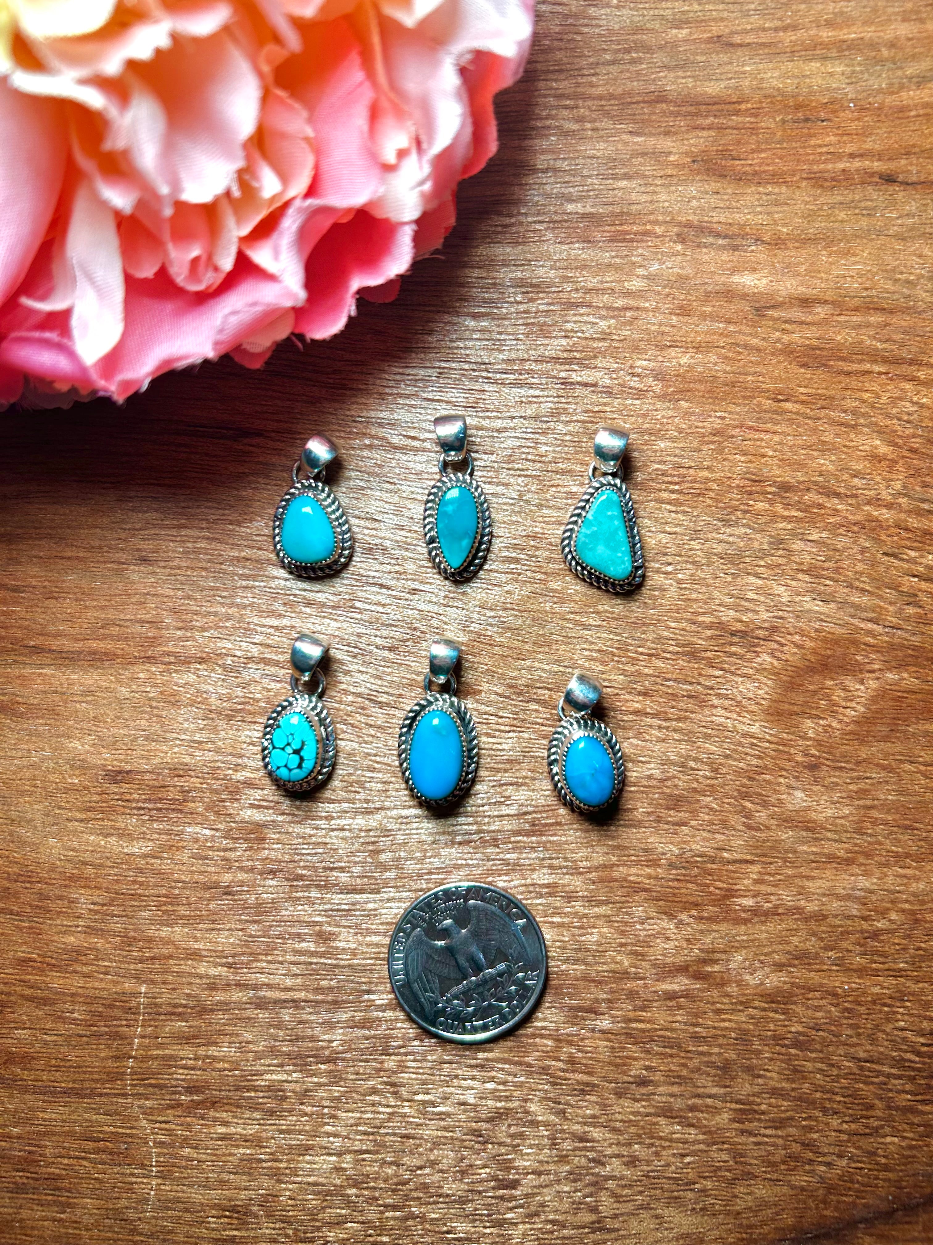 Navajo Made Kingman Turquoise & Sterling Silver Pendant. It measures 1 inch long and 1/2 of an inch wide. Pendant Only. Signed by the artist and stamped sterling silver.