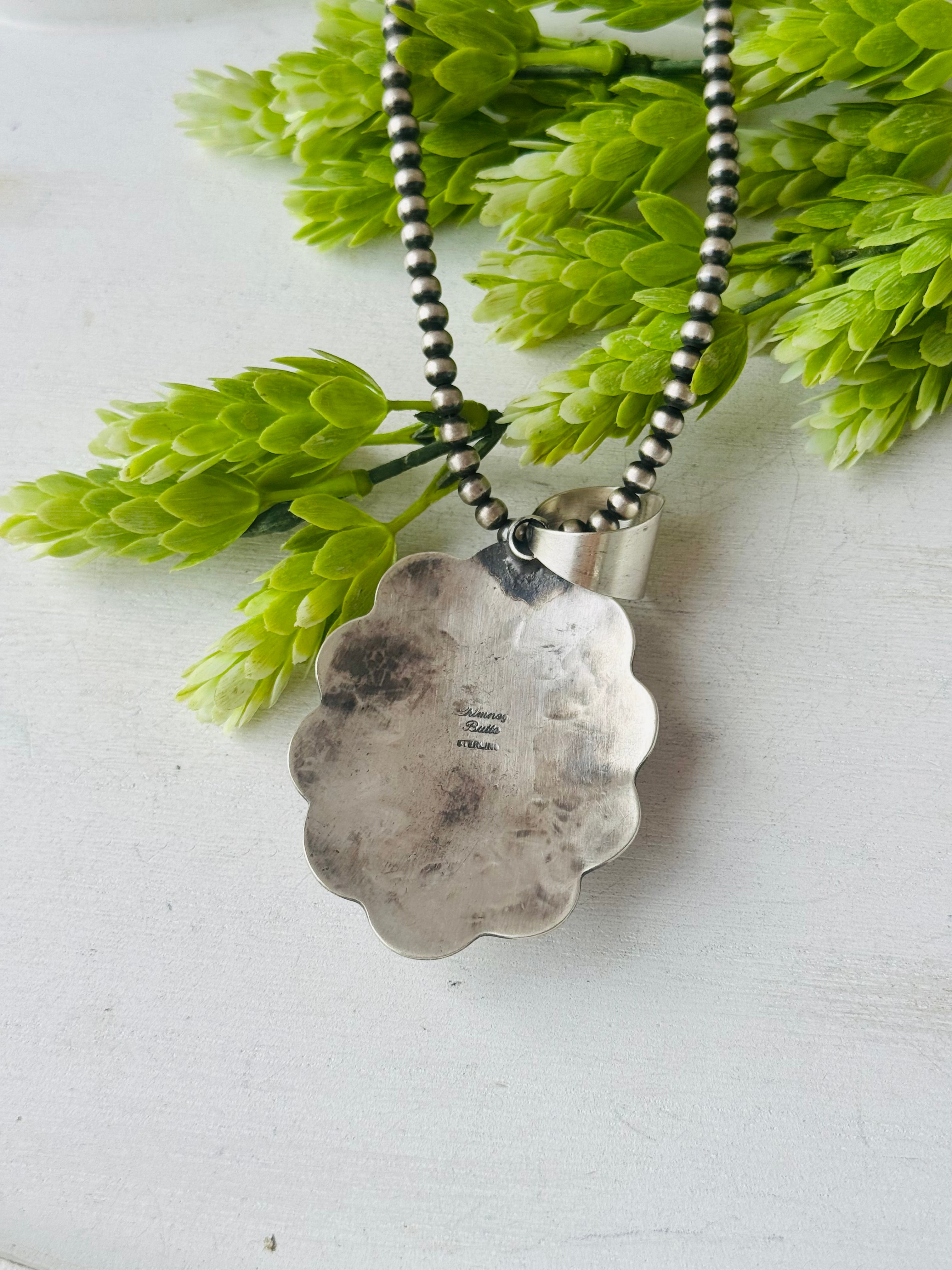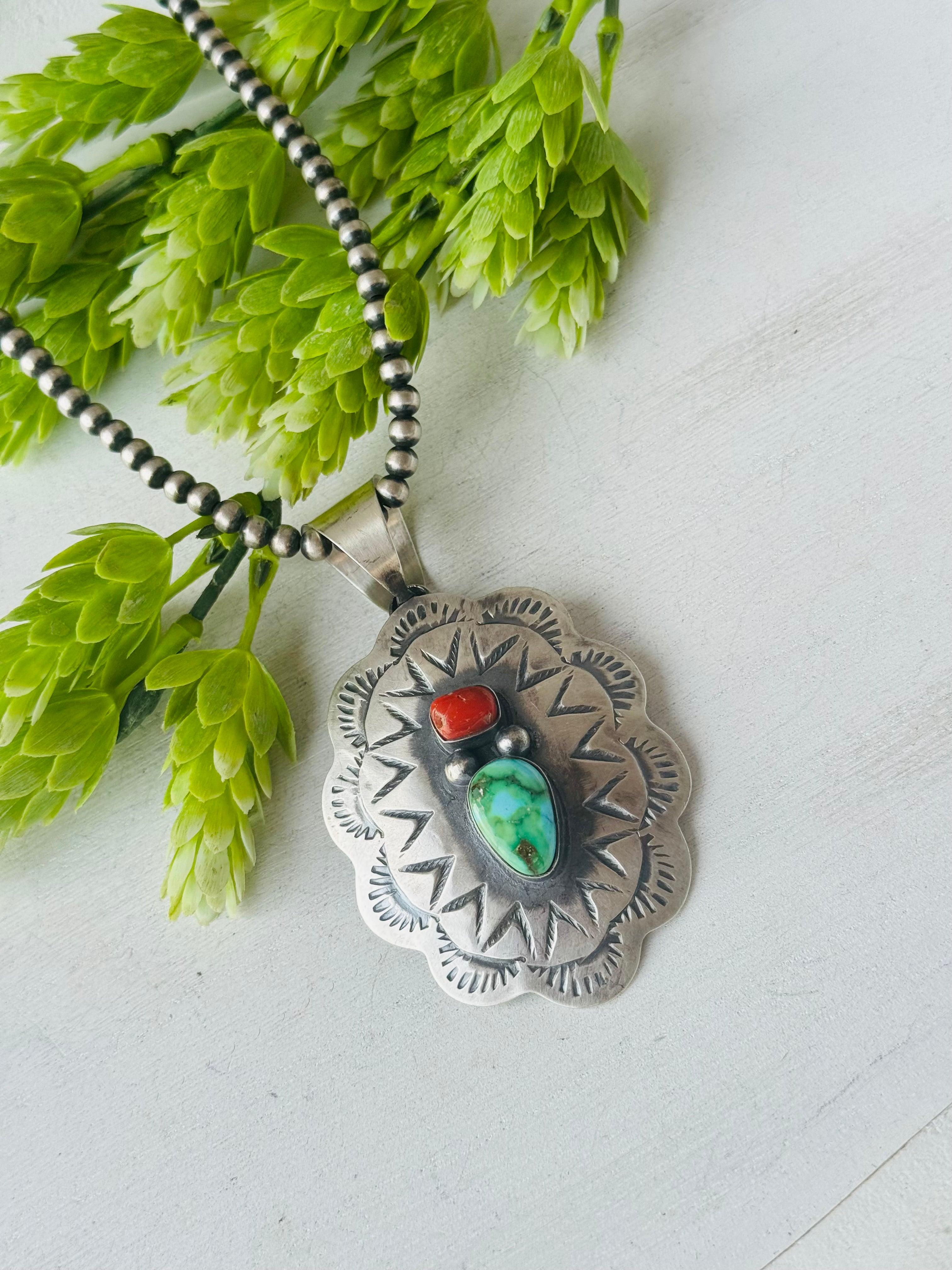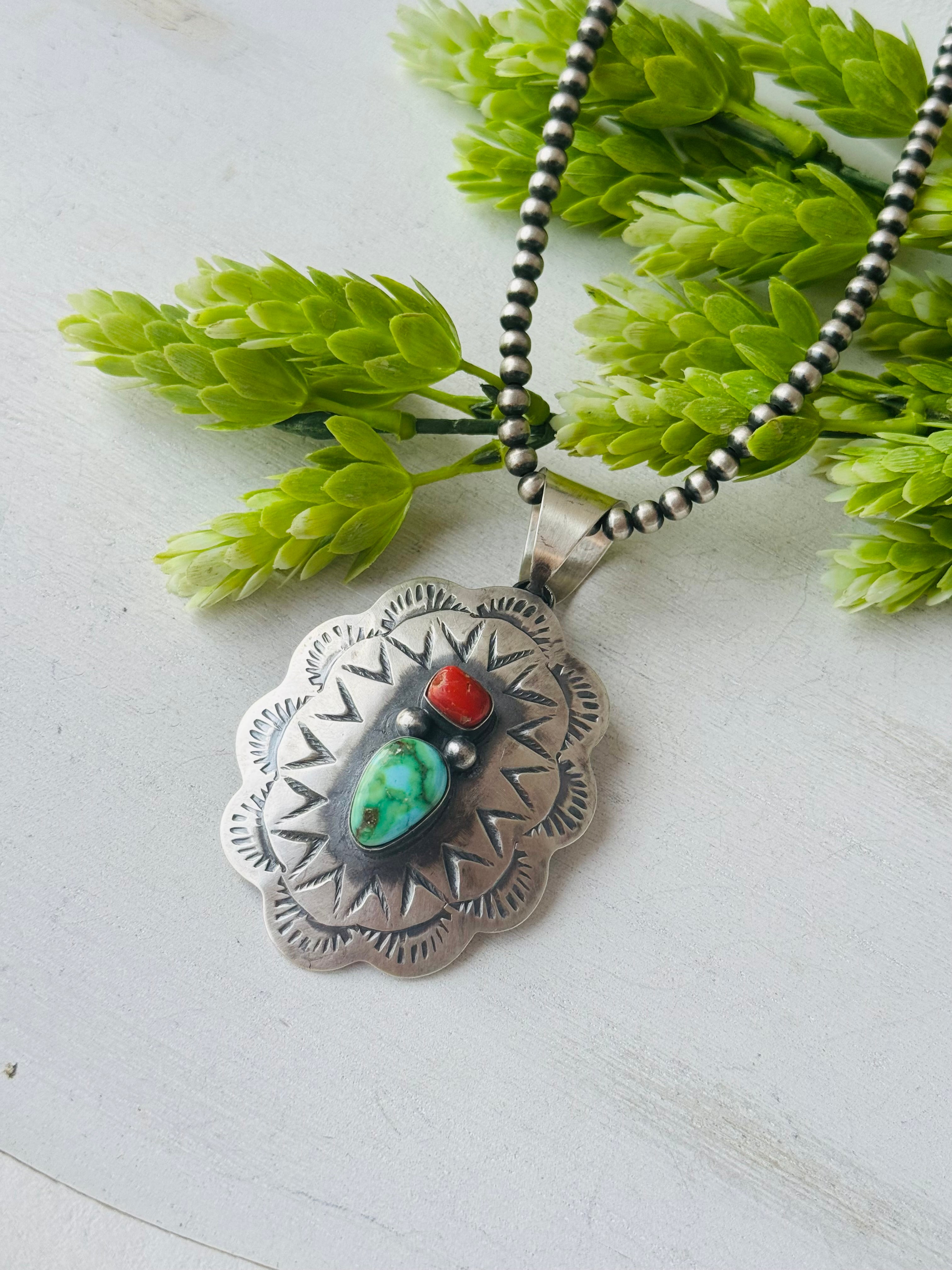 Chimney Butte Multi Stone & Sterling Silver Concho Pendant. It measures 3 1/2 inches long and 2 1/8 inches wide. Pendant Only. Signed by the artist and stamped sterling silver.