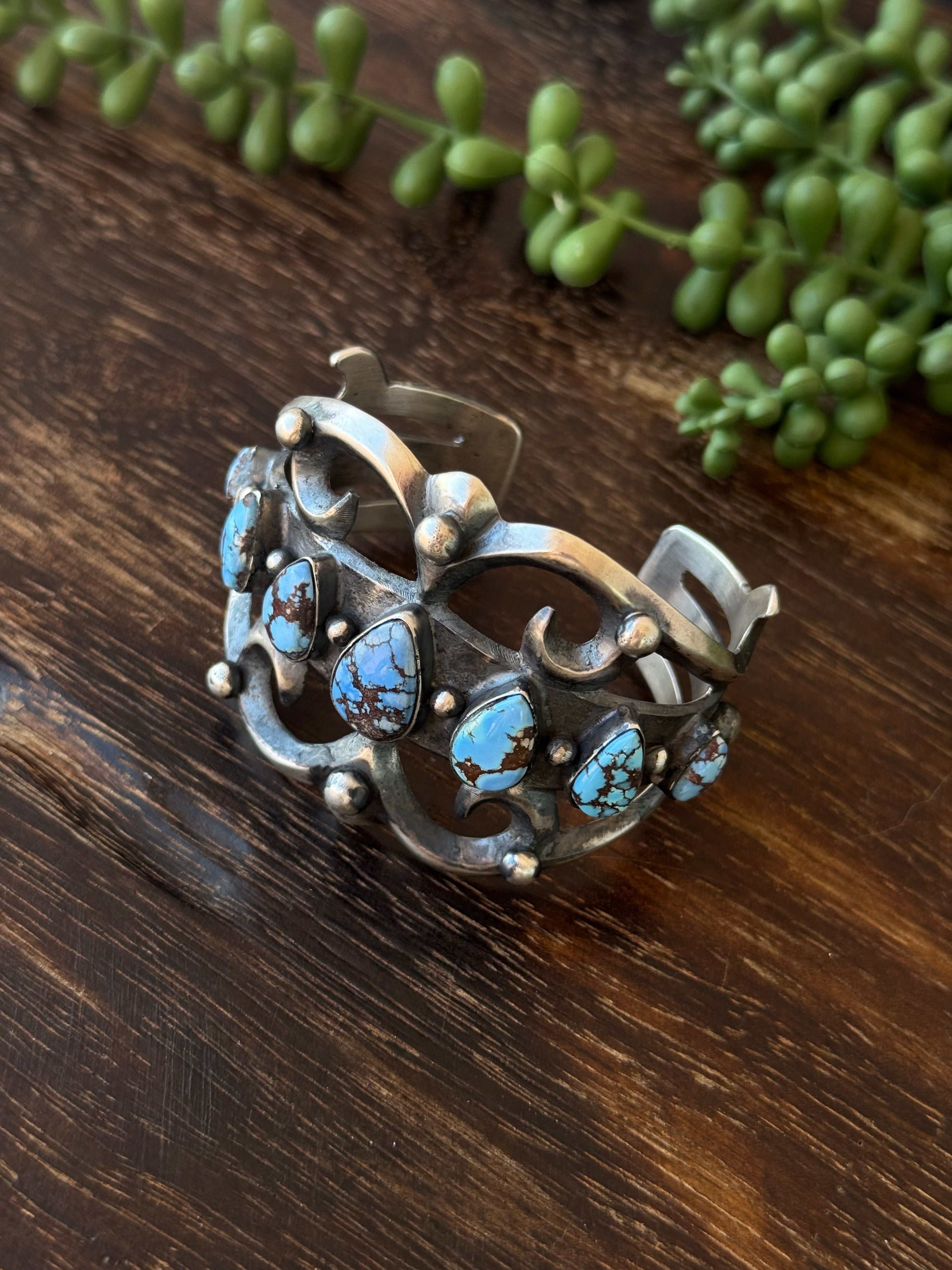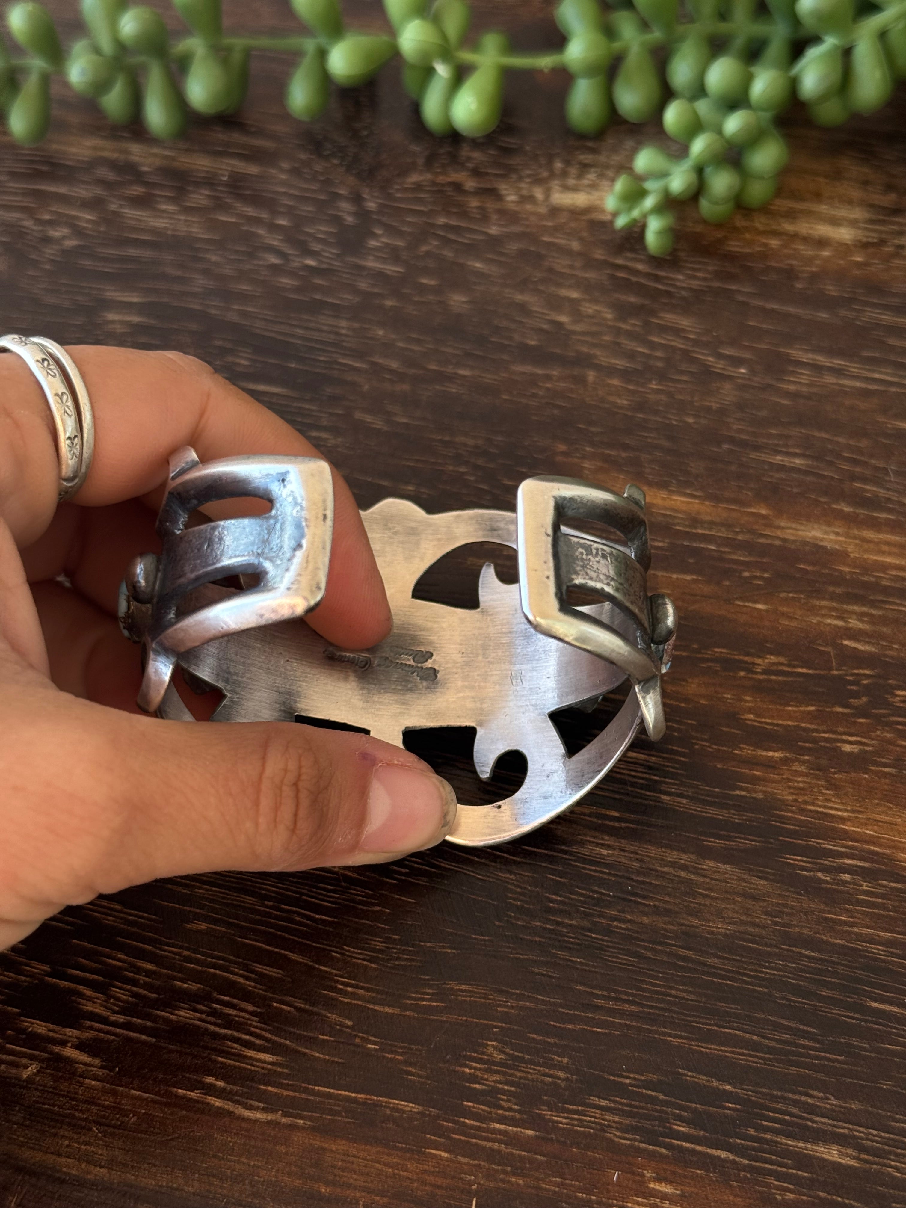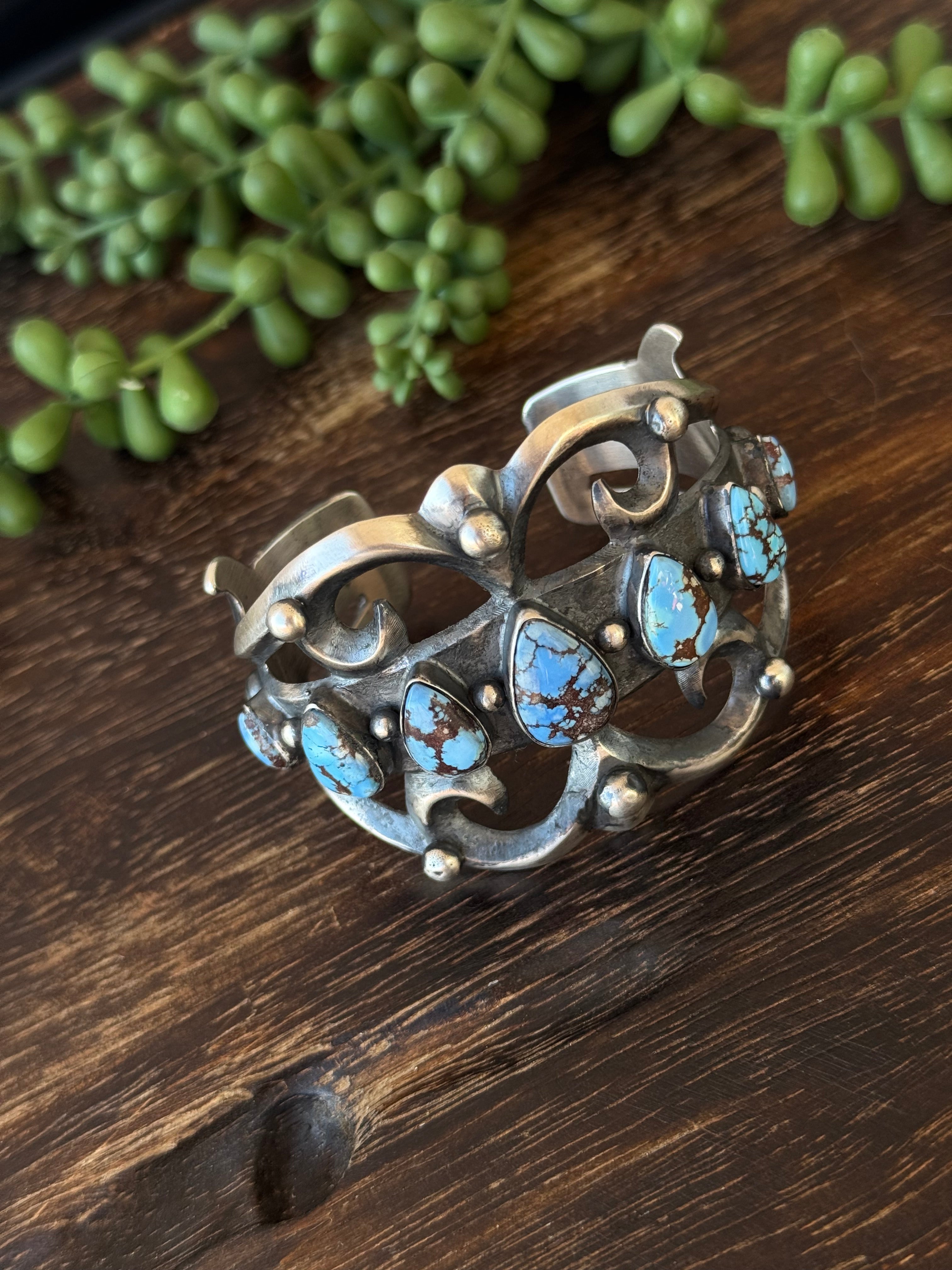 Chimney Butte Golden Hills Turquoise & Sterling Silver Cuff Bracelet. It measures 2 inches wide with an inside circumference of 5 3/8 inches and a gap of 7/8 of an inch. Signed by the artist and stamped sterling silver.