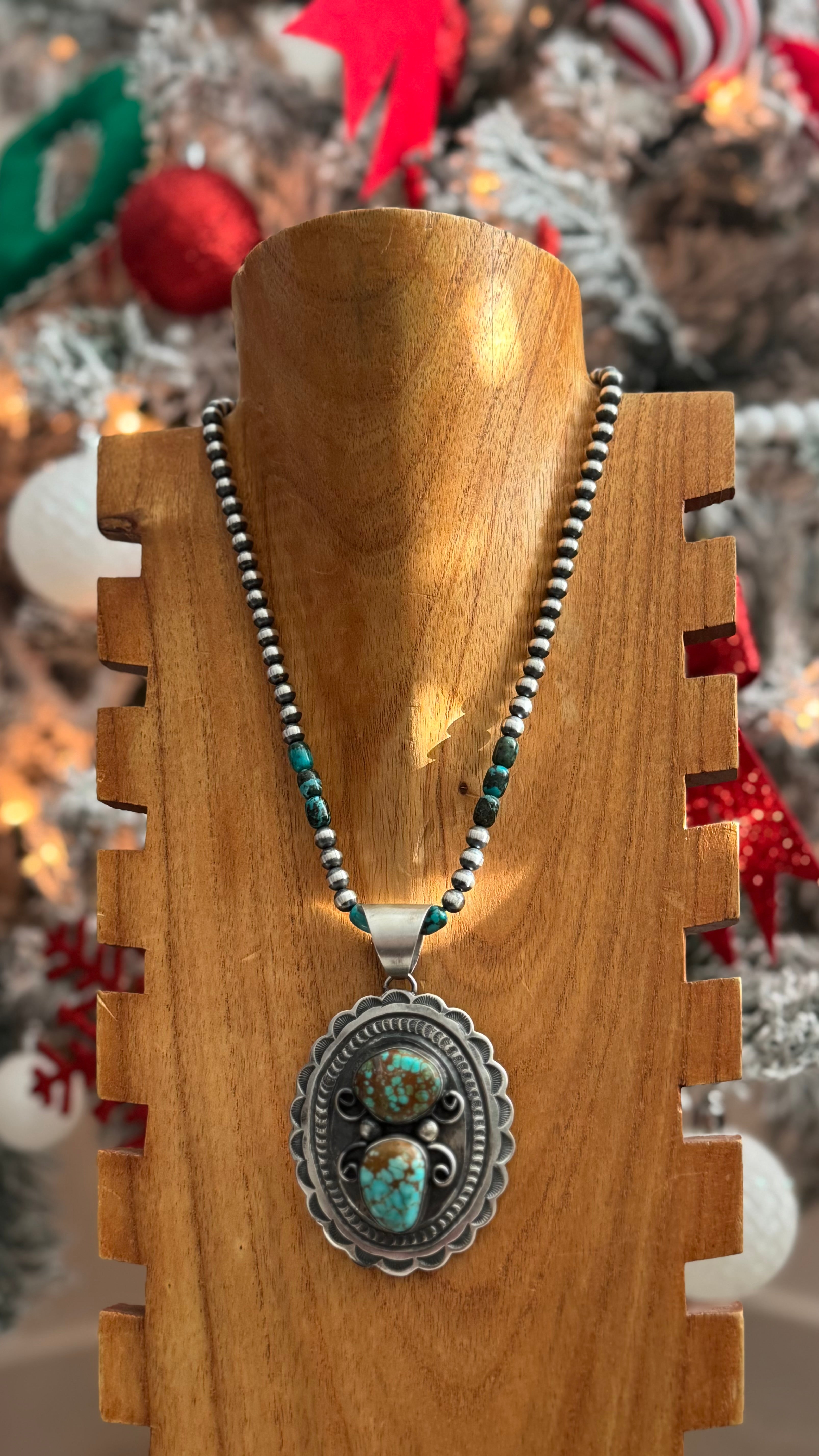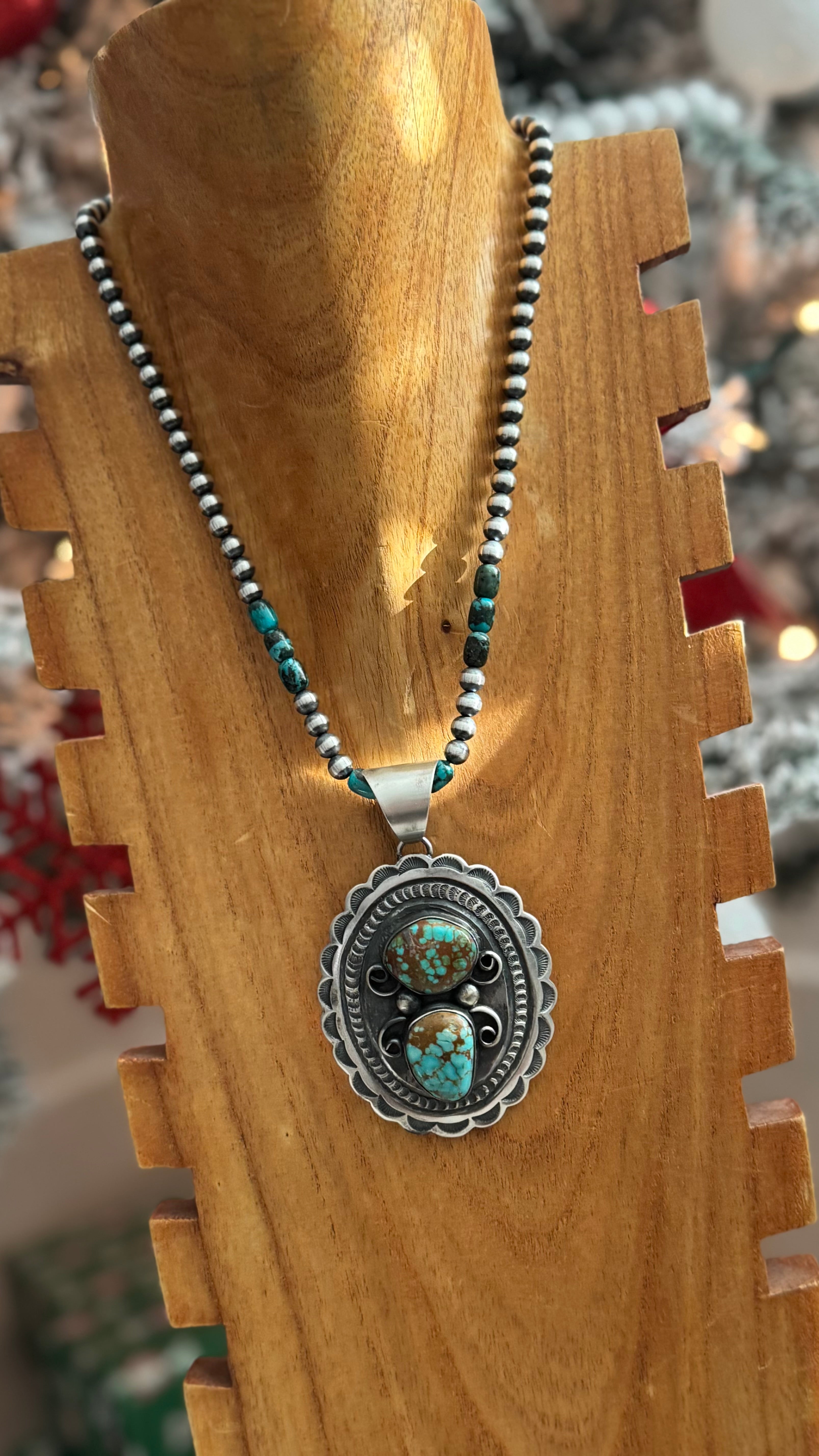 Chimney Butte #8 Turquoise & Sterling Silver Concho Pendant. It measures 3 1/2 inches long and 2 1/8 inches wide. Pendant Only. Signed by the artist and stamped sterling silver.