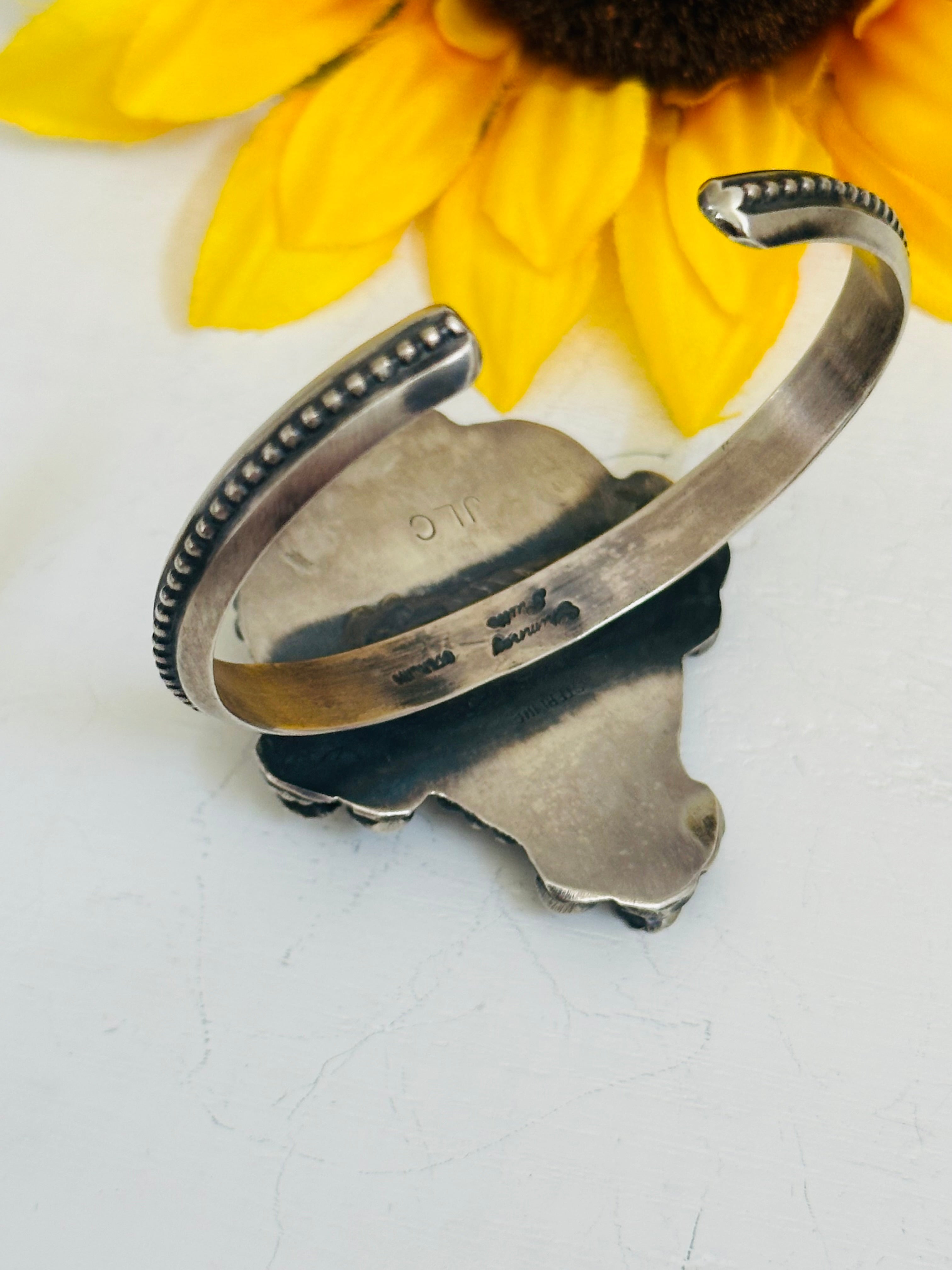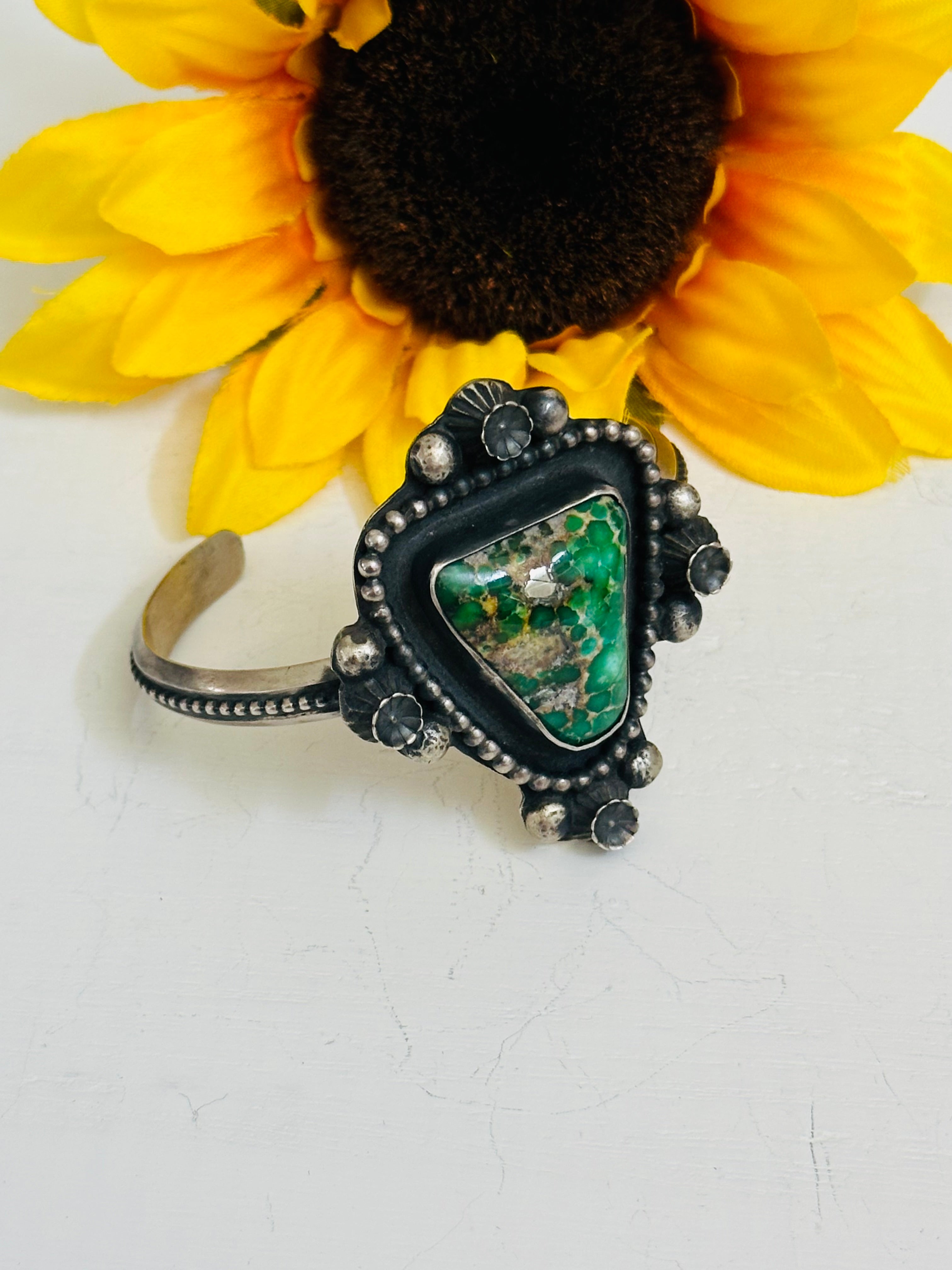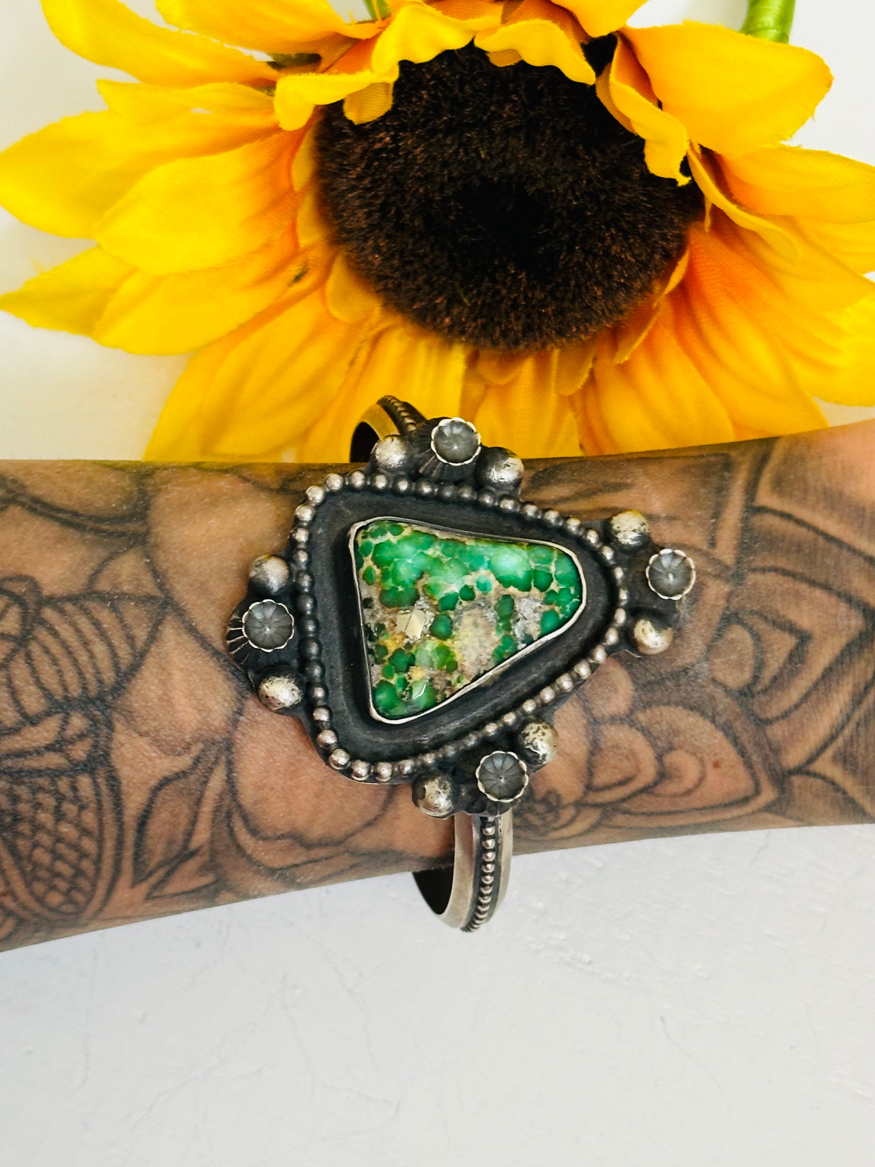 Chimney Butte Sonoran Gold Turquoise & Sterling Silver Cuff Bracelet. It measures 2 1/8 inches wide with an inside circumference of 5 3/4 inches and a gap of 3/4 of an inch. Signed by the artist and stamped sterling silver.