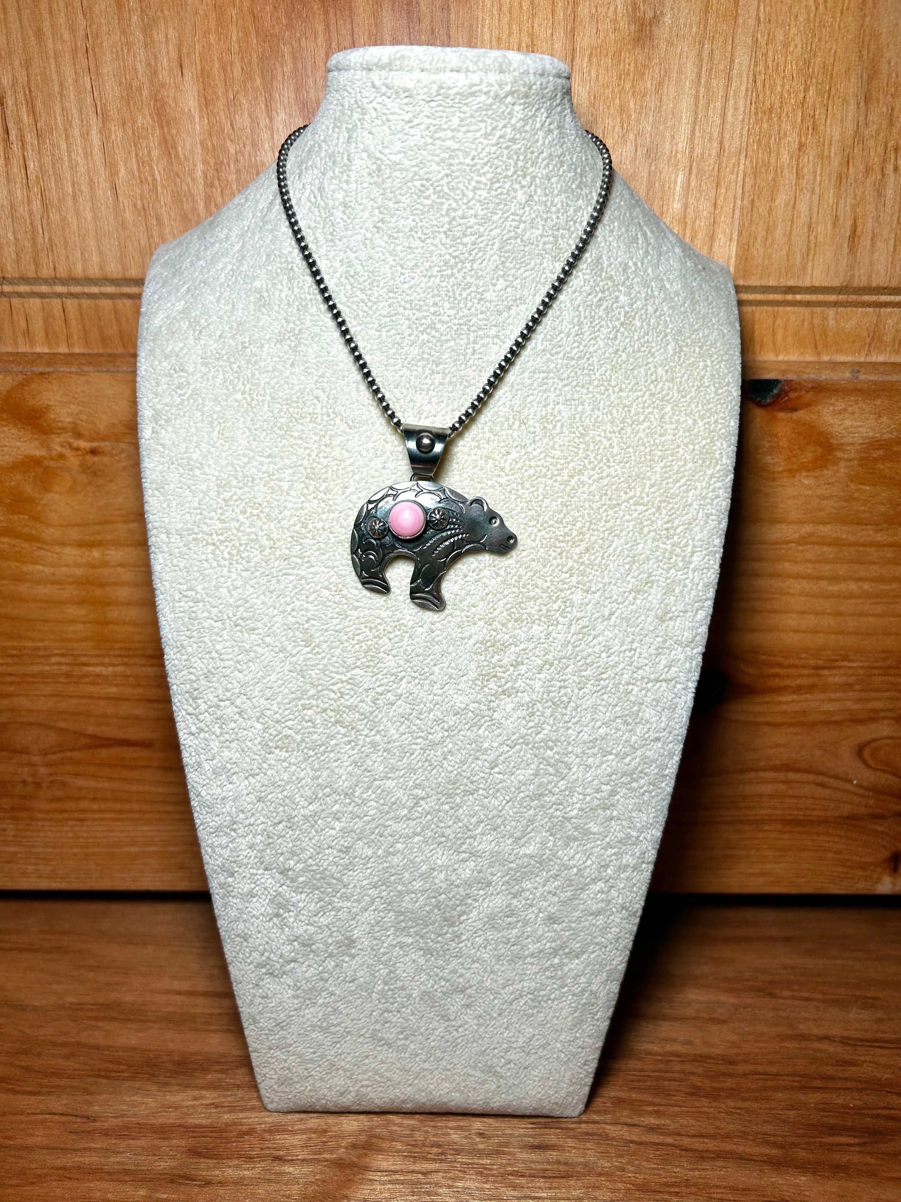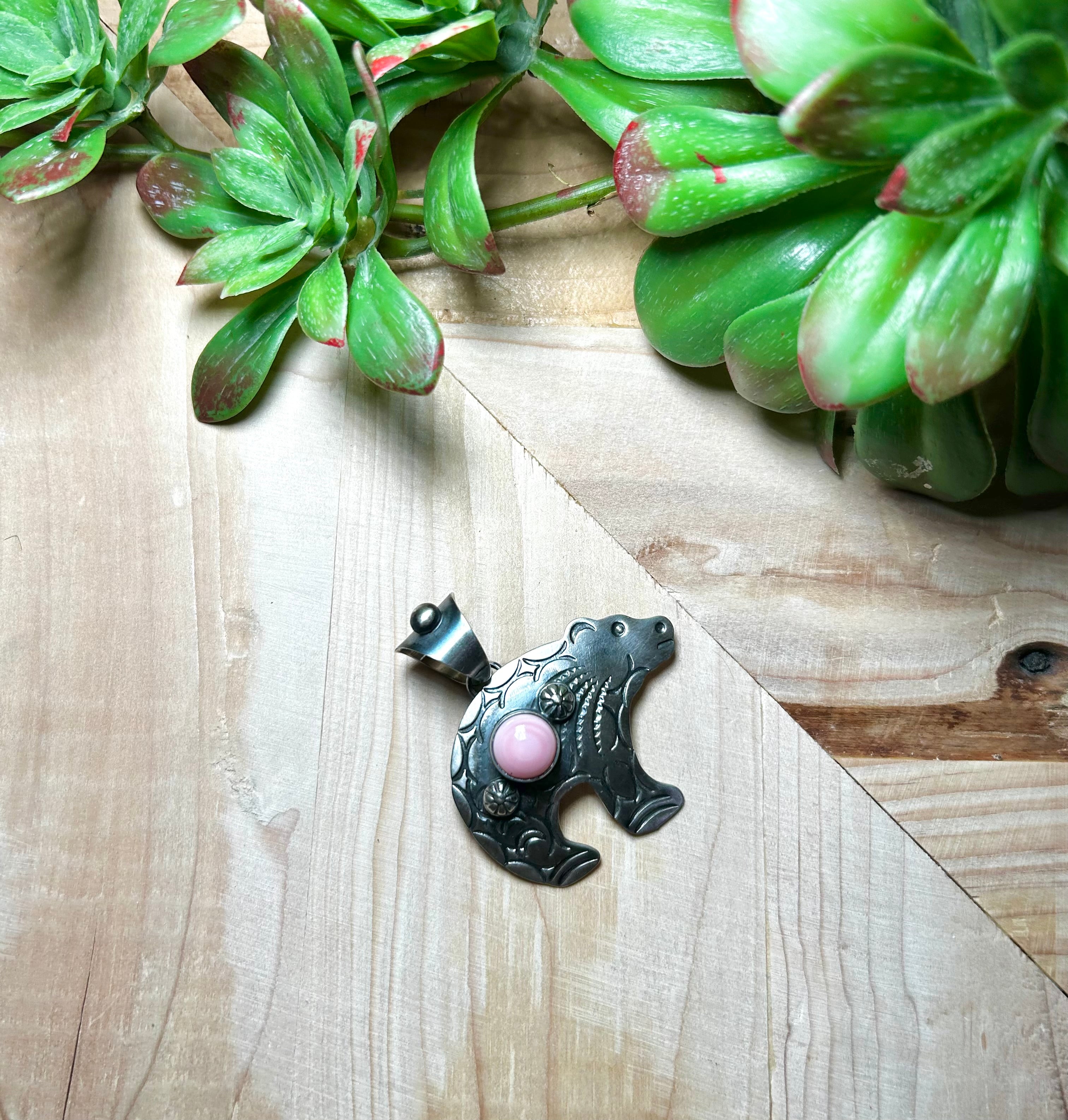 Chimney Butte Sterling Pink Conch & Silver Pendant. It measures 2 inches long and 1 7/8 inches wide. Pendant Only!! Signed by the artist and stamped sterling silver.