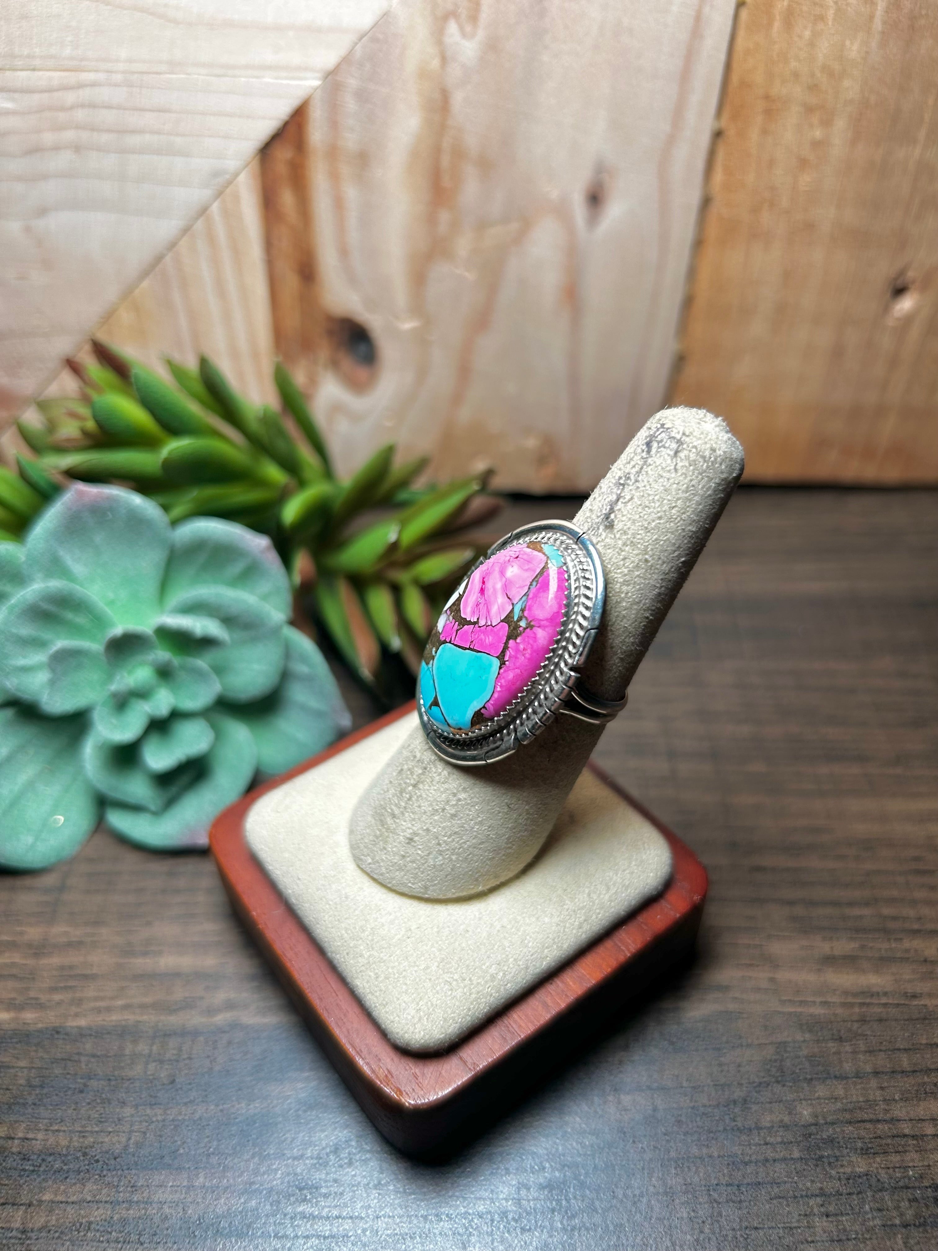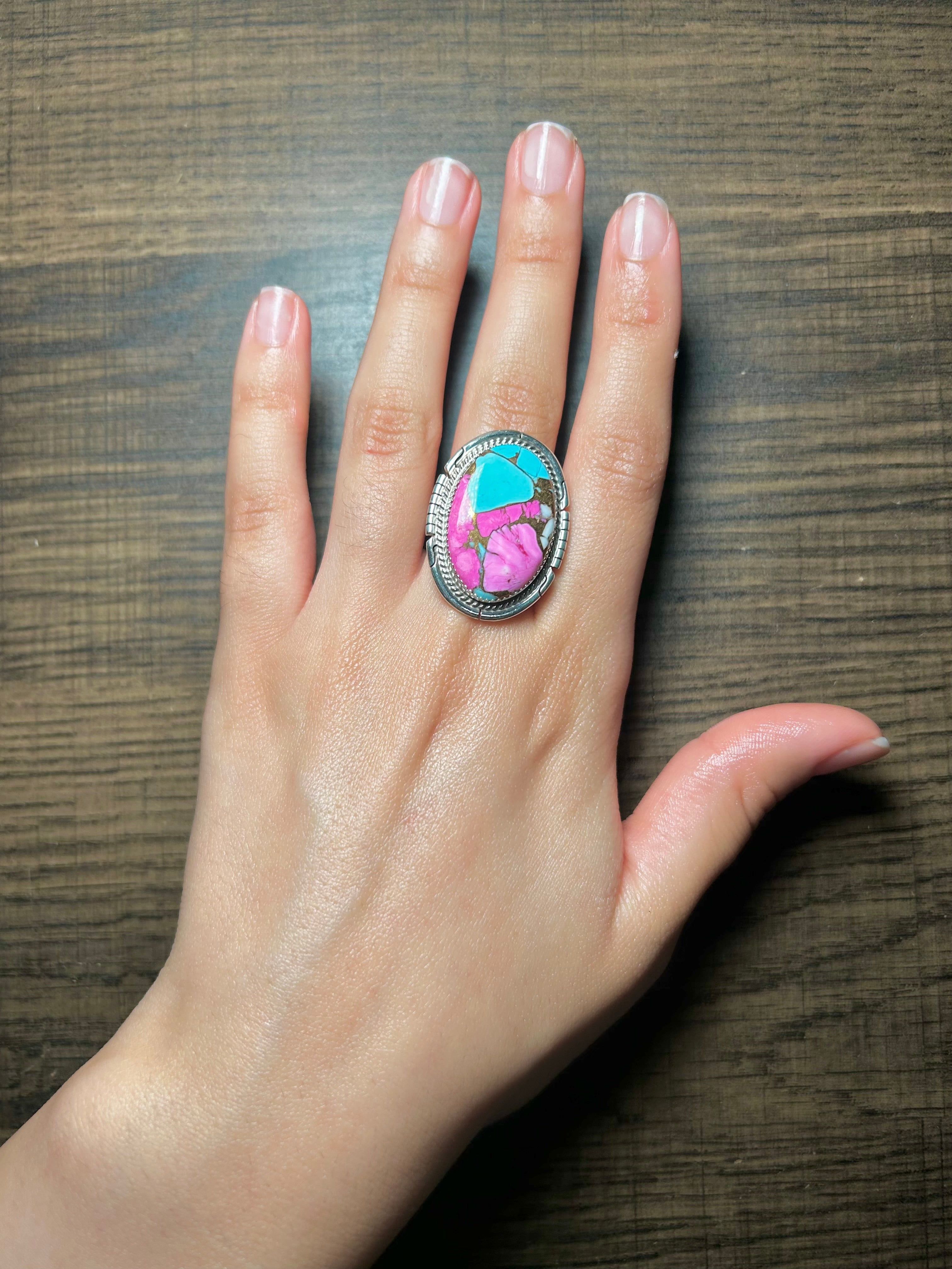Dane Skeets Cotton Candy Dahlia & Sterling Silver Ring Size 7. It measures 1 1/4 inches long and 7/8 of an inch wide.