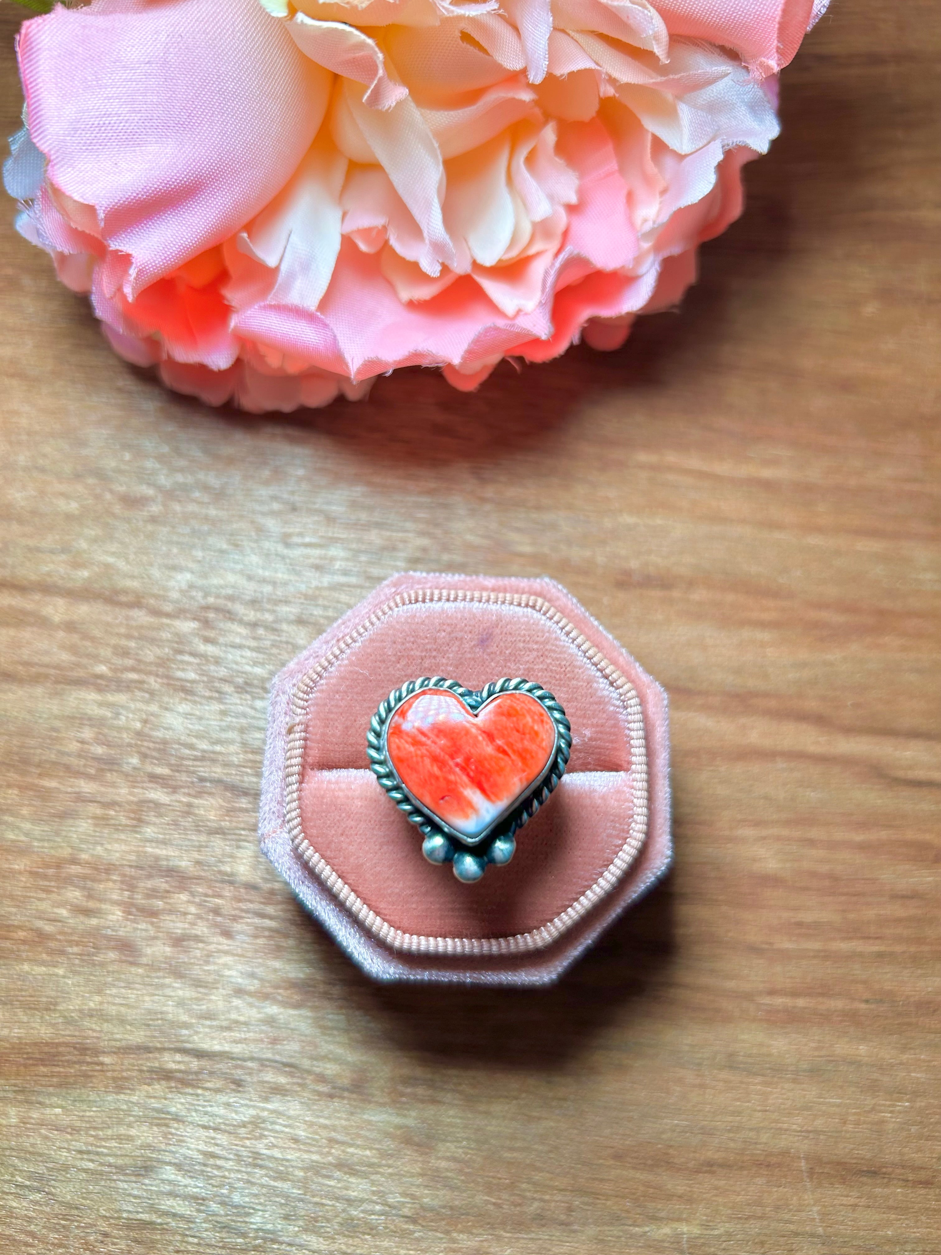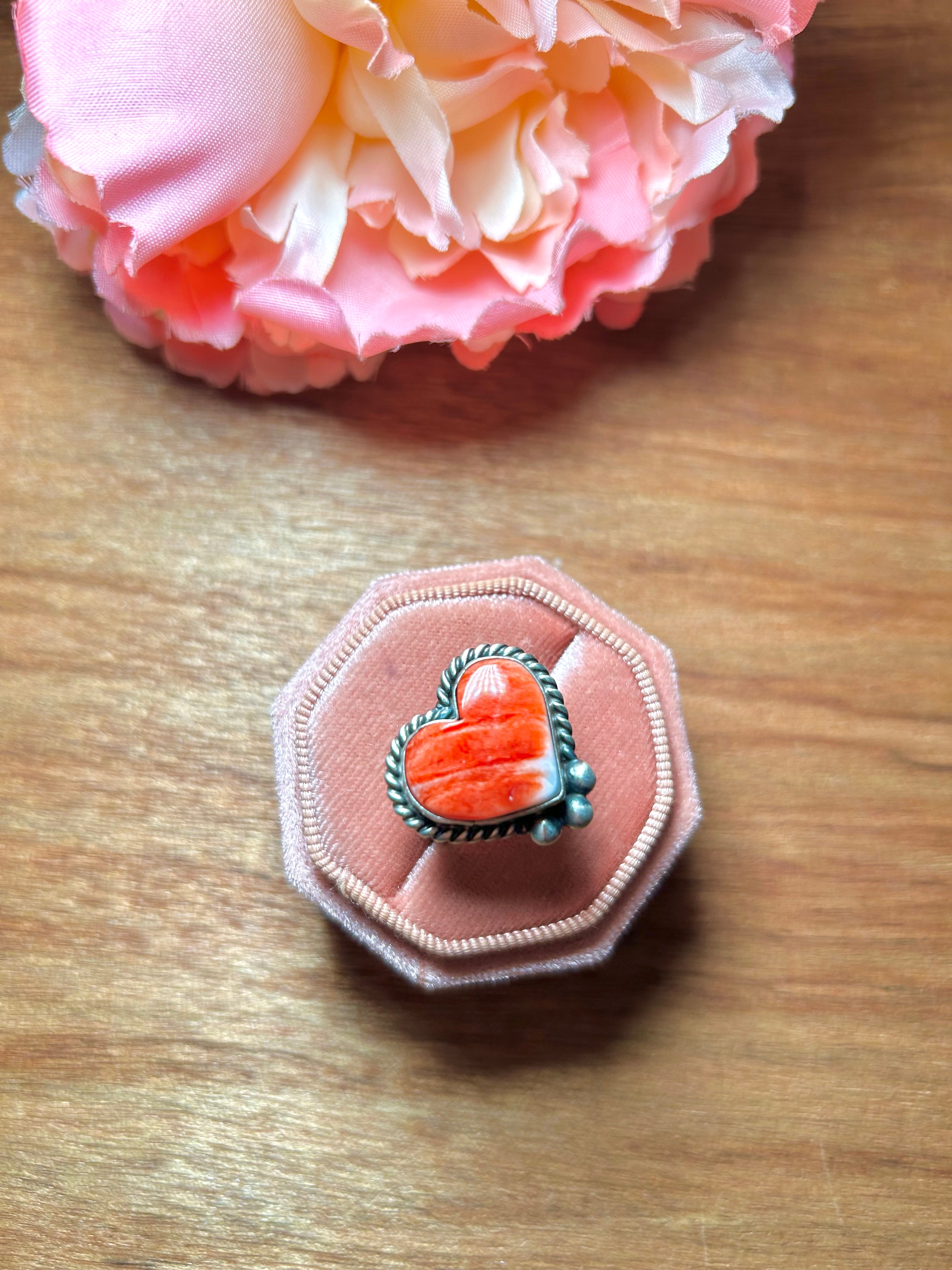 Navajo Made Spiny Oyster & Sterling Silver Adjustable Ring. It measures 7/8 of an inch long and 7/8 of an inch wide. Stamped sterling silver and signed.