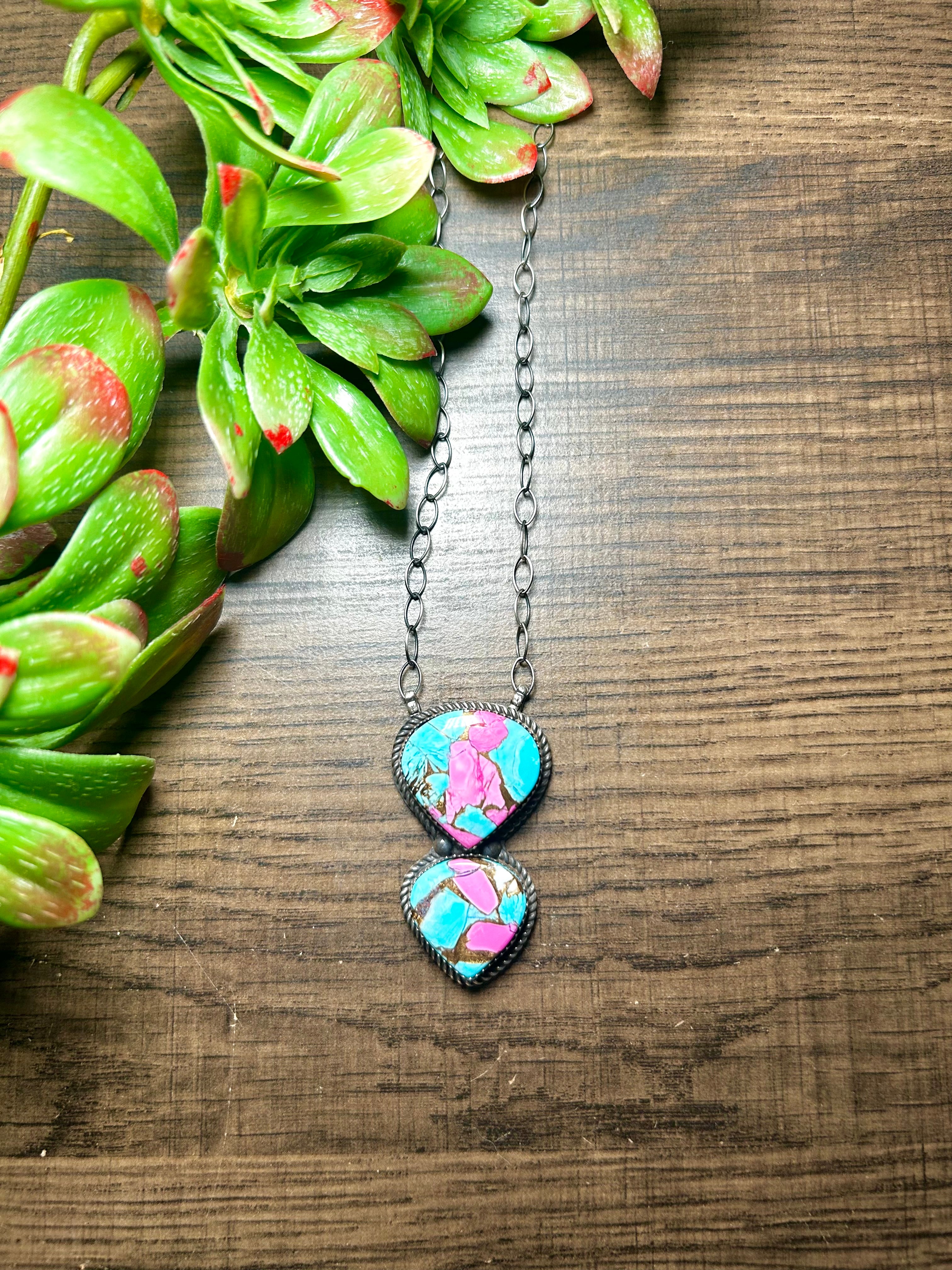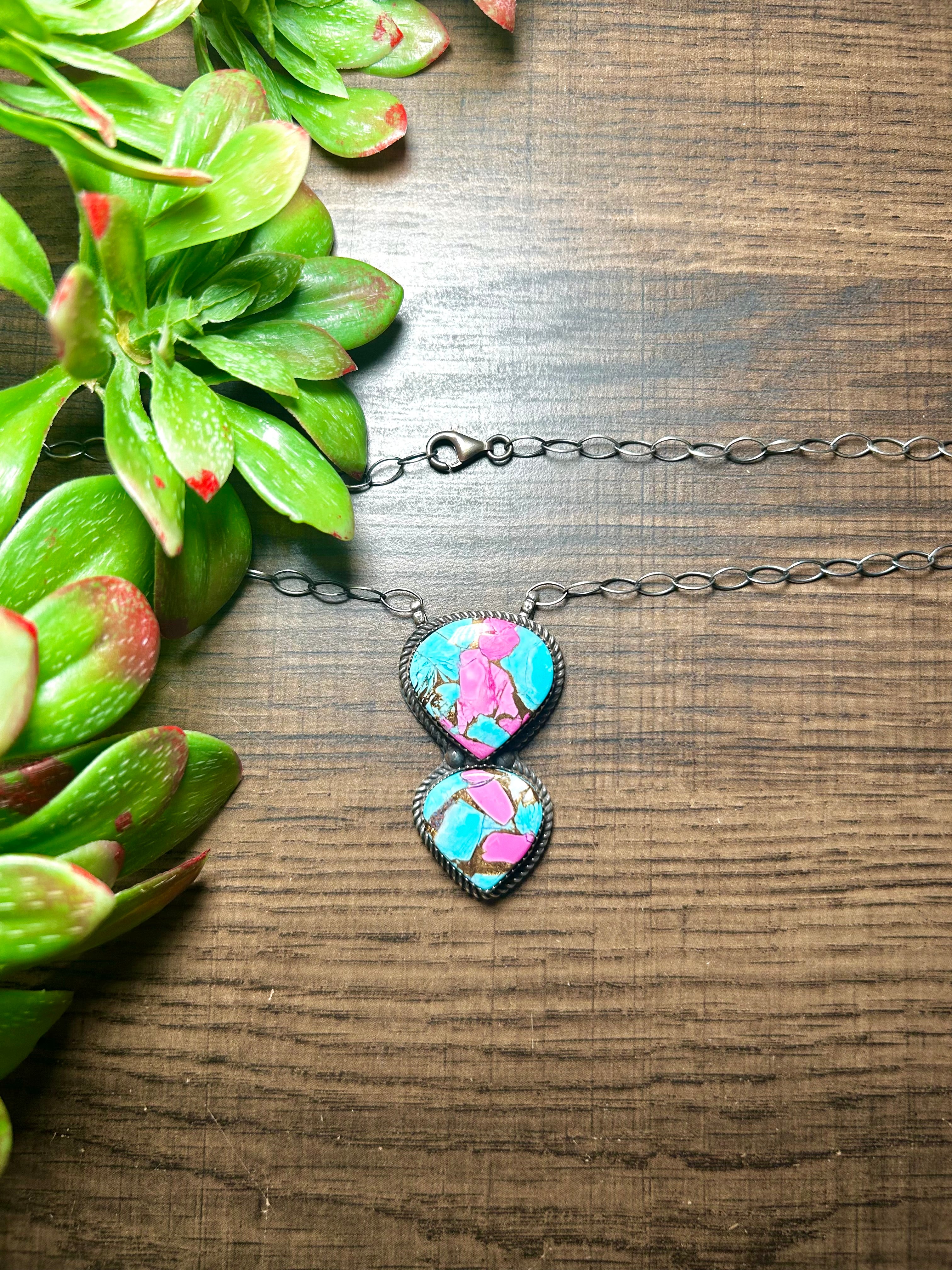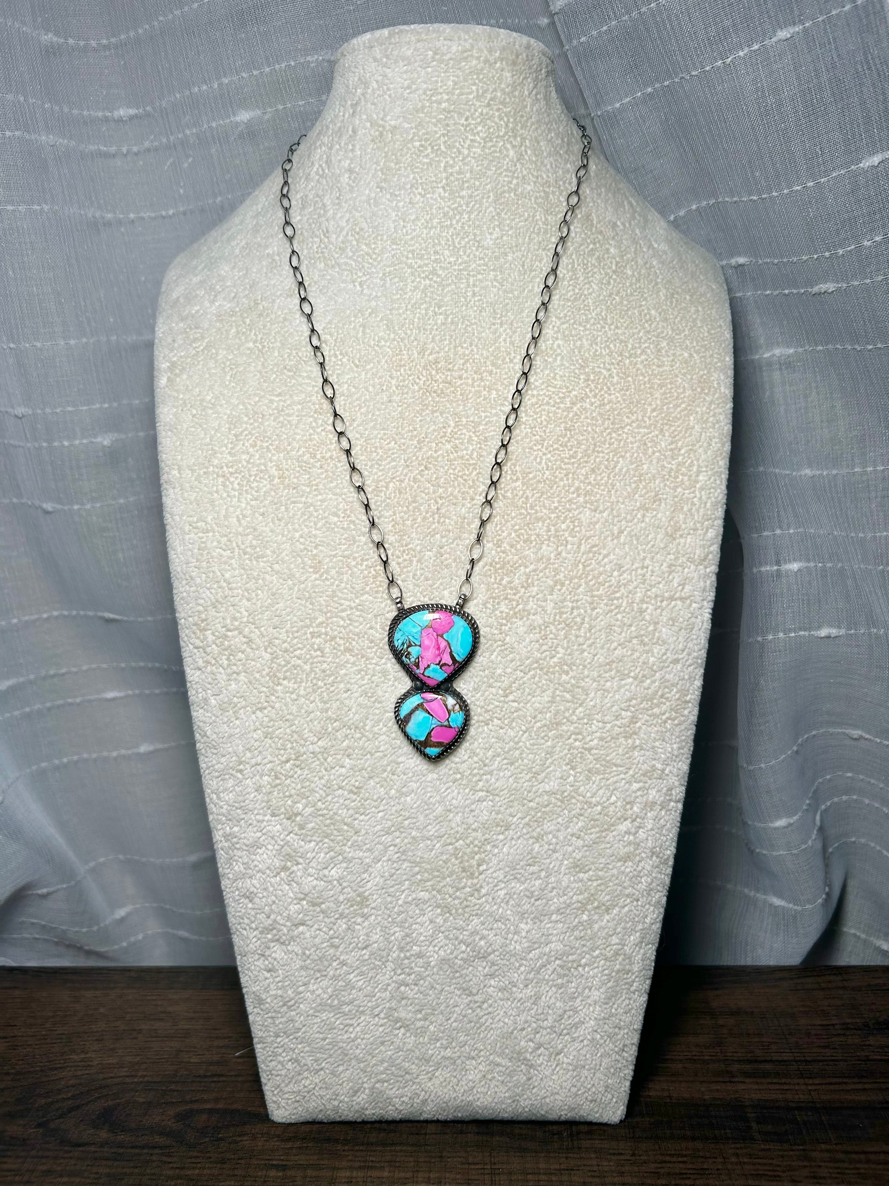 Tia Long Cotton Candy & Sterling Silver Necklace. The necklaces measures 22 inches long while the chain by itself measures 18 inches long. Signed by the artist and stamped sterling silver. Stones will vary due to natural stones.