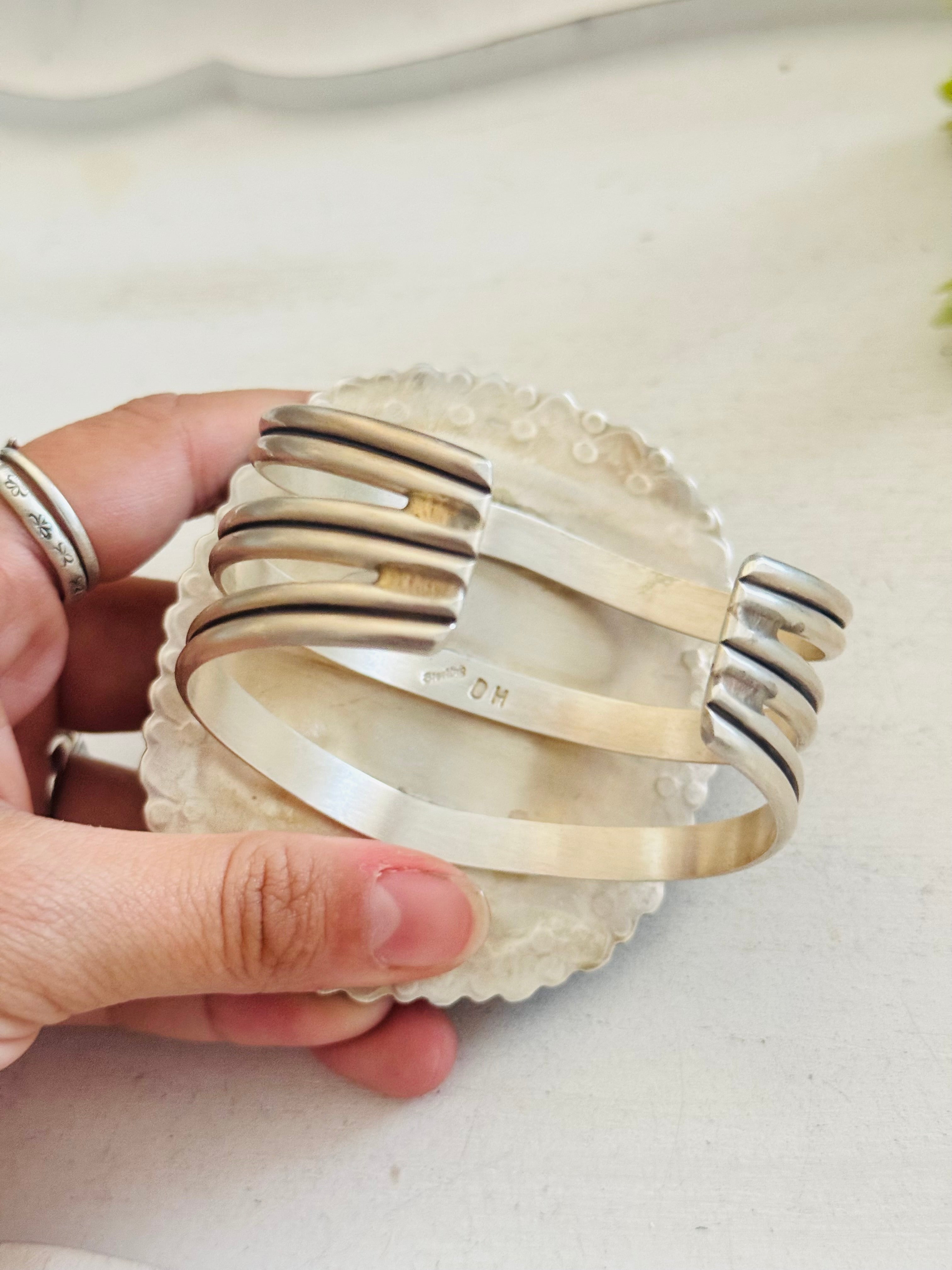 Danny Henio #8 Turquoise & Sterling Silver Cuff Bracelet. It measures 3 1/4 inches wide with an inside circumference of 6 1/8 inches and a gap of 1 inch. Stamped sterling silver and signed by the artist.