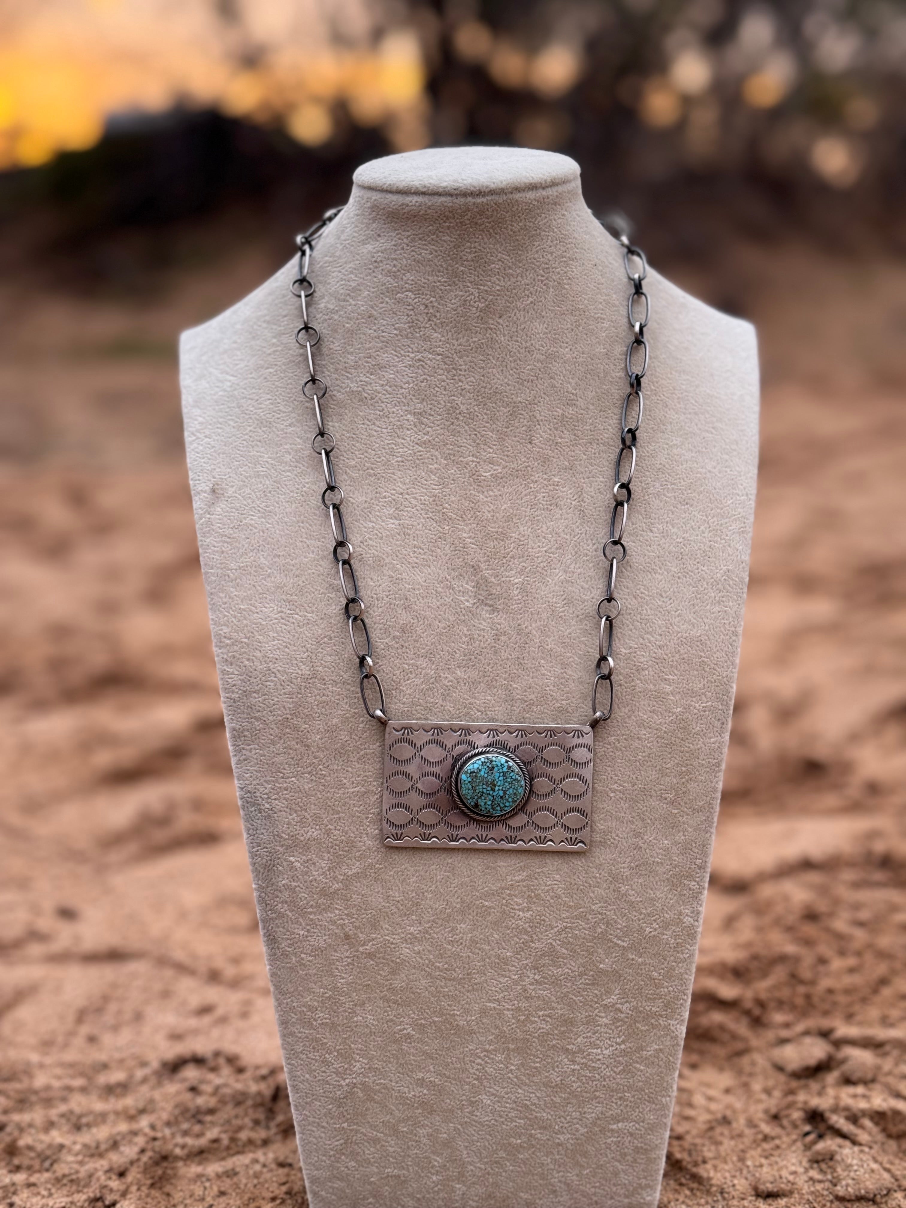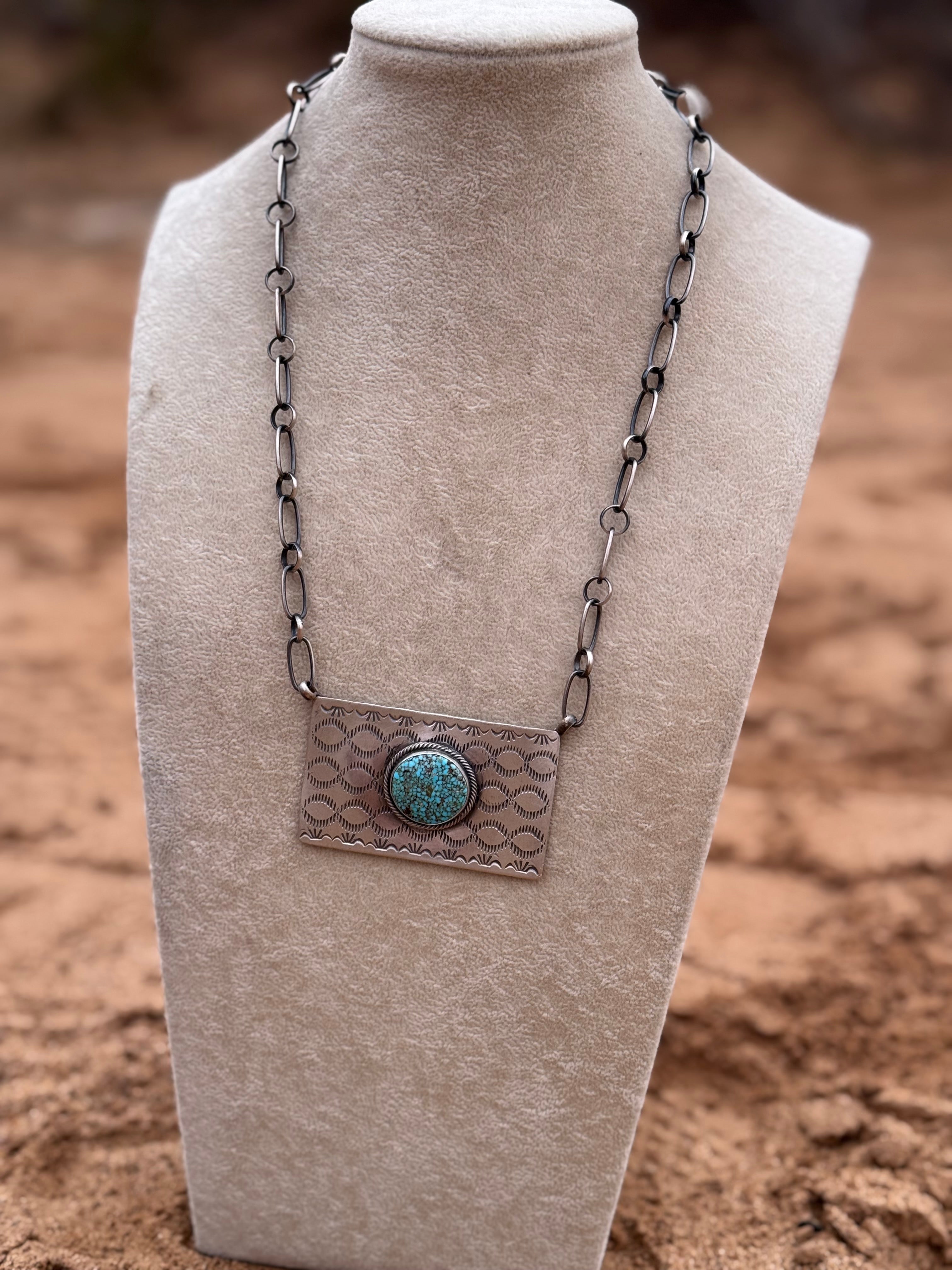 Danny Henio Kingman Spiderweb Turquoise & Sterling Silver Bar Necklace. It measures 21 inches long with hang while the chain measures 18 inches long. Signed by the artist and stamped sterling silver.
