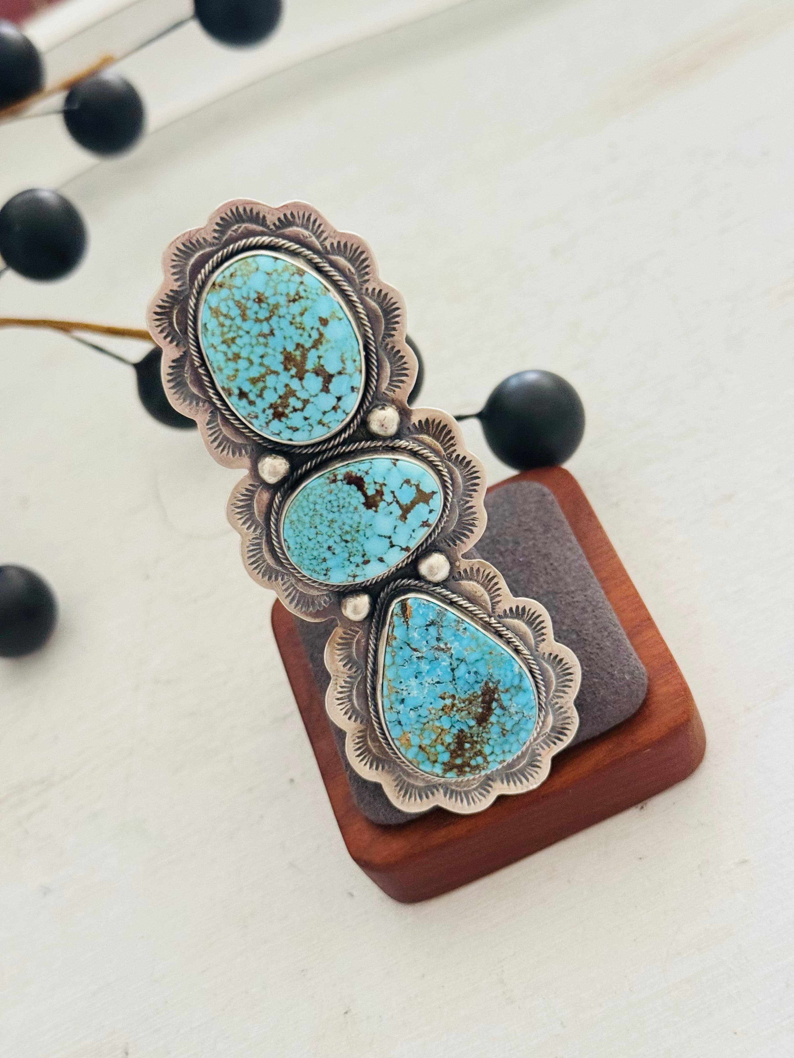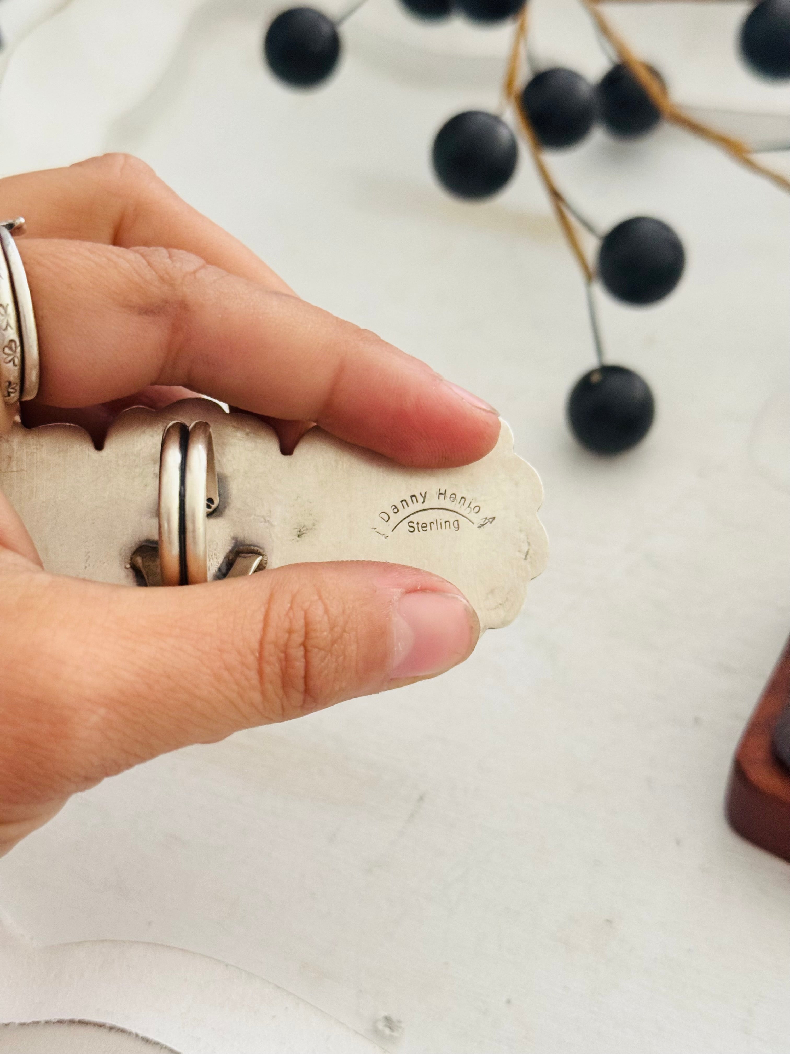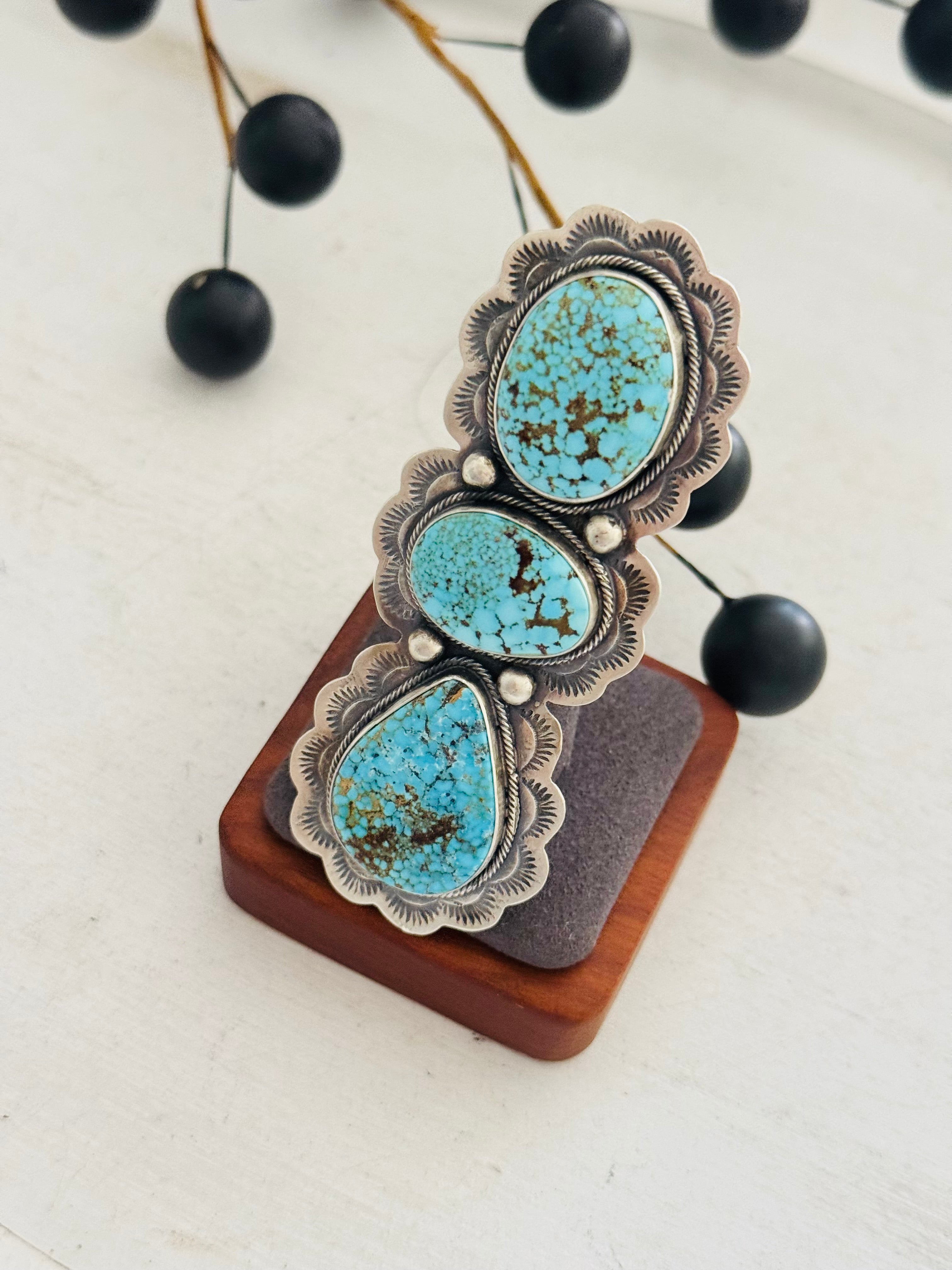Danny Henio High Grade Kingman Turquoise & Sterling Silver Adjustable Ring. It measures 3 3/8 inch long and 1 3/8 inches wide. Signed by the artist and stamped sterling silver.