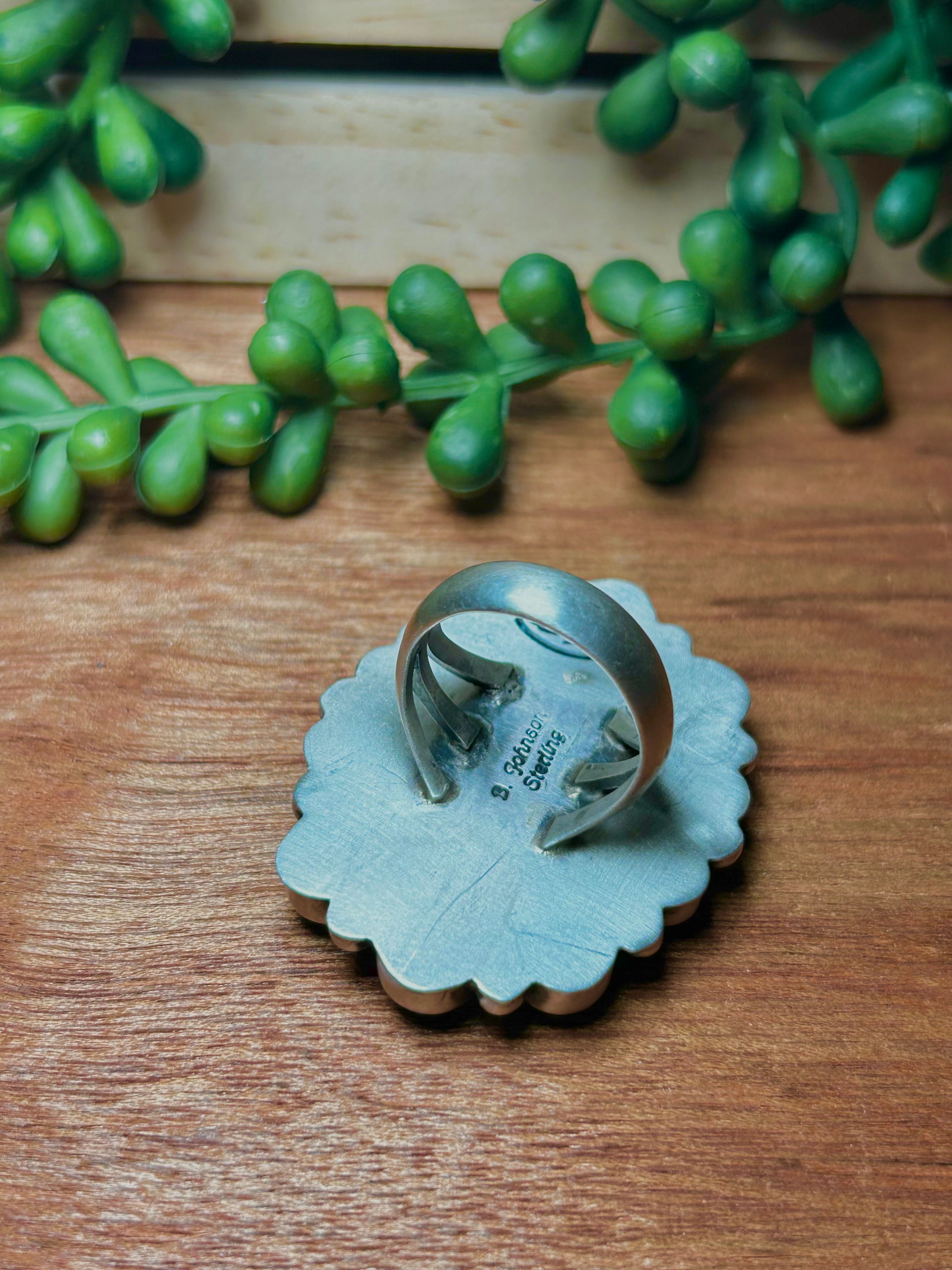 Bobby Johnson Lapis & Sterling Silver Ring Size 10. It measures 1 5/8 inches long and 1 3/8 inches wide. Signed by the artist and stamped sterling silver.