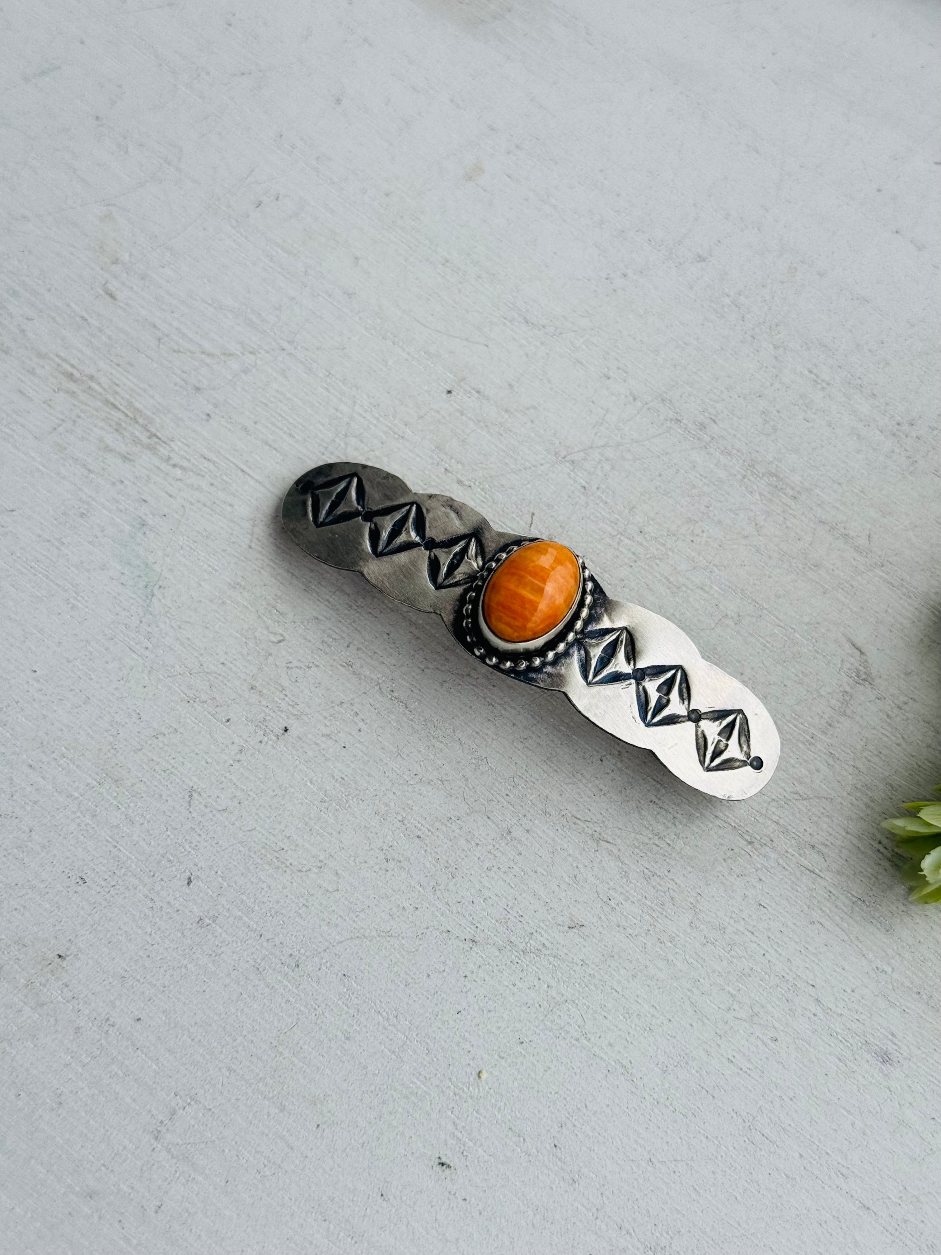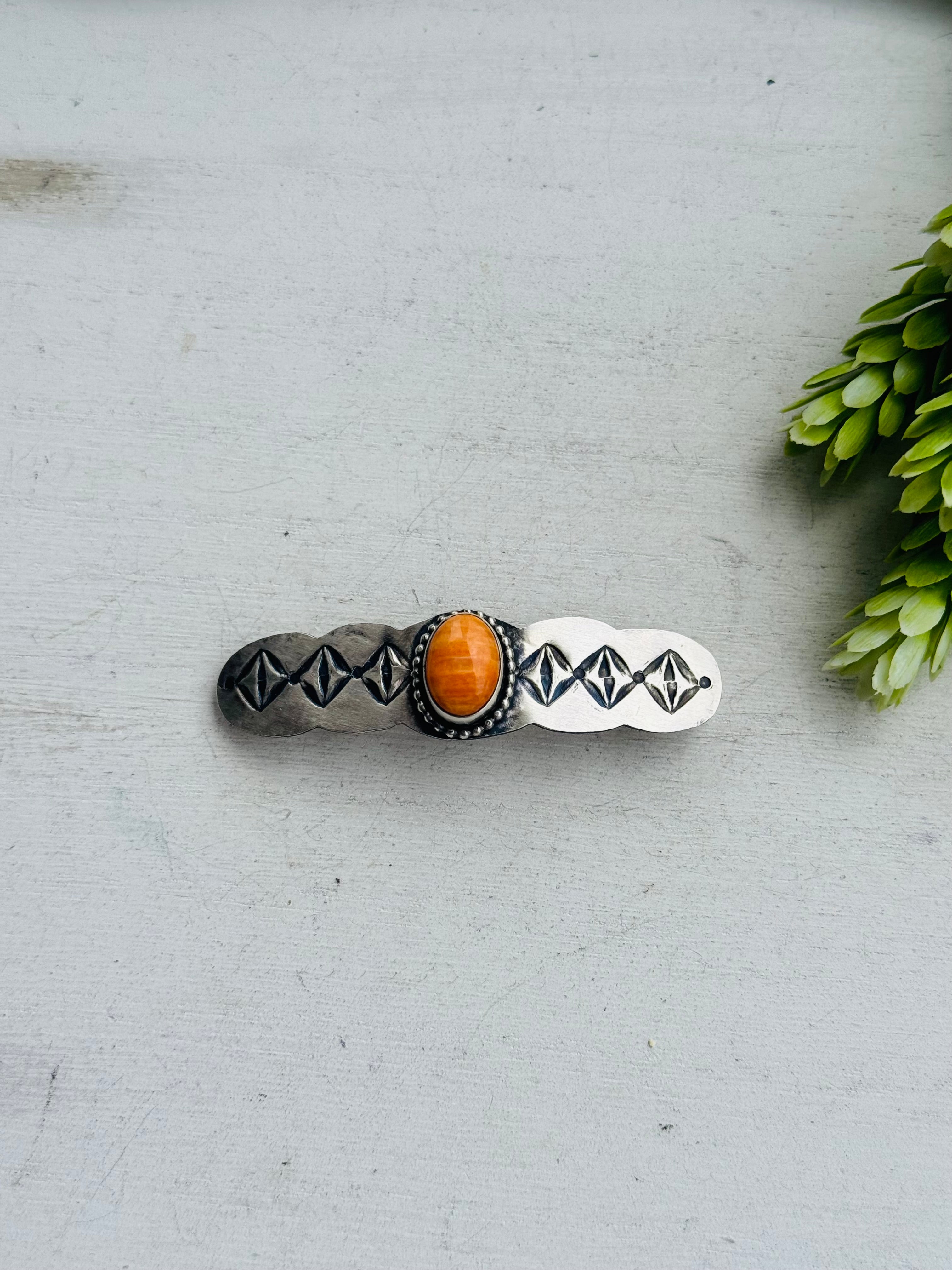 Danny Henio Spiny Oyster & Sterling Silver Hair Barrette. It measures 7/8 of an inch long and 3 inches wide. Signed and stamped.