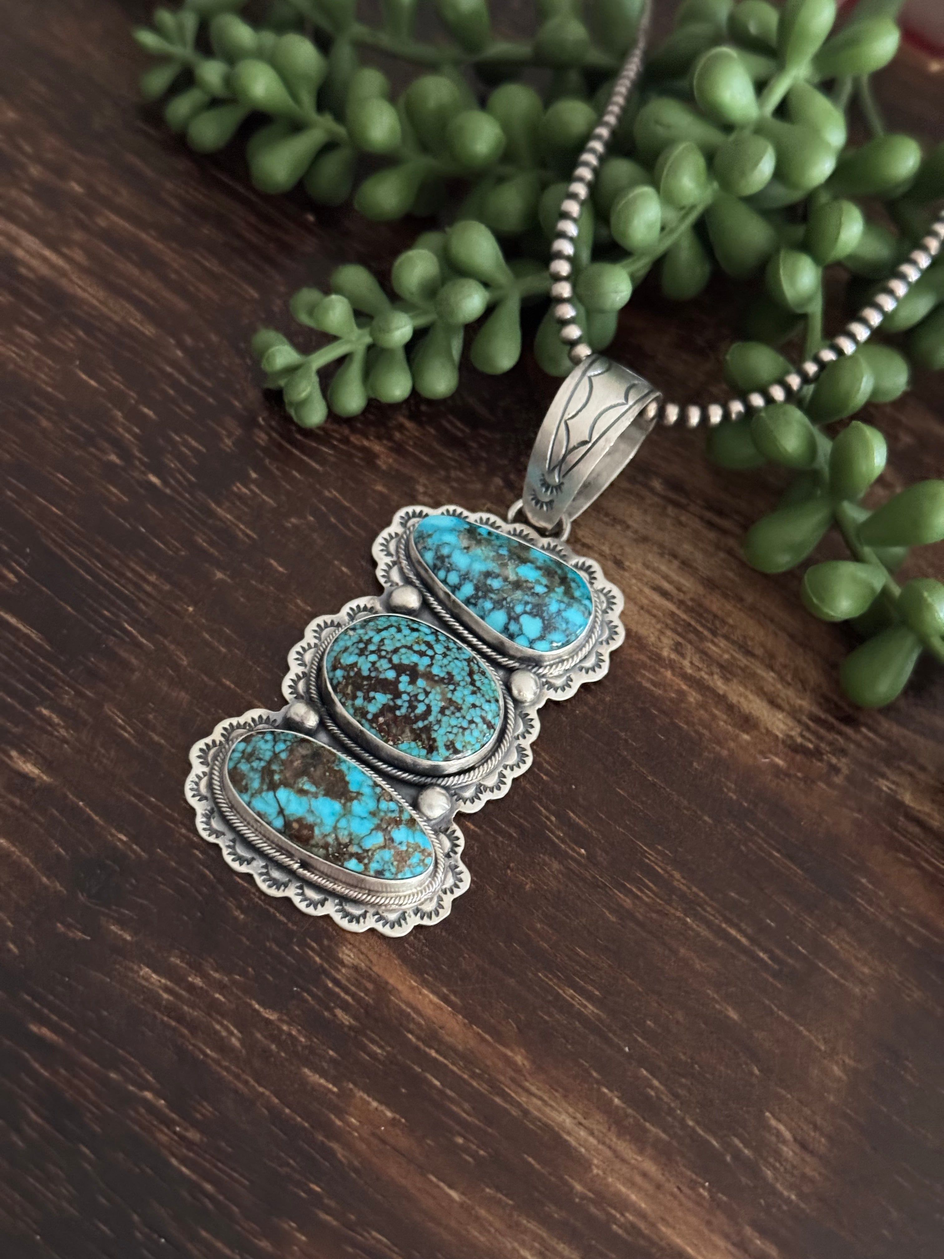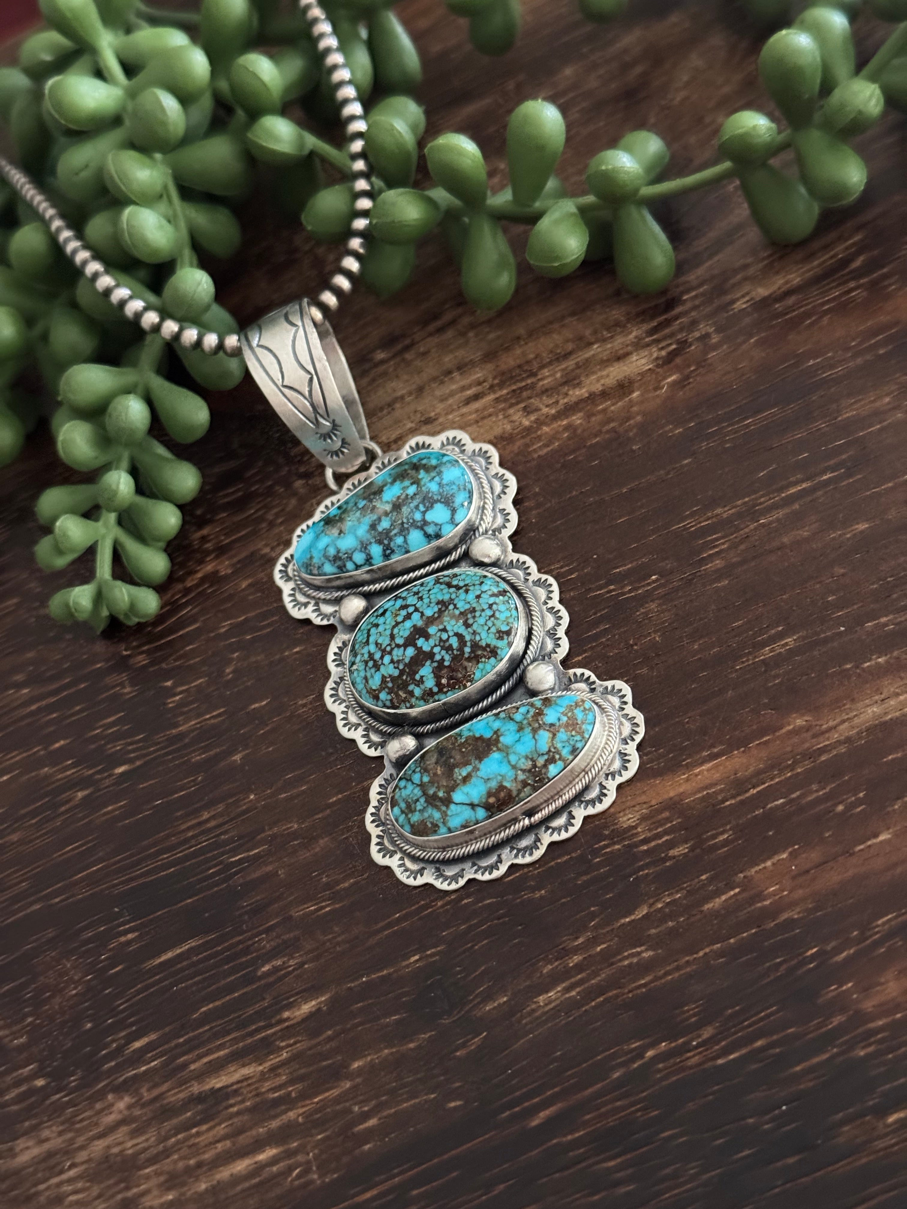 Danny Henio Kingman Turquoise & Sterling Silver Pendant. It measures 3 1/2 inches long and 1 3/8 inches wide. Pendant Only. Signed by the artist and stamped sterling silver.