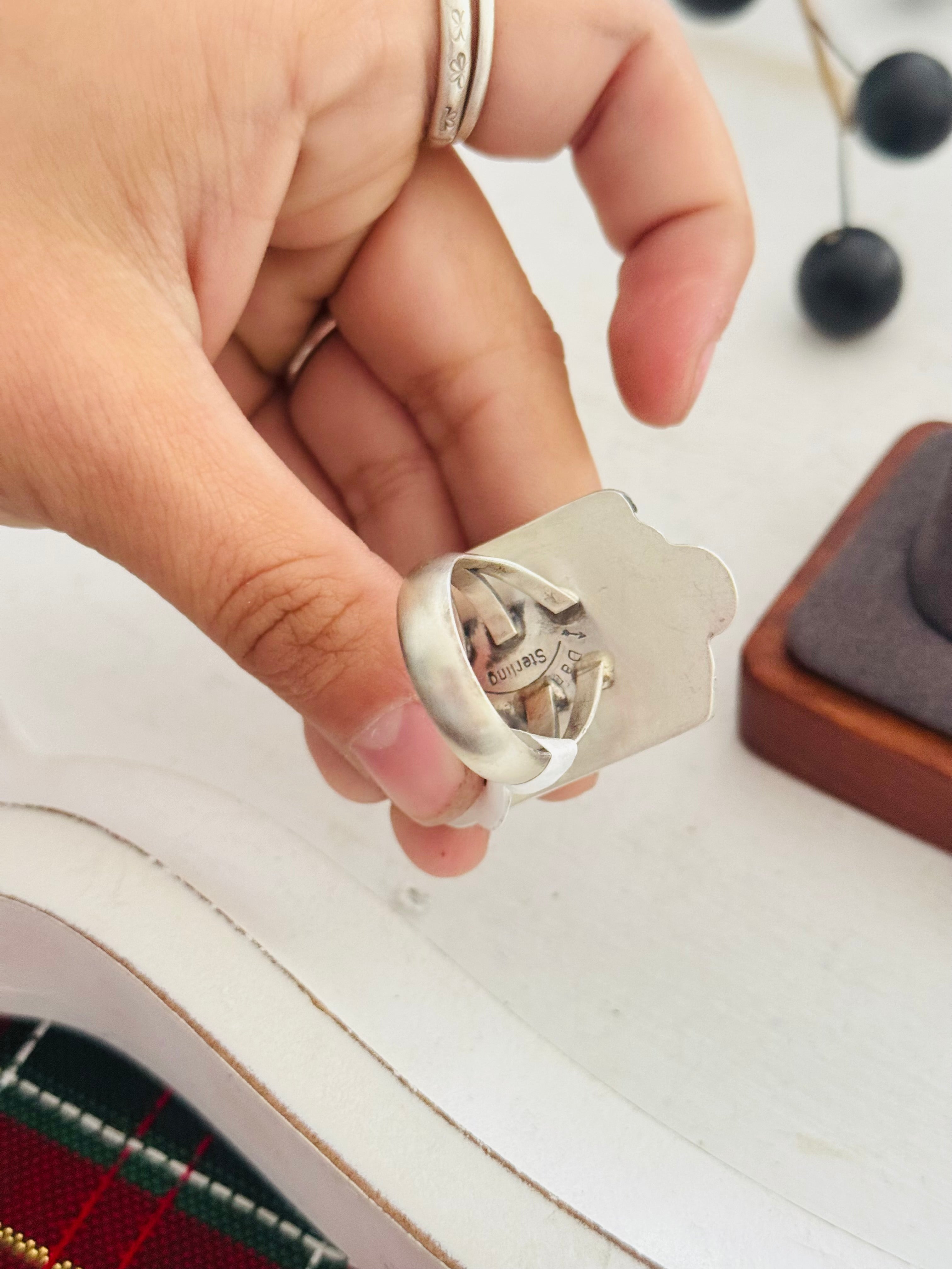 Danny Henio Kingman Turquoise & Sterling Silver Ring Size 8.5. It measures 1 5/8 inch long and 1 inch wide. Signed by the artist and stamped sterling silver.