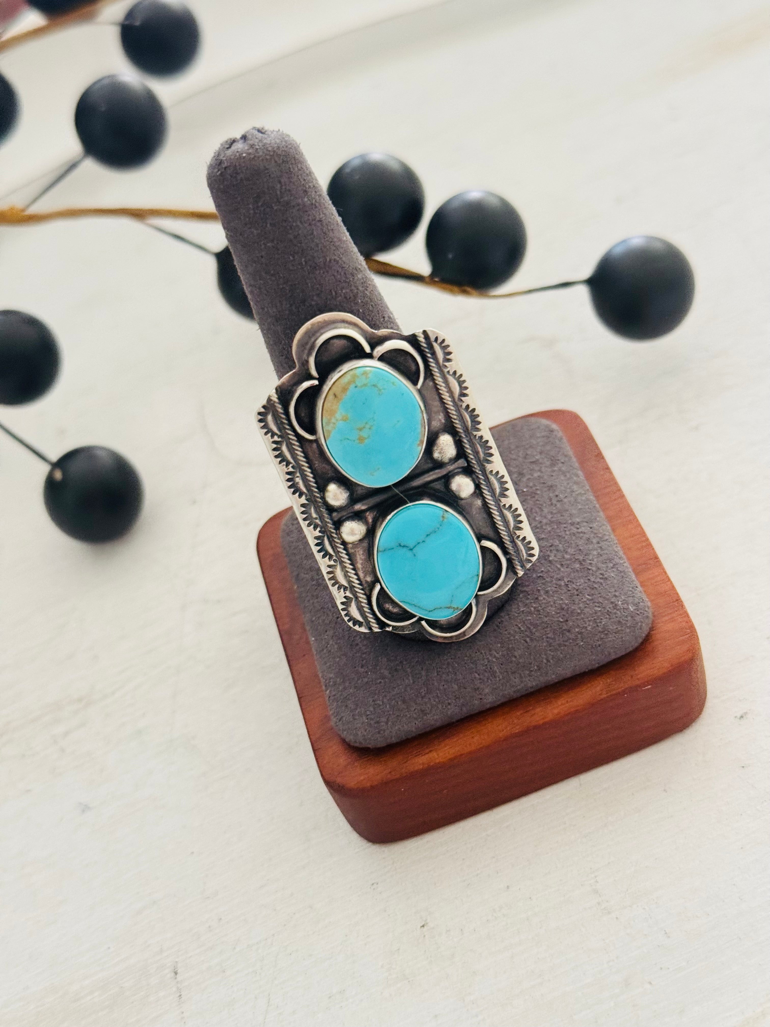 Danny Henio Kingman Turquoise & Sterling Silver Ring Size 10.25. It measures 1 3/4 inch long and just over 1 inch wide. Signed by the artist and stamped sterling silver.