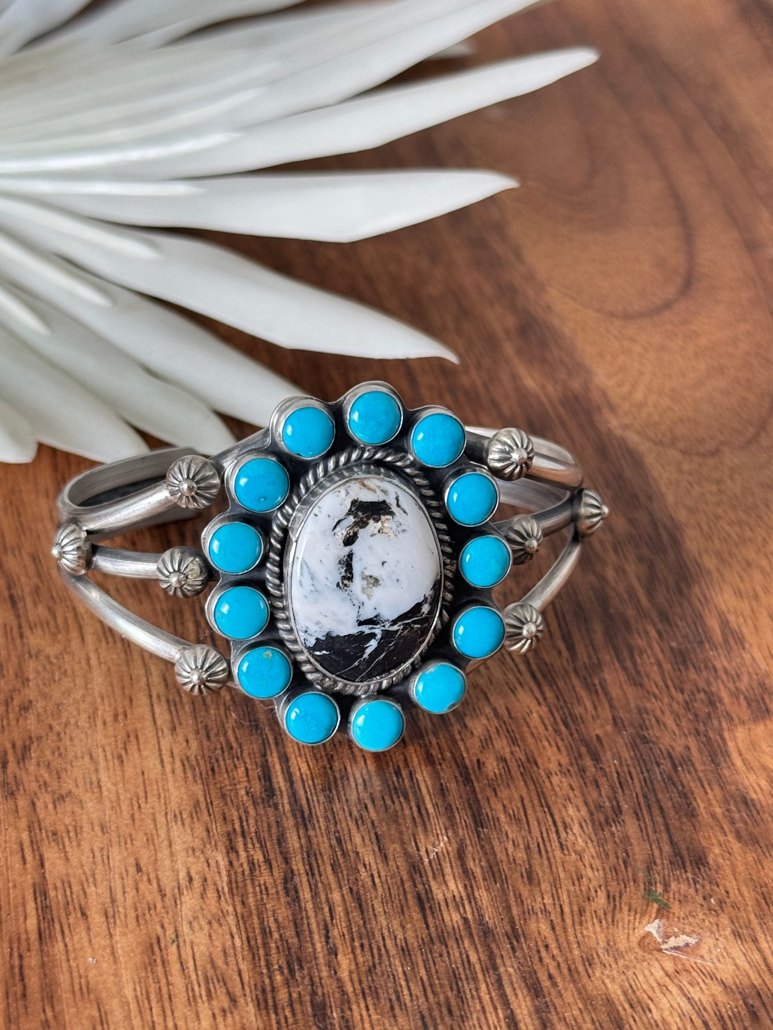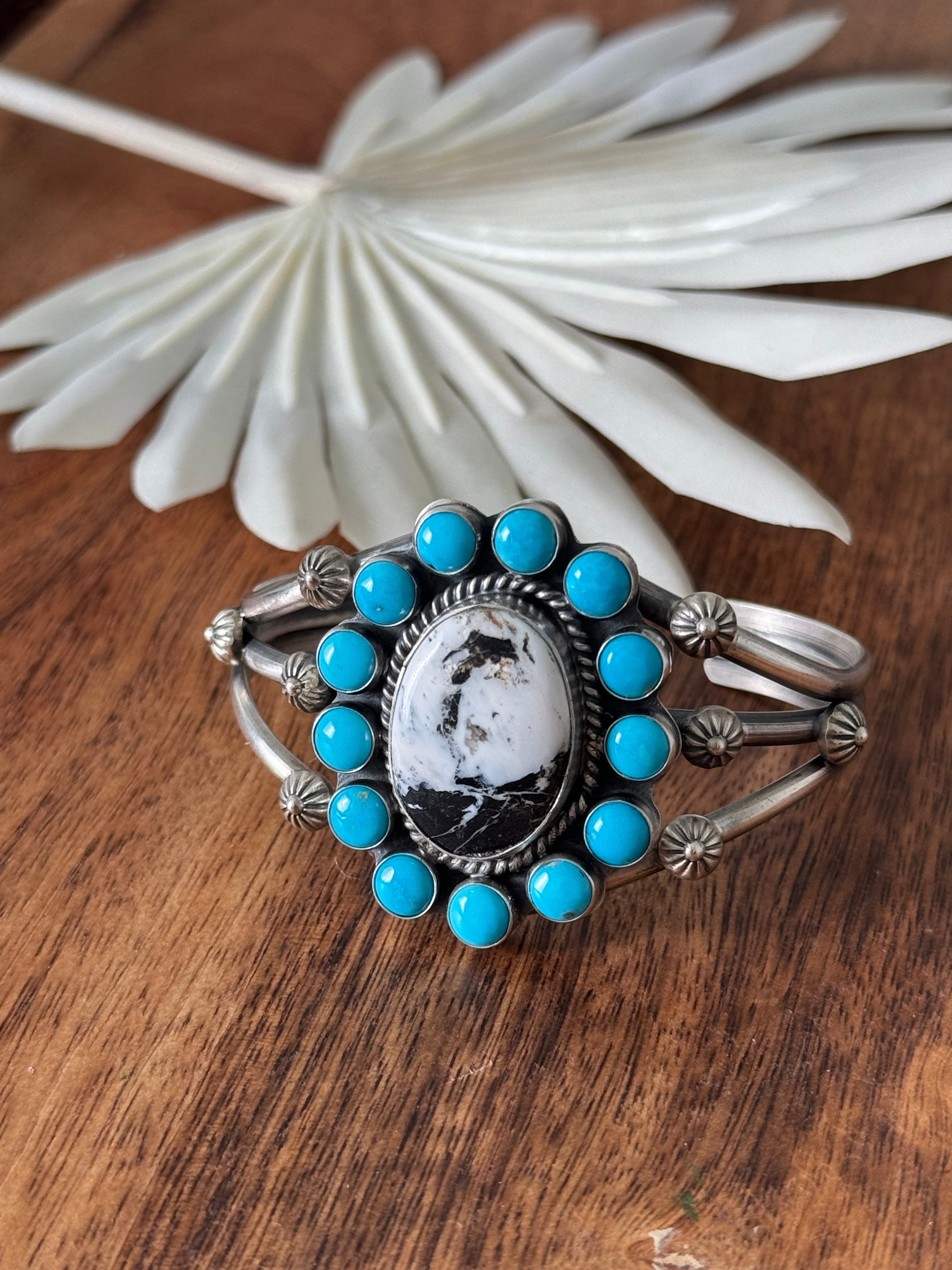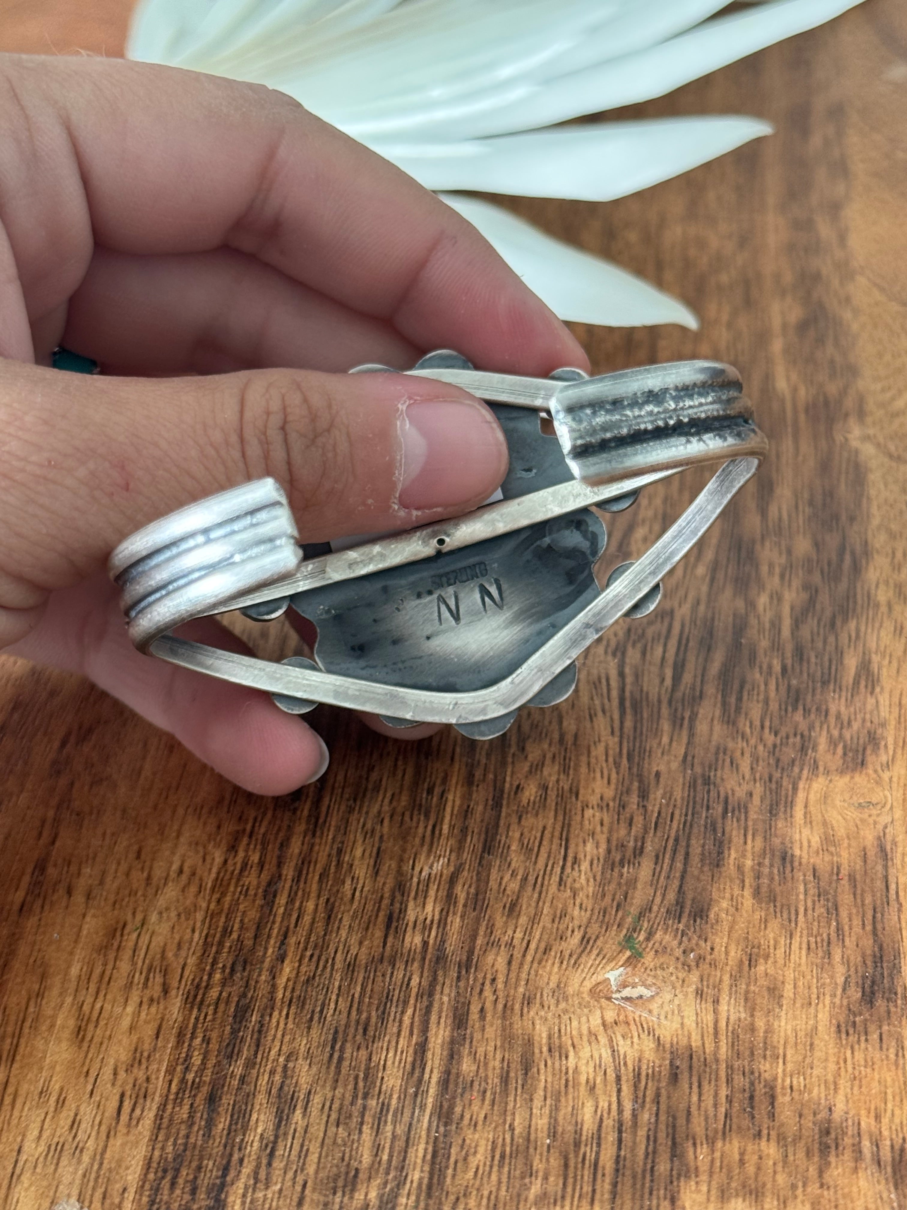 Ned Nez Multi Stone & Sterling Silver Cuff Bracelet. It measures 1 3/4 inches wide with an inside circumference of 5 5/8 inches and a gap of 1 inch. Signed by artist and stamped sterling silver.