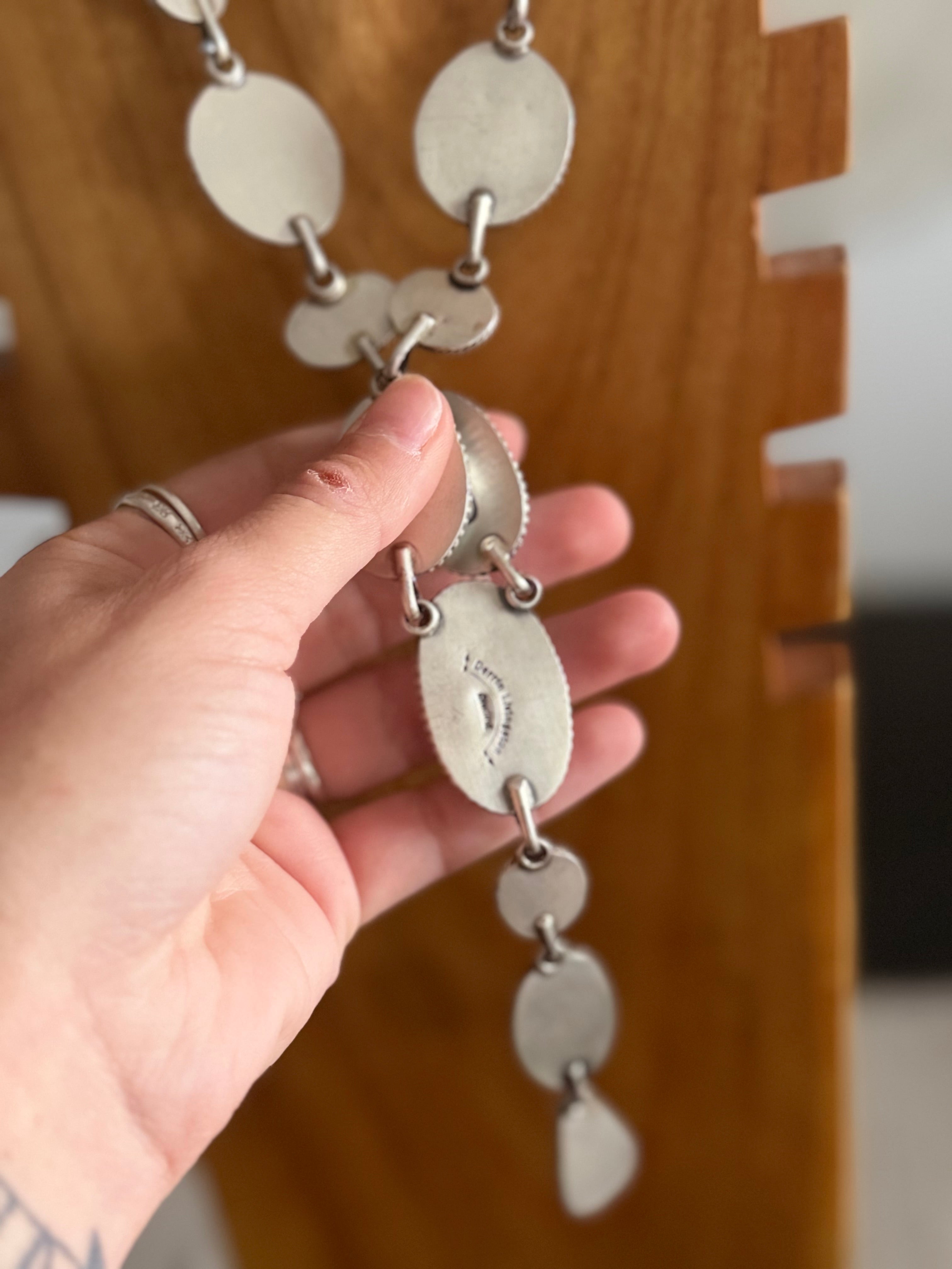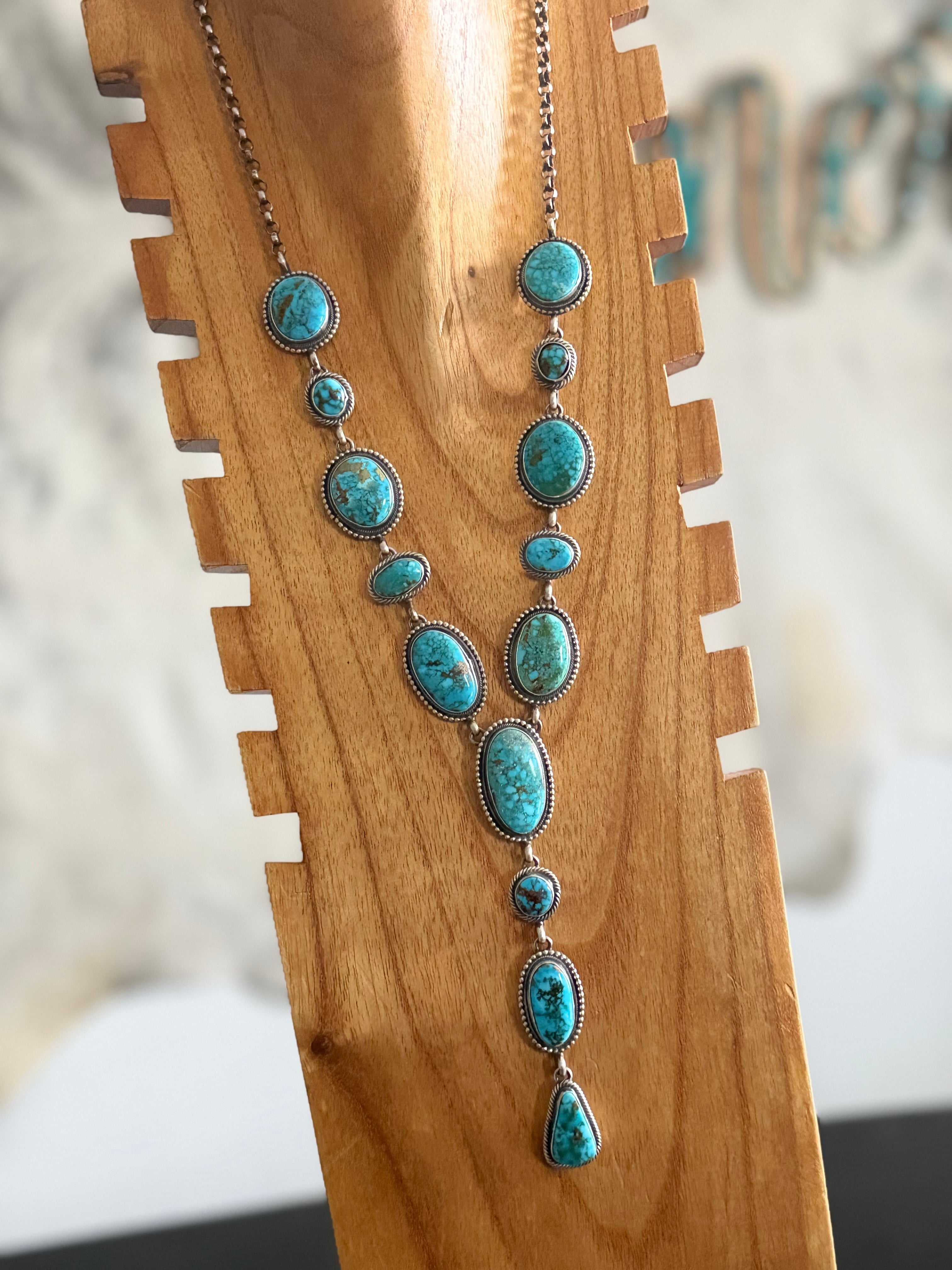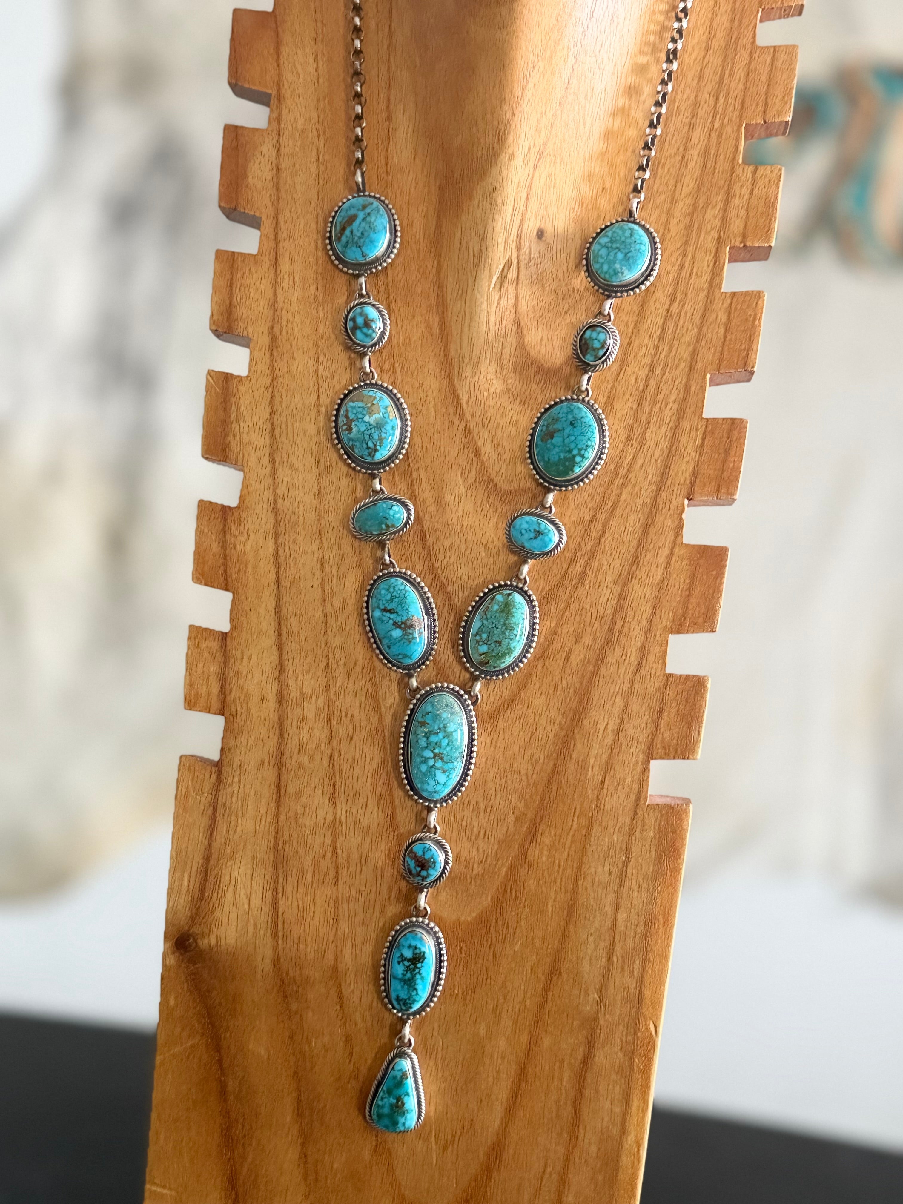 Darrin Livingston Kingman Turquoise & Sterling Silver Lariat Necklace Set. It measures 35 inches long with hang while the chain measures 25 inches long. Signed by the artist and stamped sterling silver.