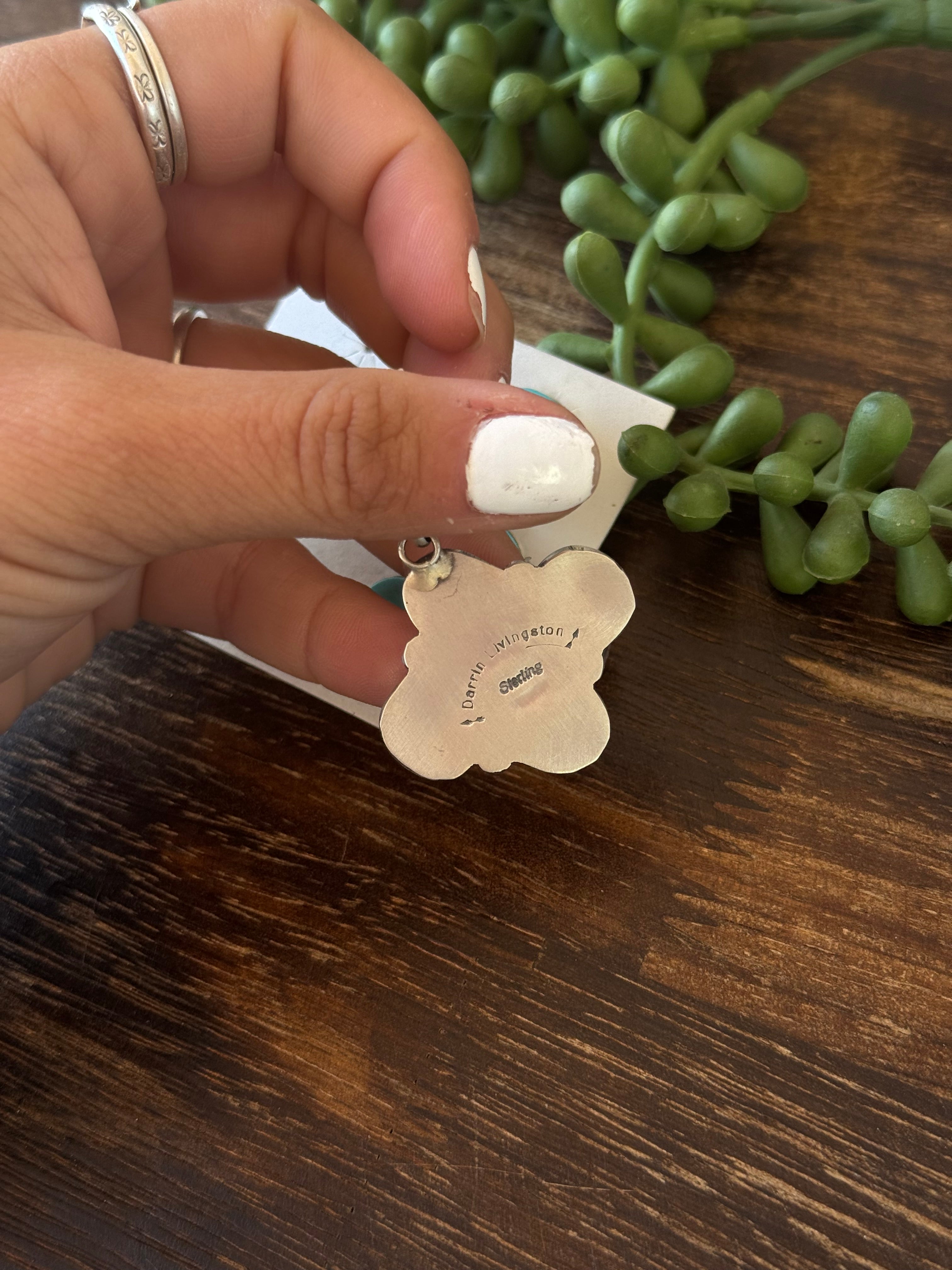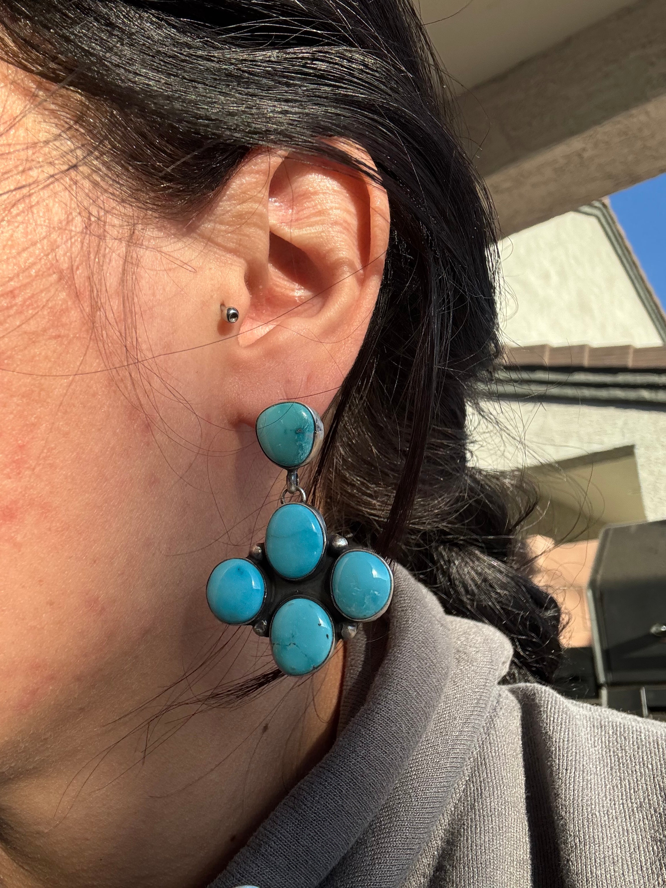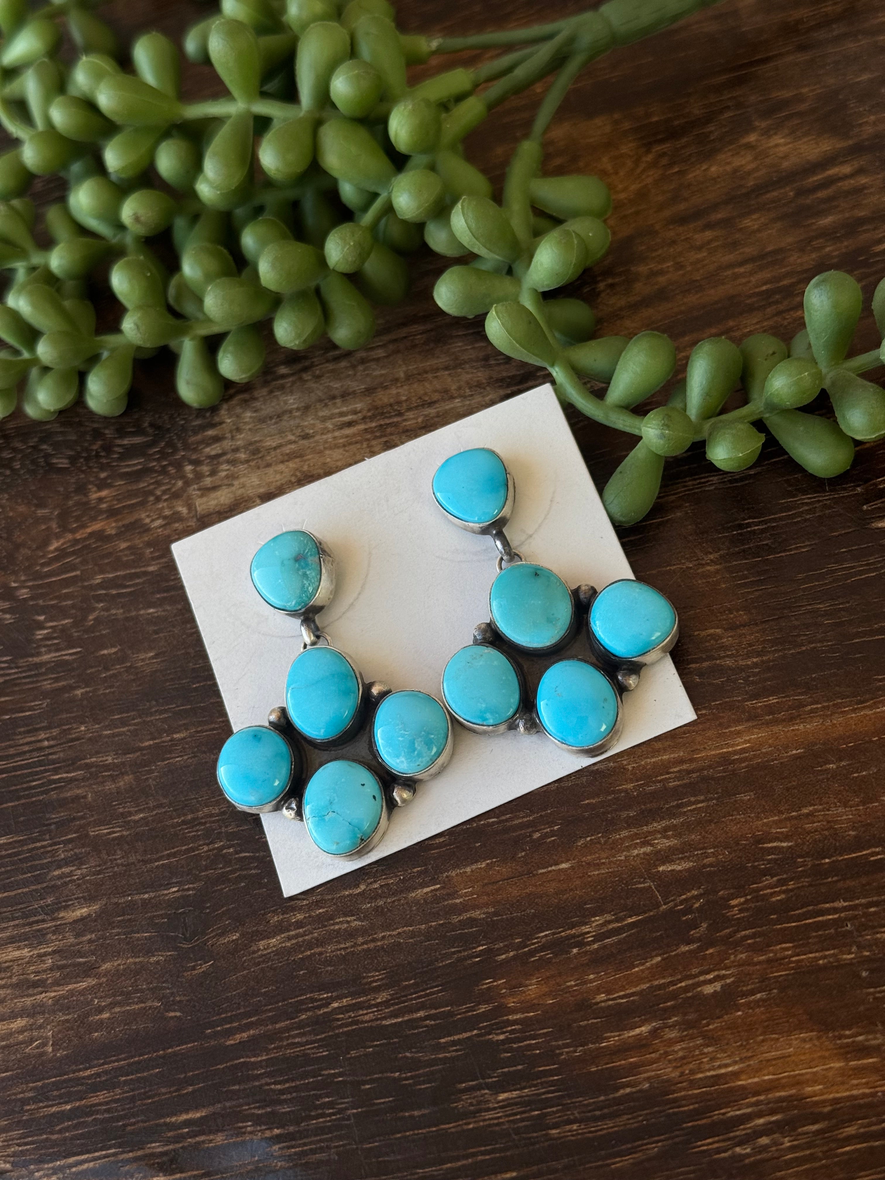 Darrin Livingston Blue Ridge Turquoise & Sterling Silver Post Dangle Cluster Earrings. It measures 1 7/8 inches long and just over 1 1/4 inches wide. Signed and stamped.