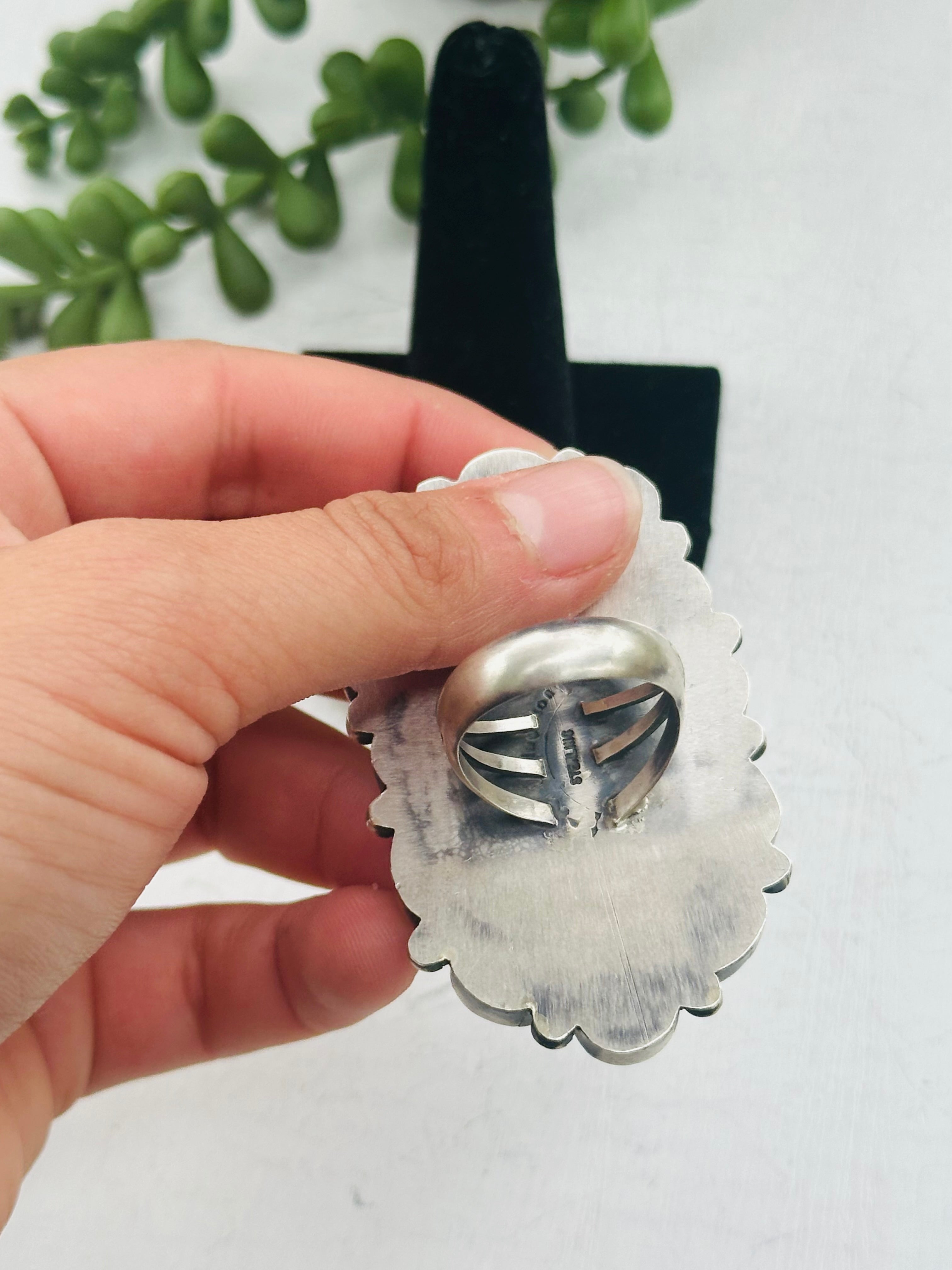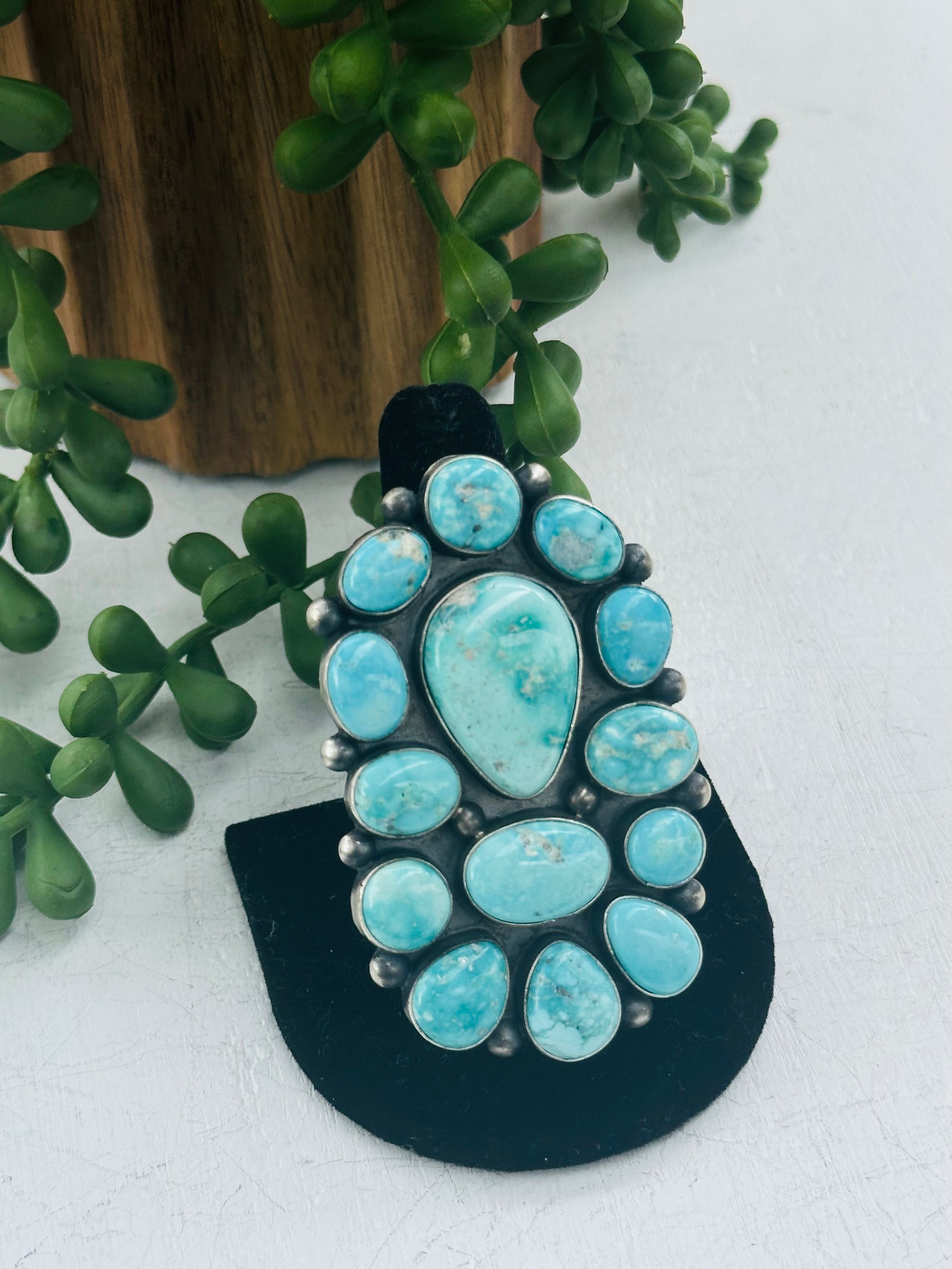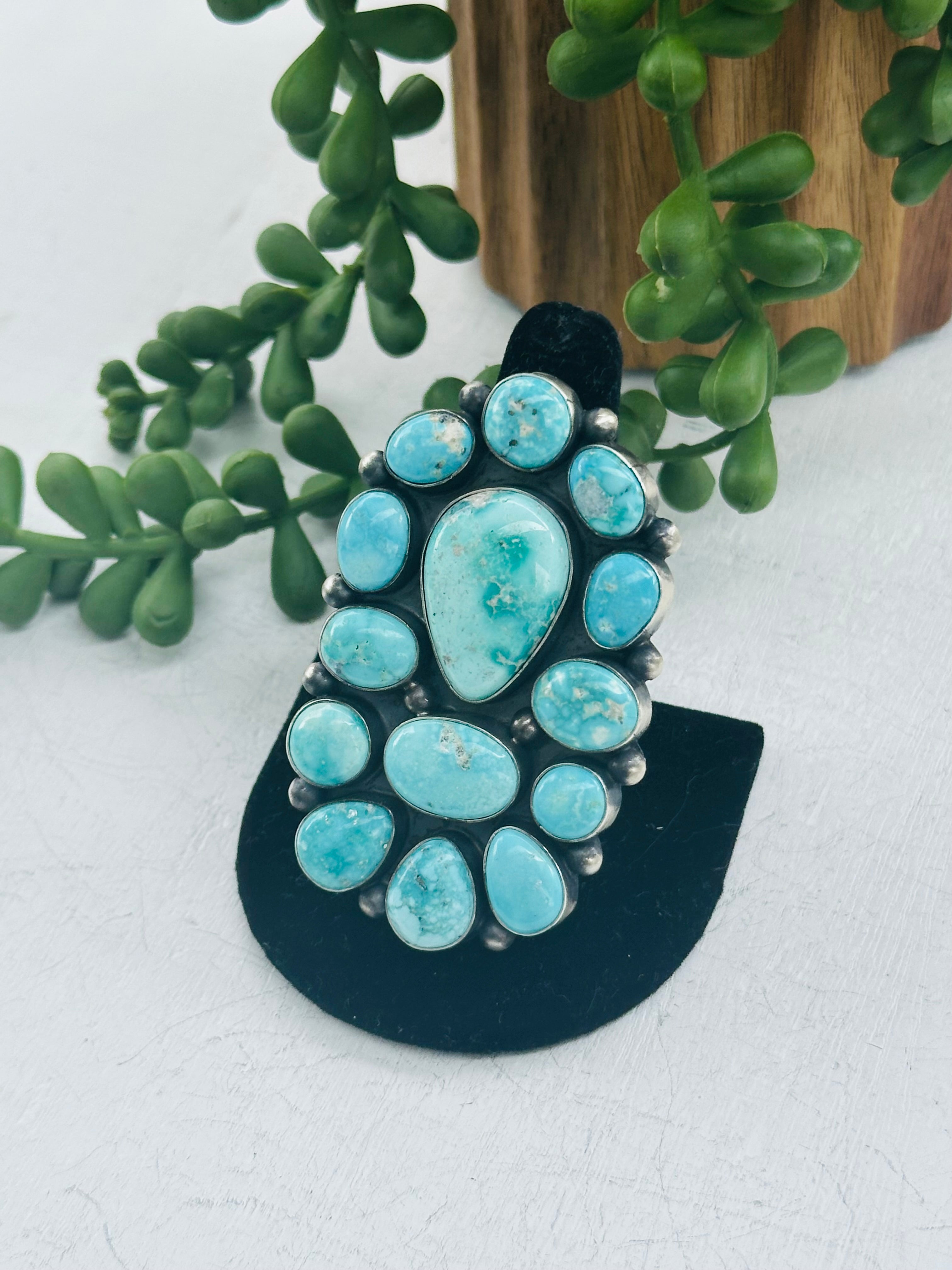 Darrin Livingston White Water Turquoise & Sterling Silver Ring Size 8.75. It measures 2 5/8 inches long and 1 5/8 inches wide. Signed by the artist and stamped sterling silver.