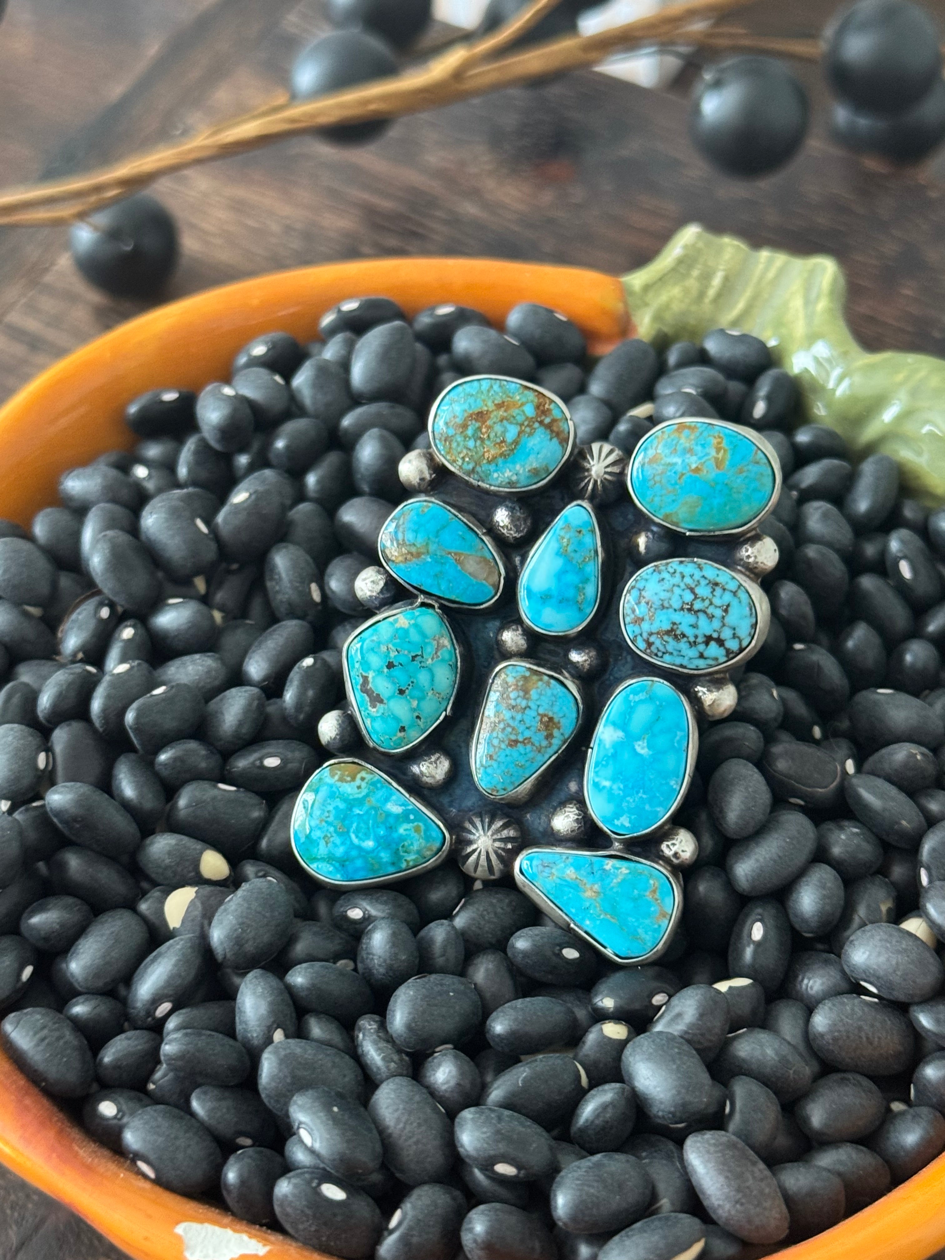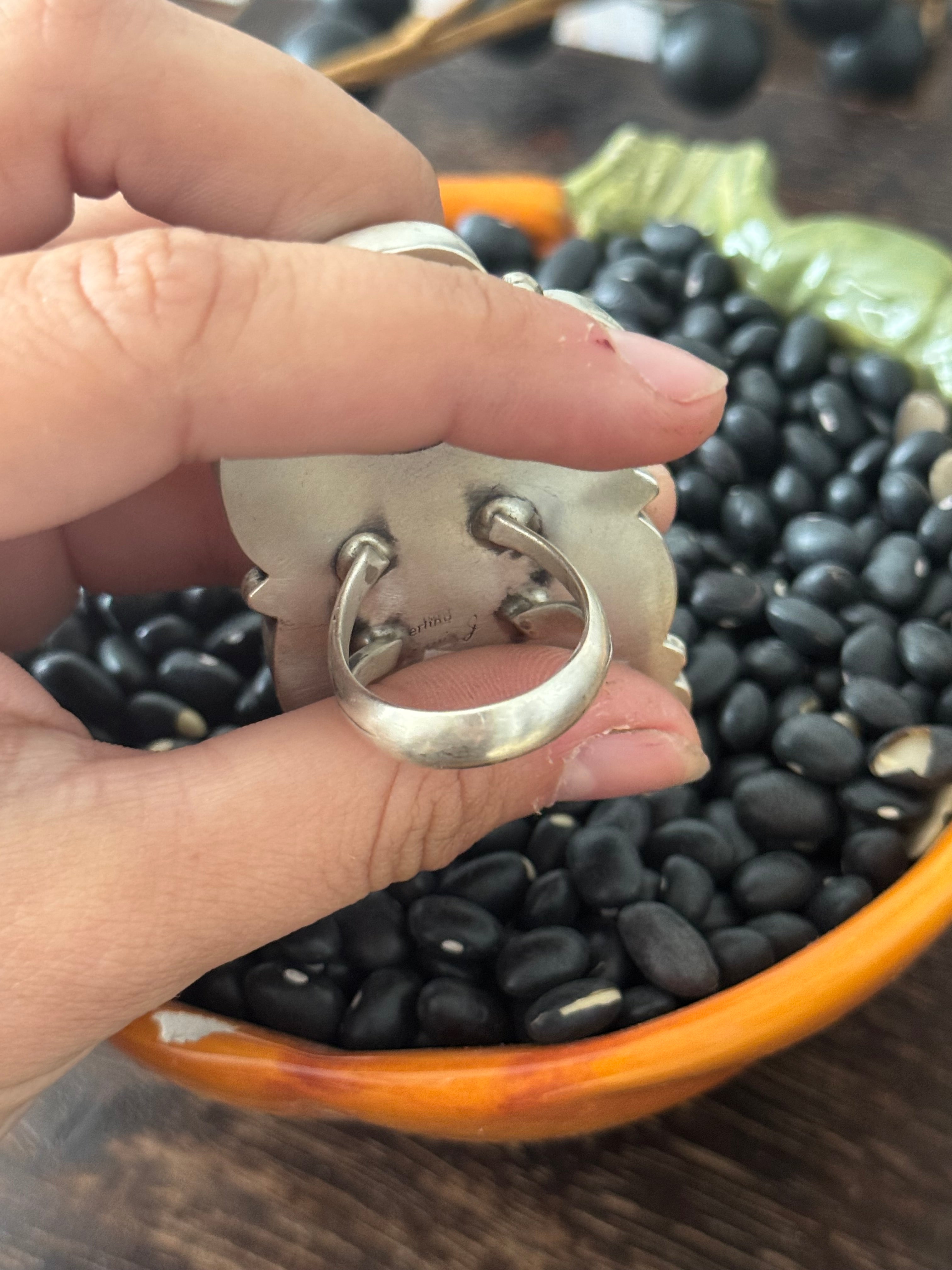 A stunning piece. Navajo Made Birdseye Kingman Turquoise and Sterling Silver Ring Size 9. It measures 2 inches long and 1 1/2 inches wide. Signed by the artist and stamped sterling silver.
