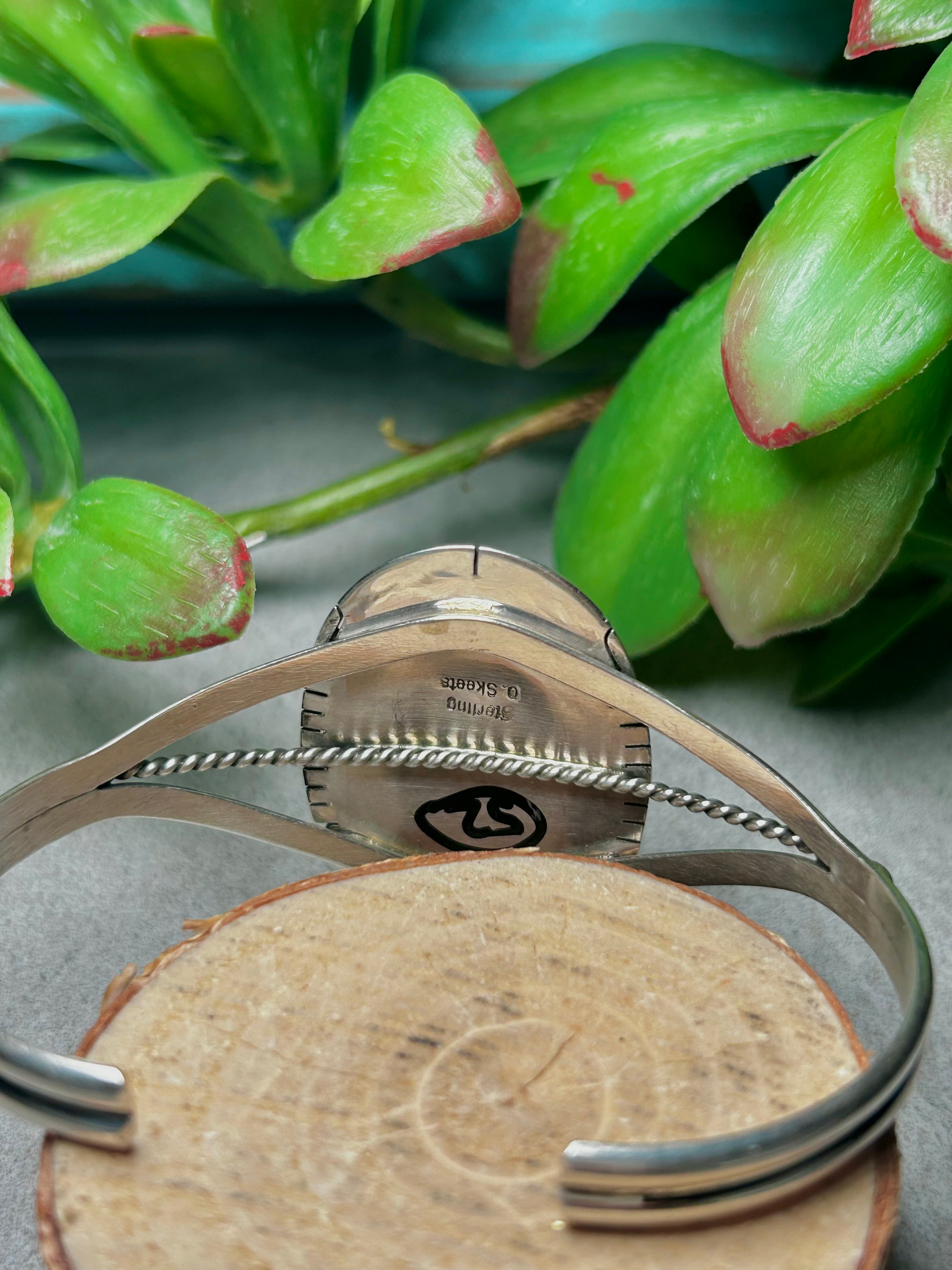 Dave Skeets Black Jack Turquoise & Sterling Silver Cuff Bracelet. It measures 1 1/2 inches wide with an inside circumference of 5 1/2 inches and a gap of 1 inch. Signed by the artist and stamped sterling silver.