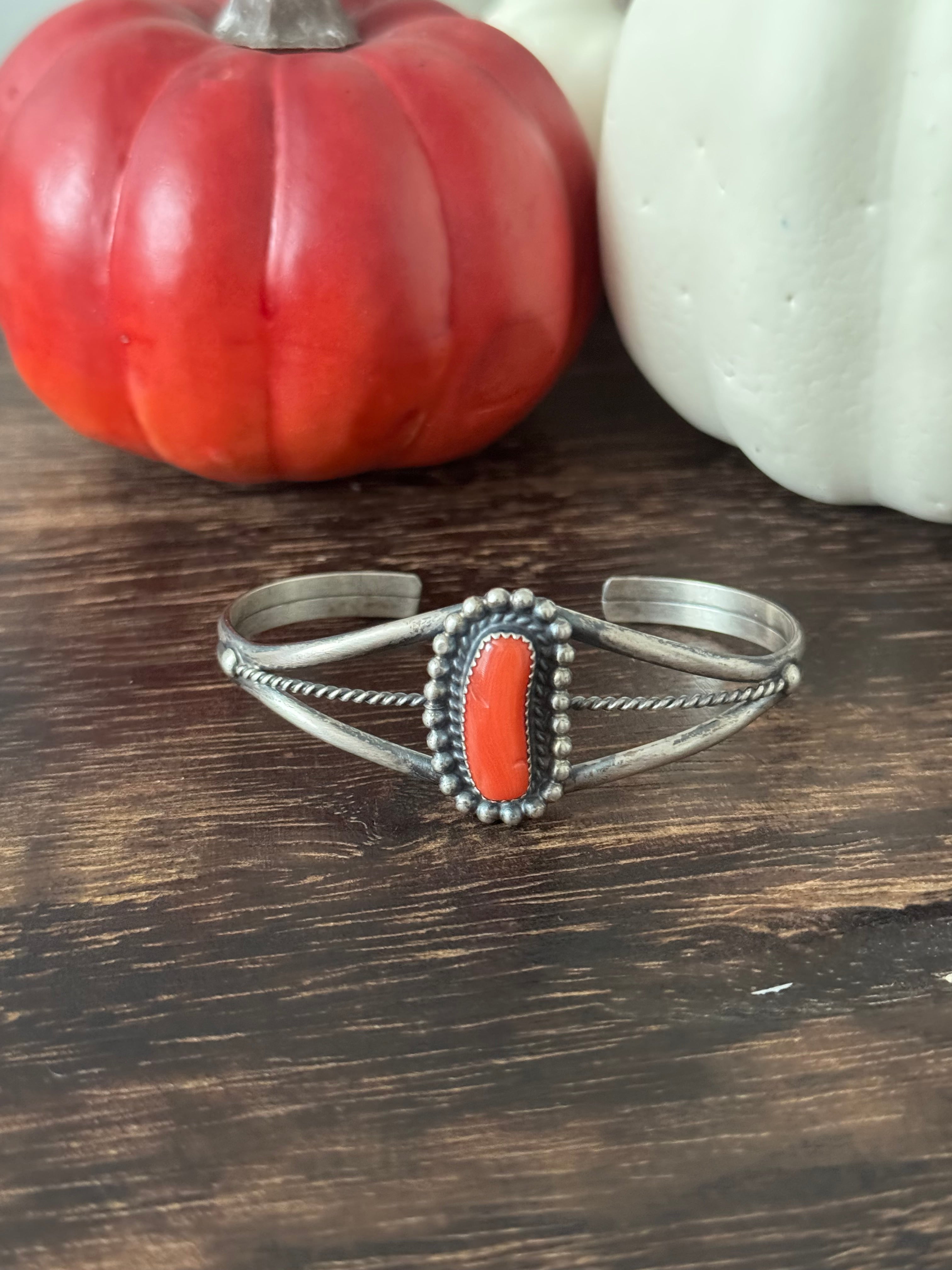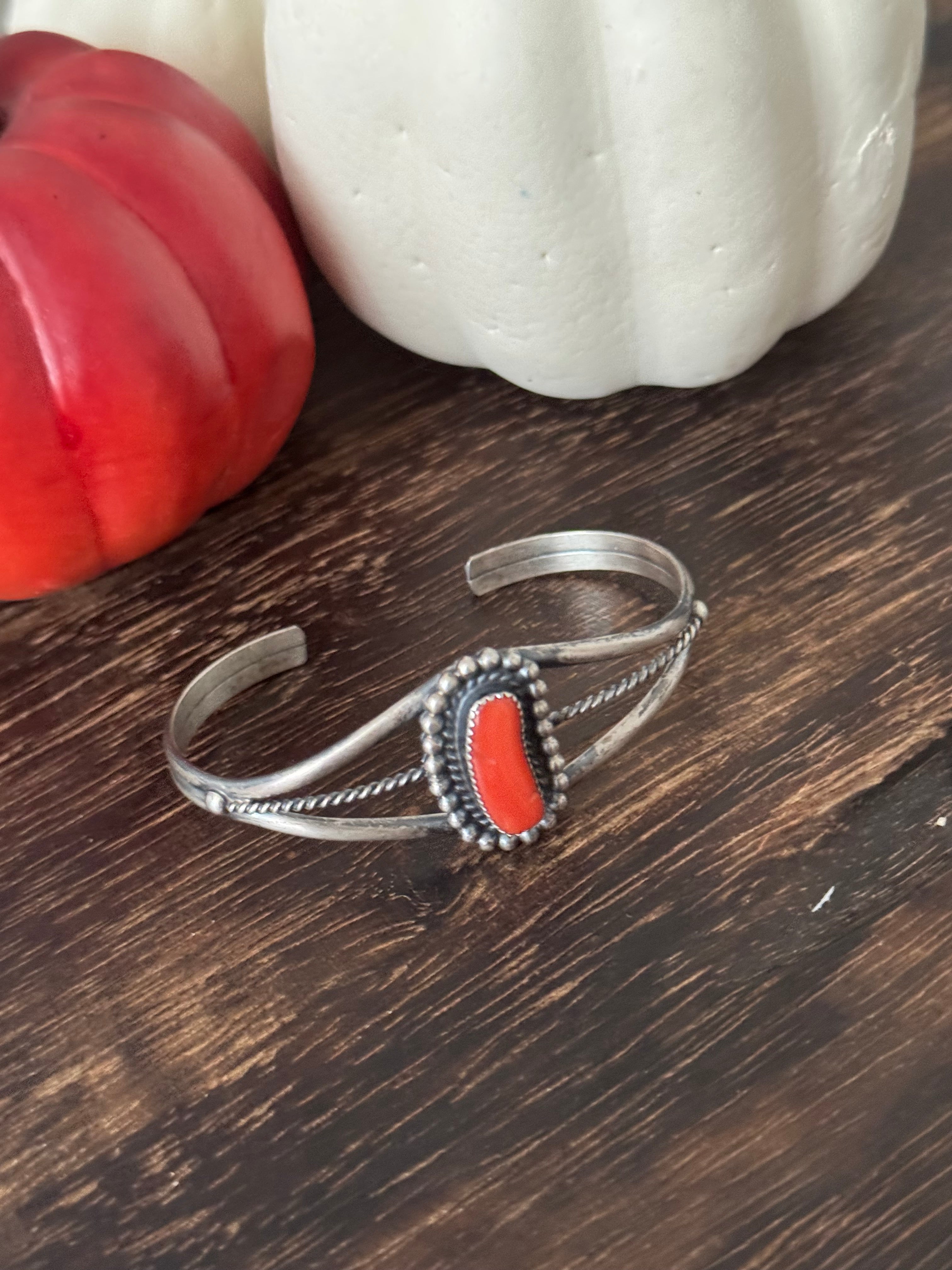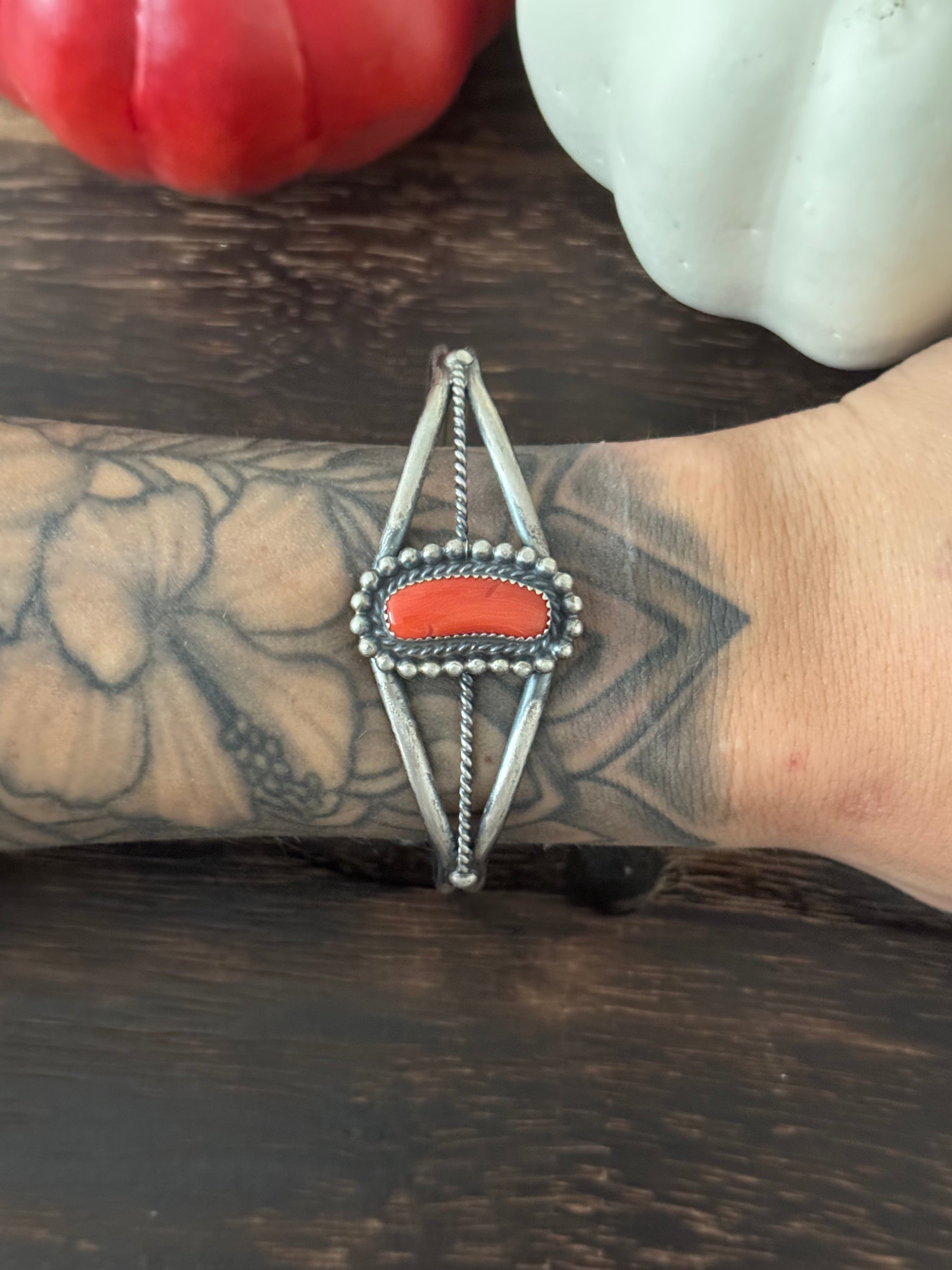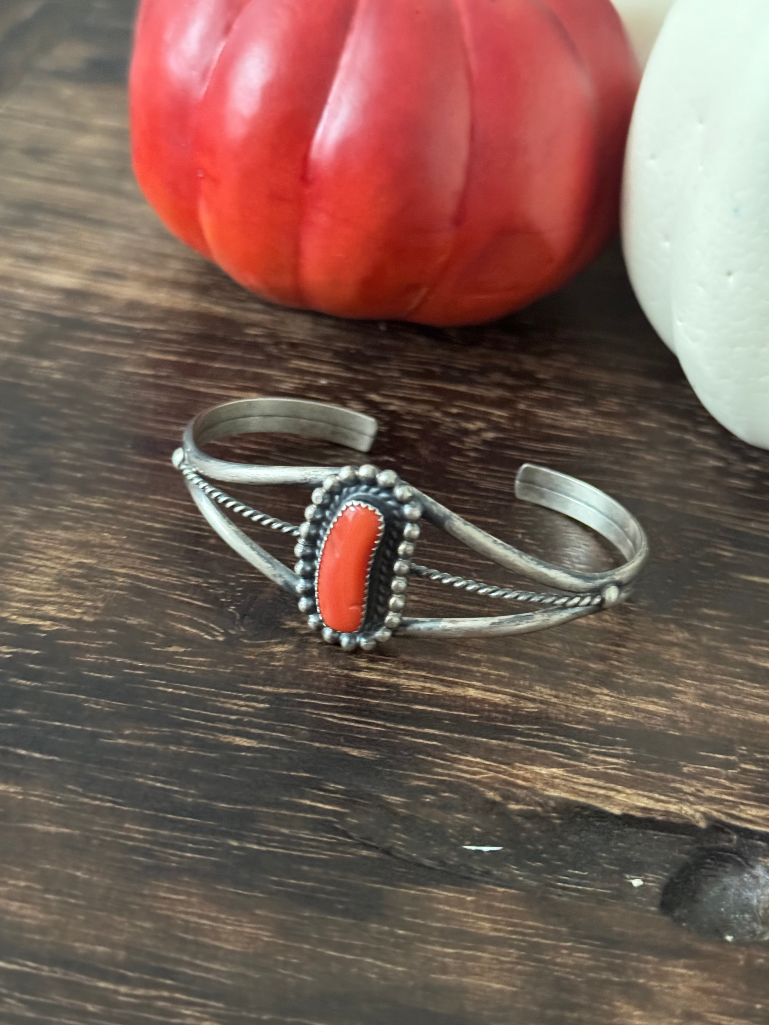 Dave Skeets Coral & Sterling Silver Cuff Bracelet. It measures 1 inch wide with an inside circumference of 5 5/8 inches and a gap of 7/8 of an inch. Signed by artist and stamped sterling silver. Stones will differ due to natural stones.