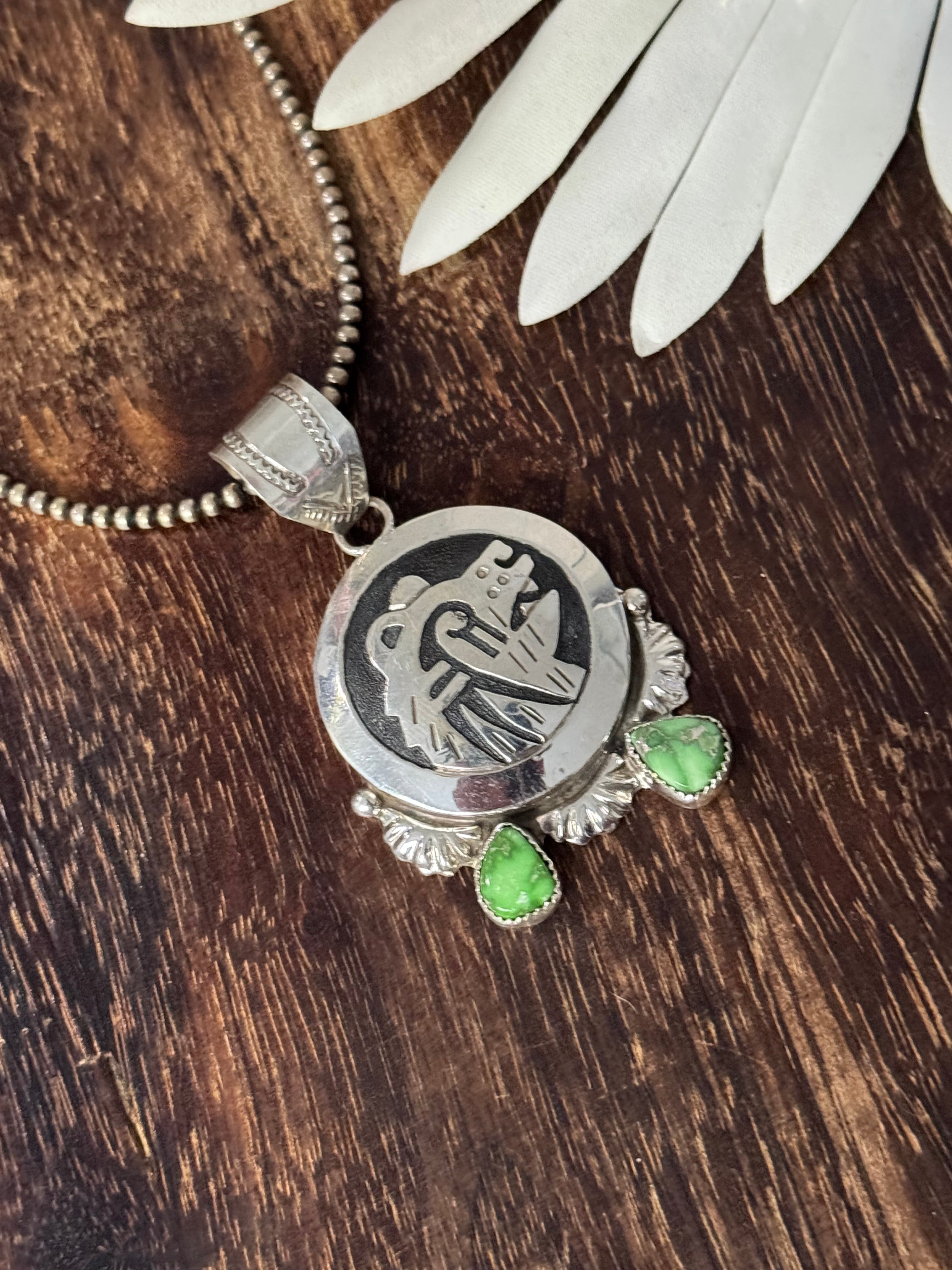 Alonzo Mariano Sonoran Gold Turquoise & Sterling Silver Pendant. It measures 2 7/8 inches long and 1 5/8 inches wide. Pendant Only!! Signed by the artist and stamped sterling silver.