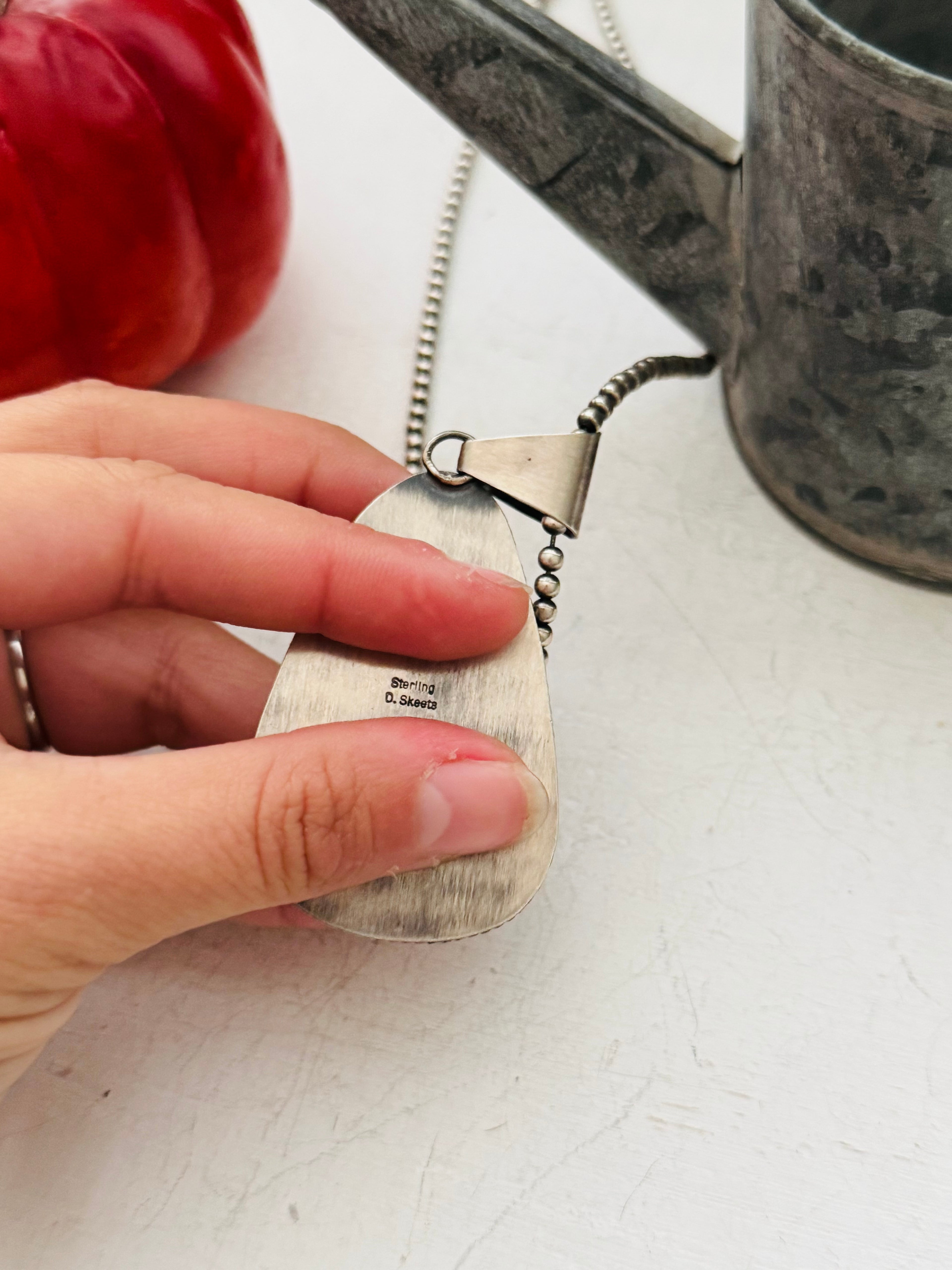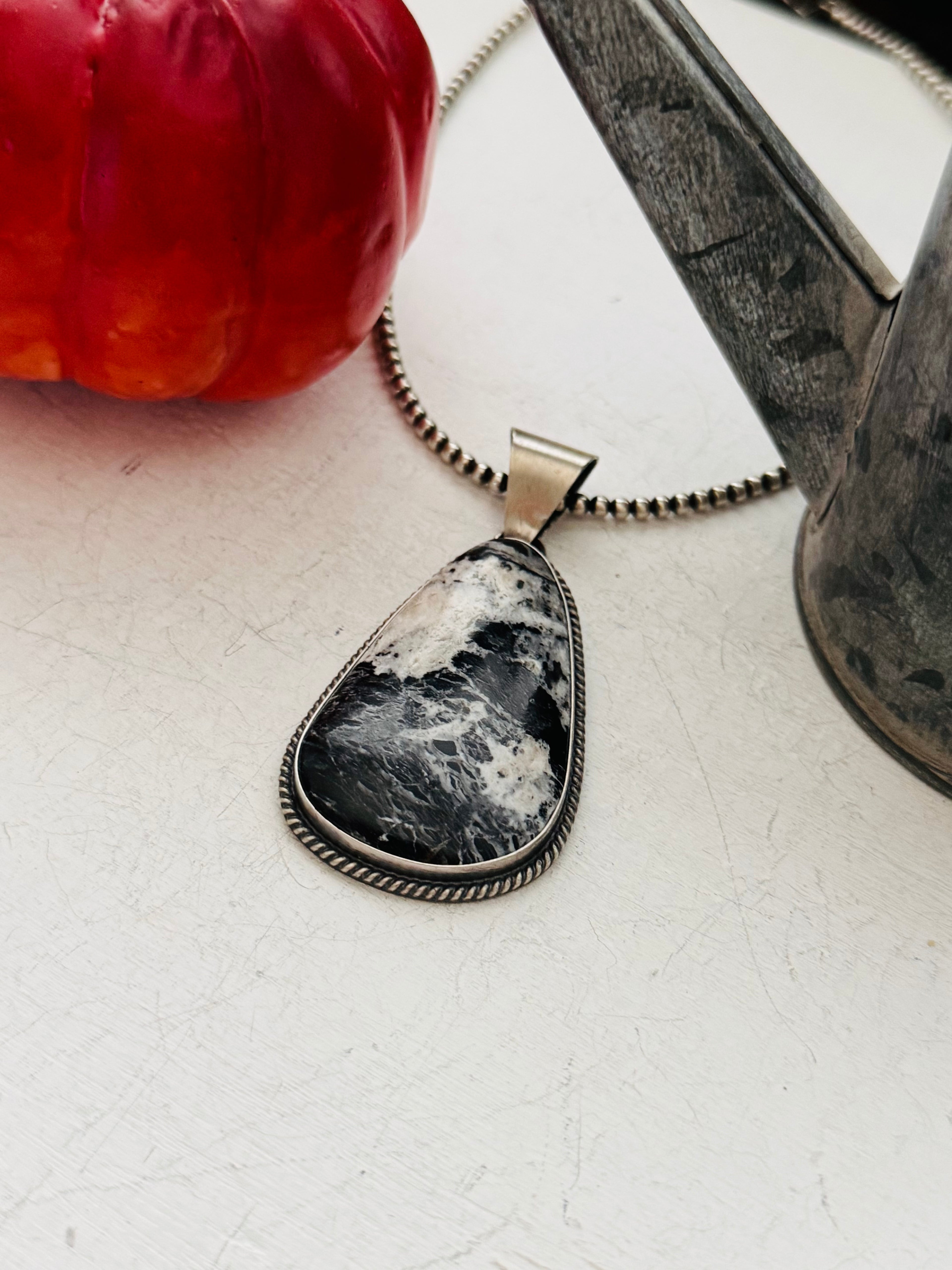 Dave Skeets White Buffalo & Sterling Silver Pendant. It measures 2 3/4 inches long and just over 1 3/8 inches wide. Pendant Only! Signed by the artist and stamped sterling silver.