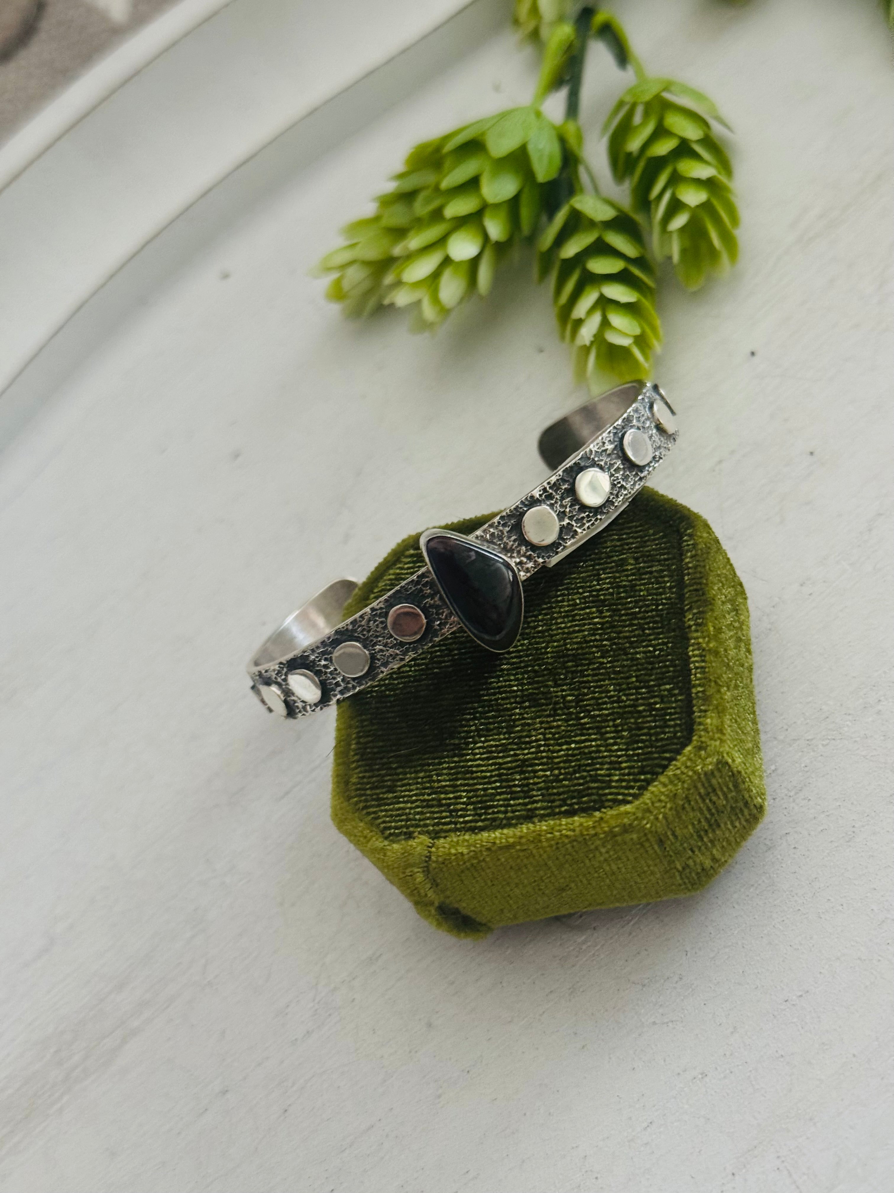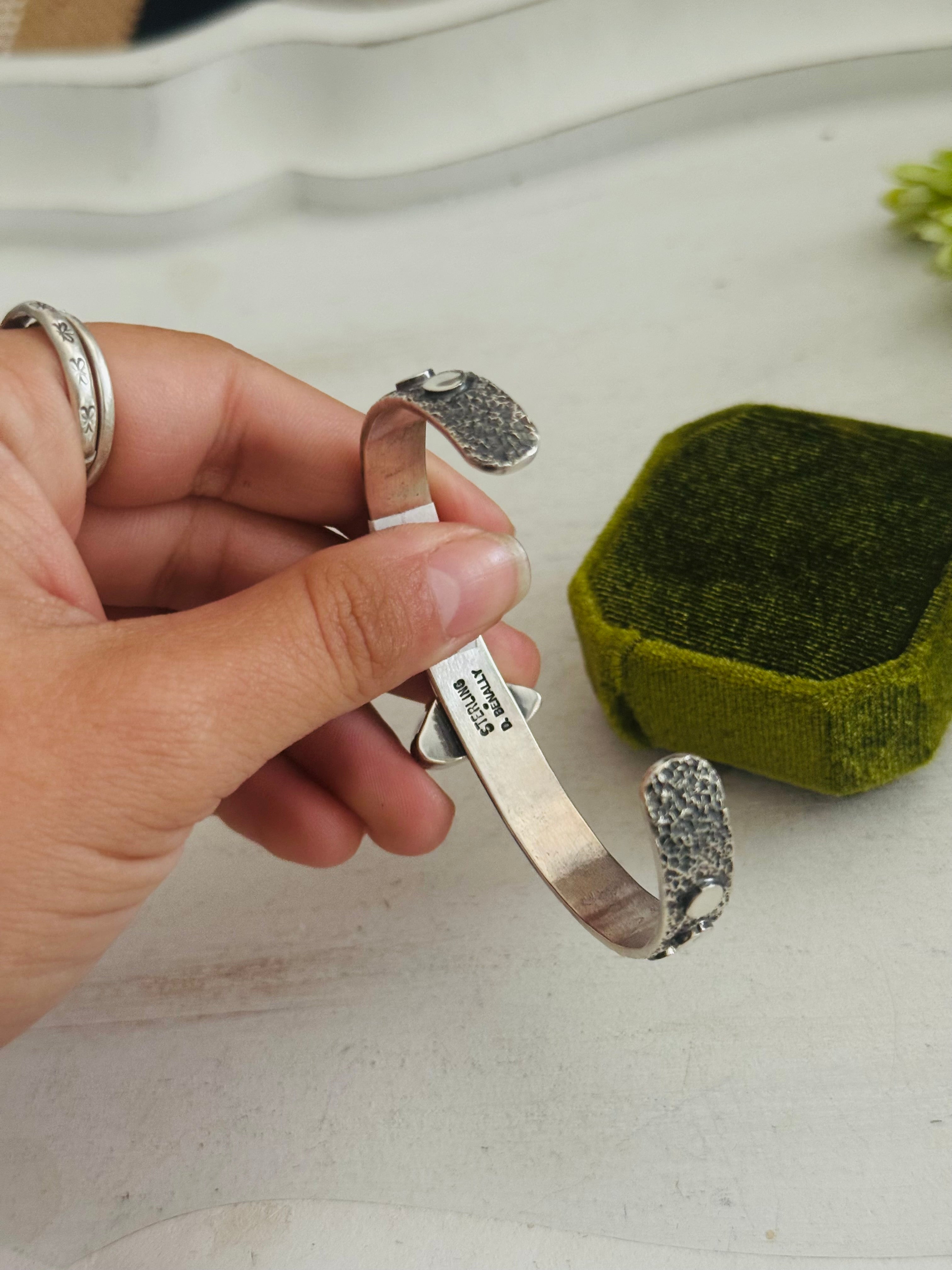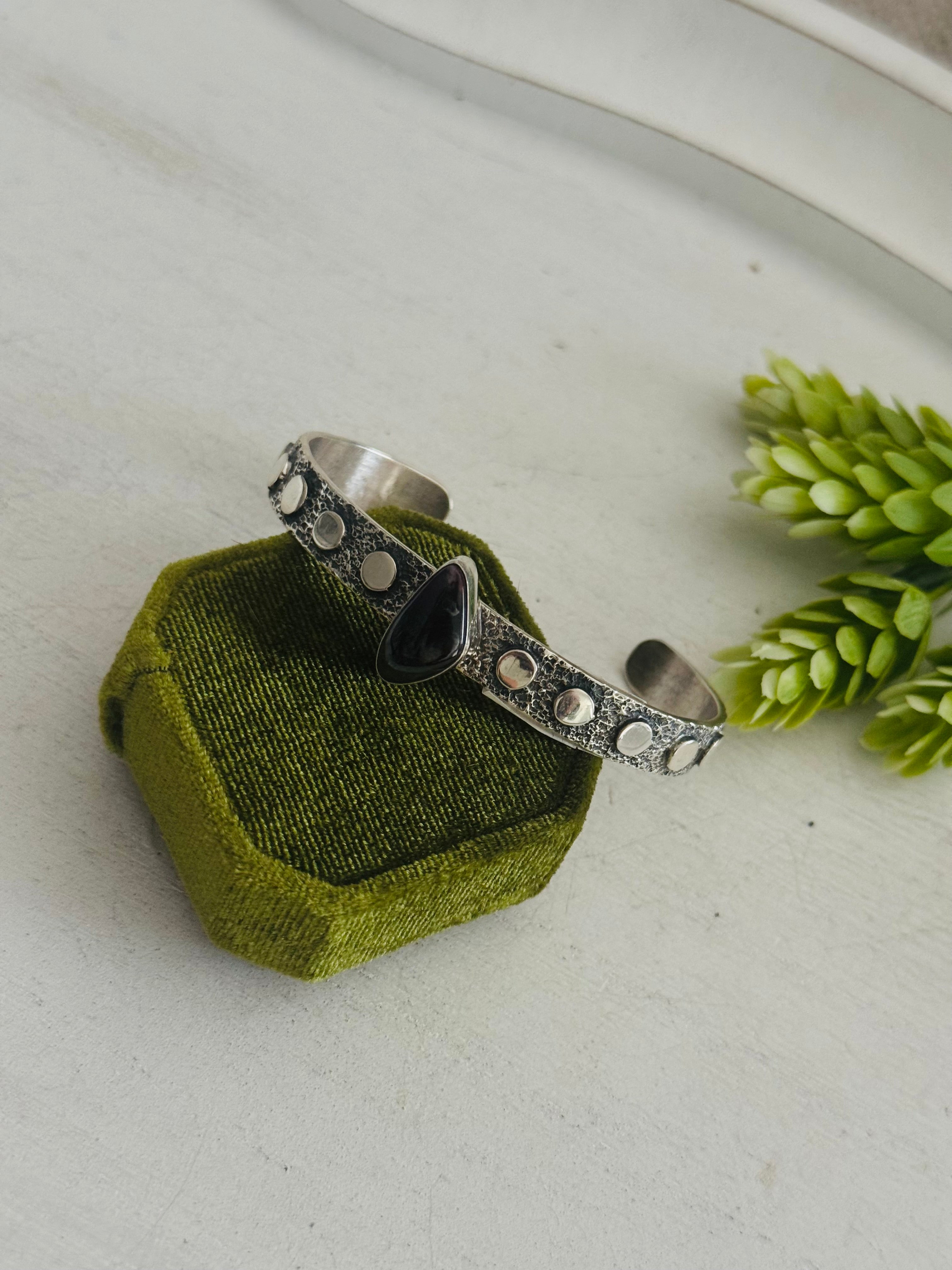 David Benally Sugilite & Sterling Silver Cluster Tufa Cast Cuff Bracelet. It measures 5/8 of an inch wide with an inside circumference of 5 1/2 inches and a gap of 1 1/8 inches. Signed by the artist and stamped sterling silver.