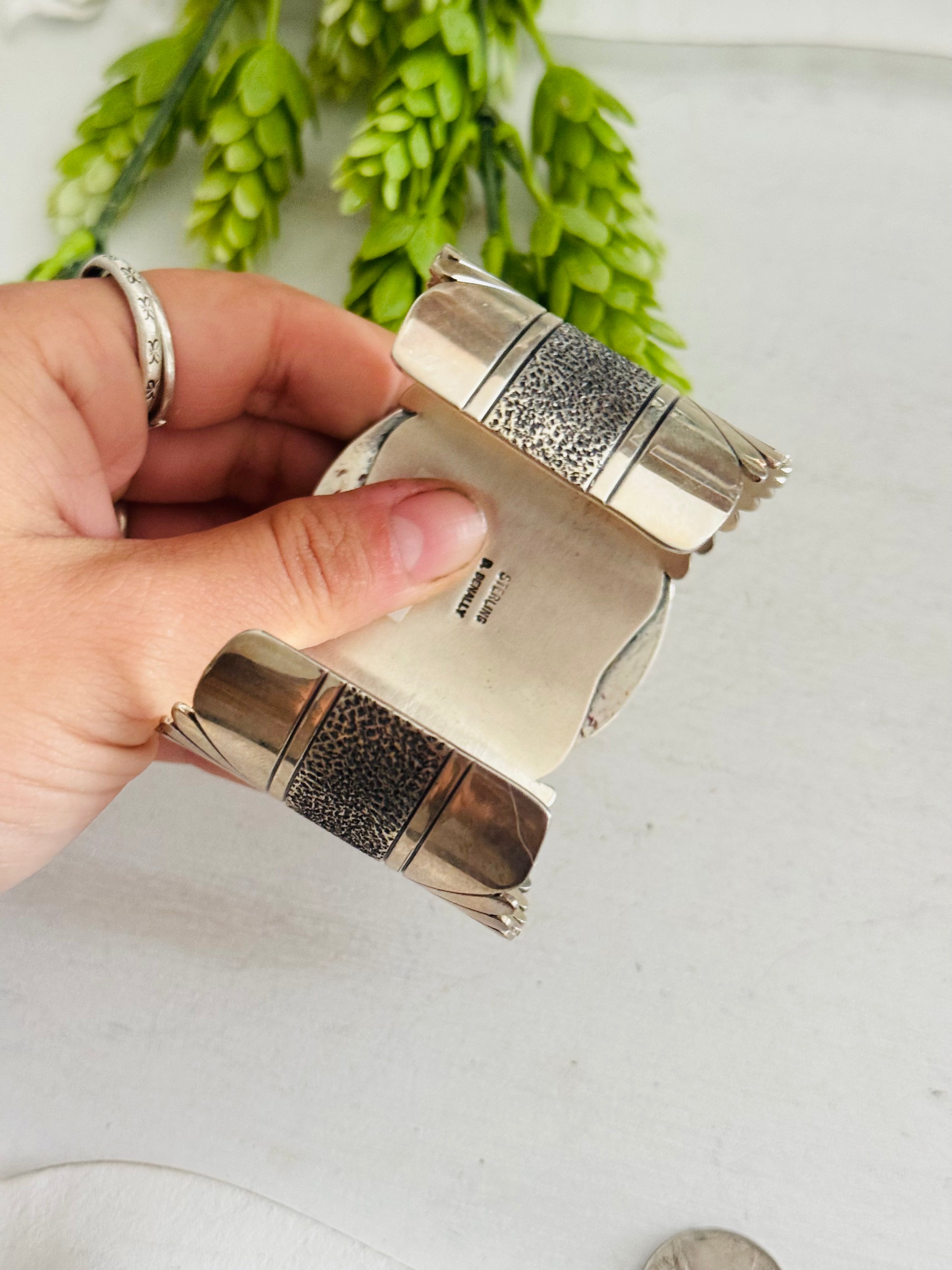 David Benally Sonoran Mountain Turquoise & Sterling Silver Cuff Bracelet. It measures 2 inches wide with an inside circumference of 5 3/4 inches and a gap of 1 1/4 inches. Signed by the artist and stamped sterling silver.