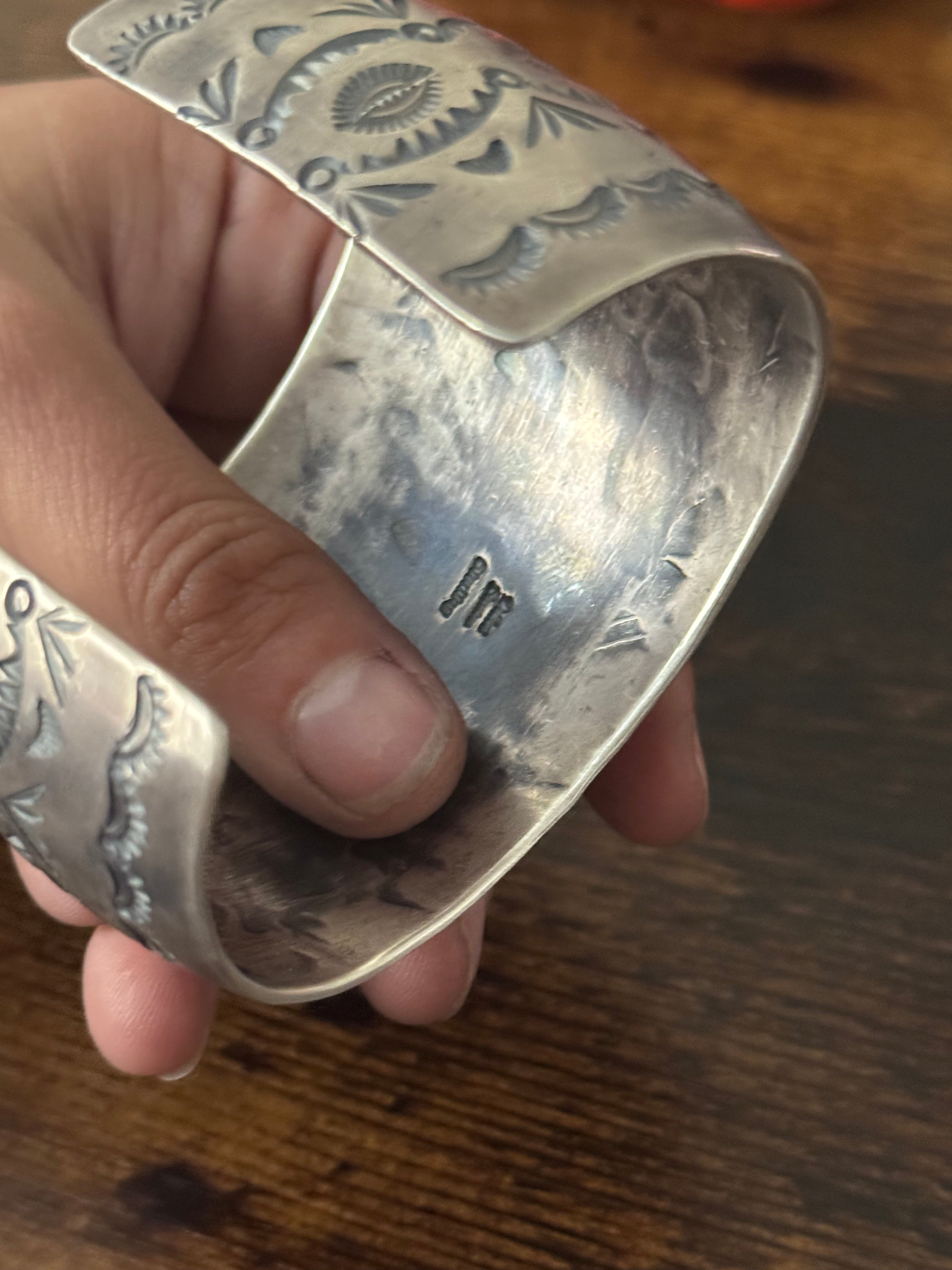 Delbert Secatero Valley Blue Turquoise & Sterling Silver Cuff Bracelet. It measures 2 inches wide with an inside circumference of 6 inches and a gap 1 inch. Signed by the artist and stamped sterling silver.