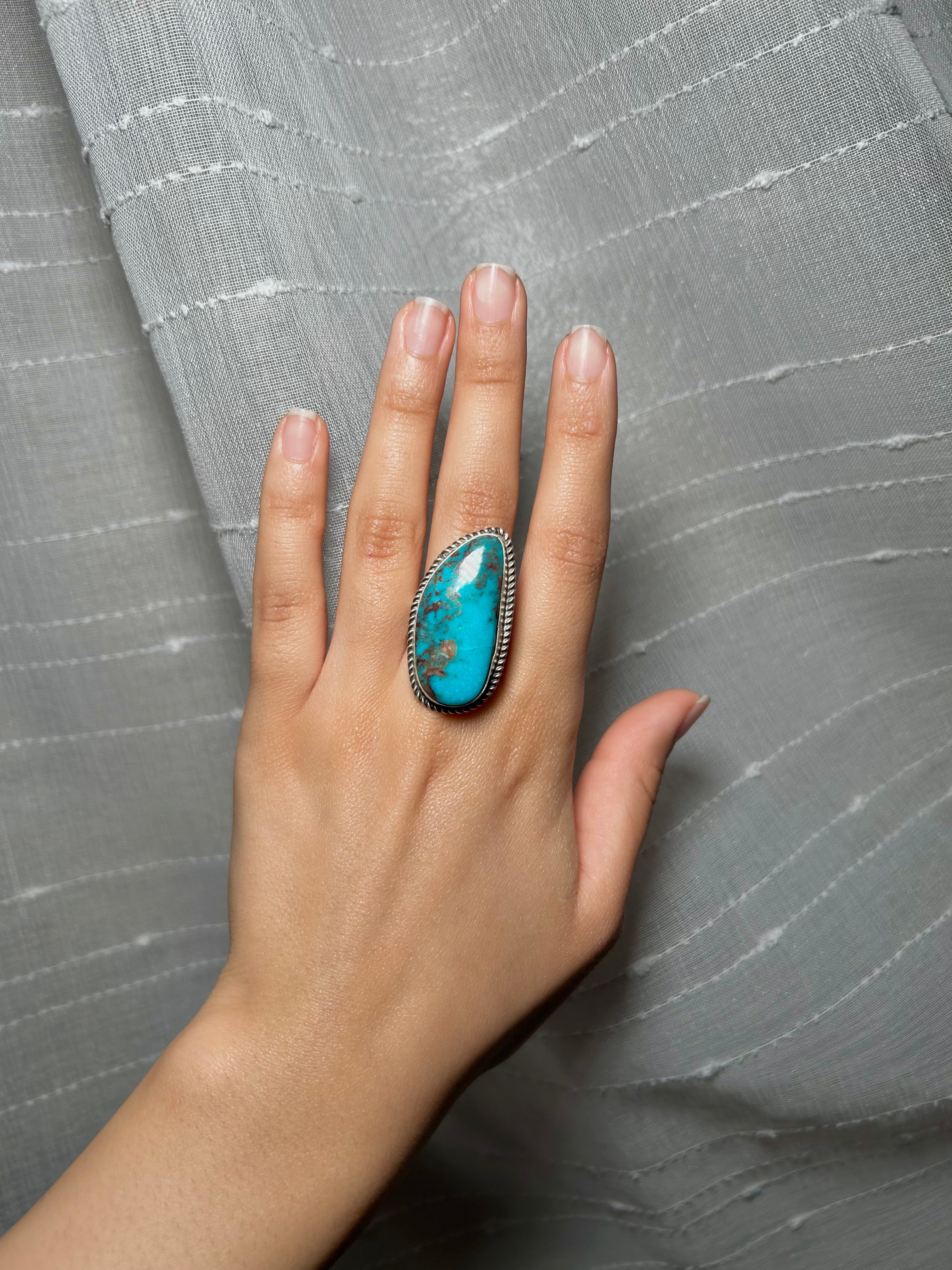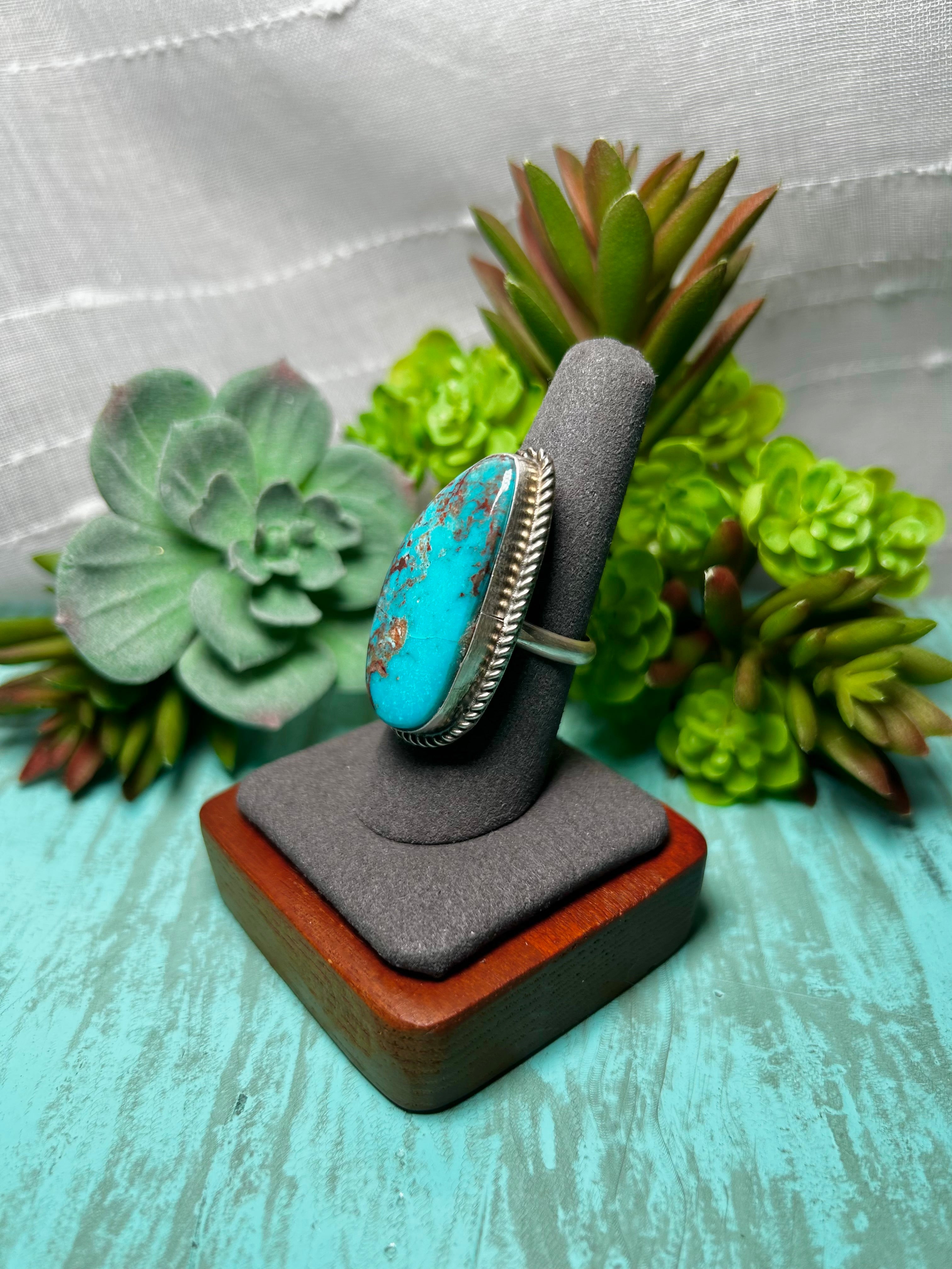Donovan Nez Kingman Turquoise & Sterling Sliver Adjustable Ring. It measures 1 1/2 inches long and 3/4 of an inch wide. Signed by the artist and stamped sterling silver.