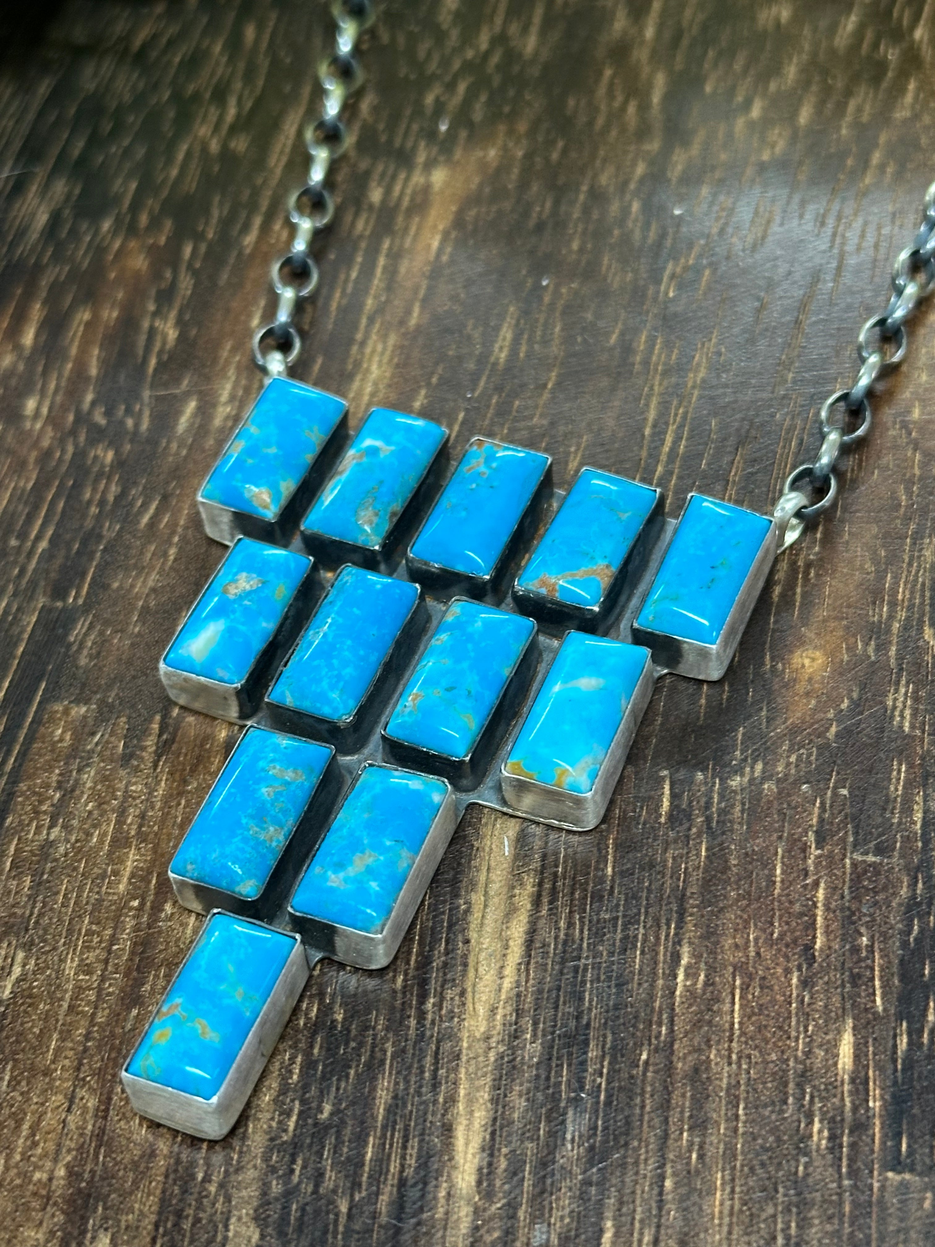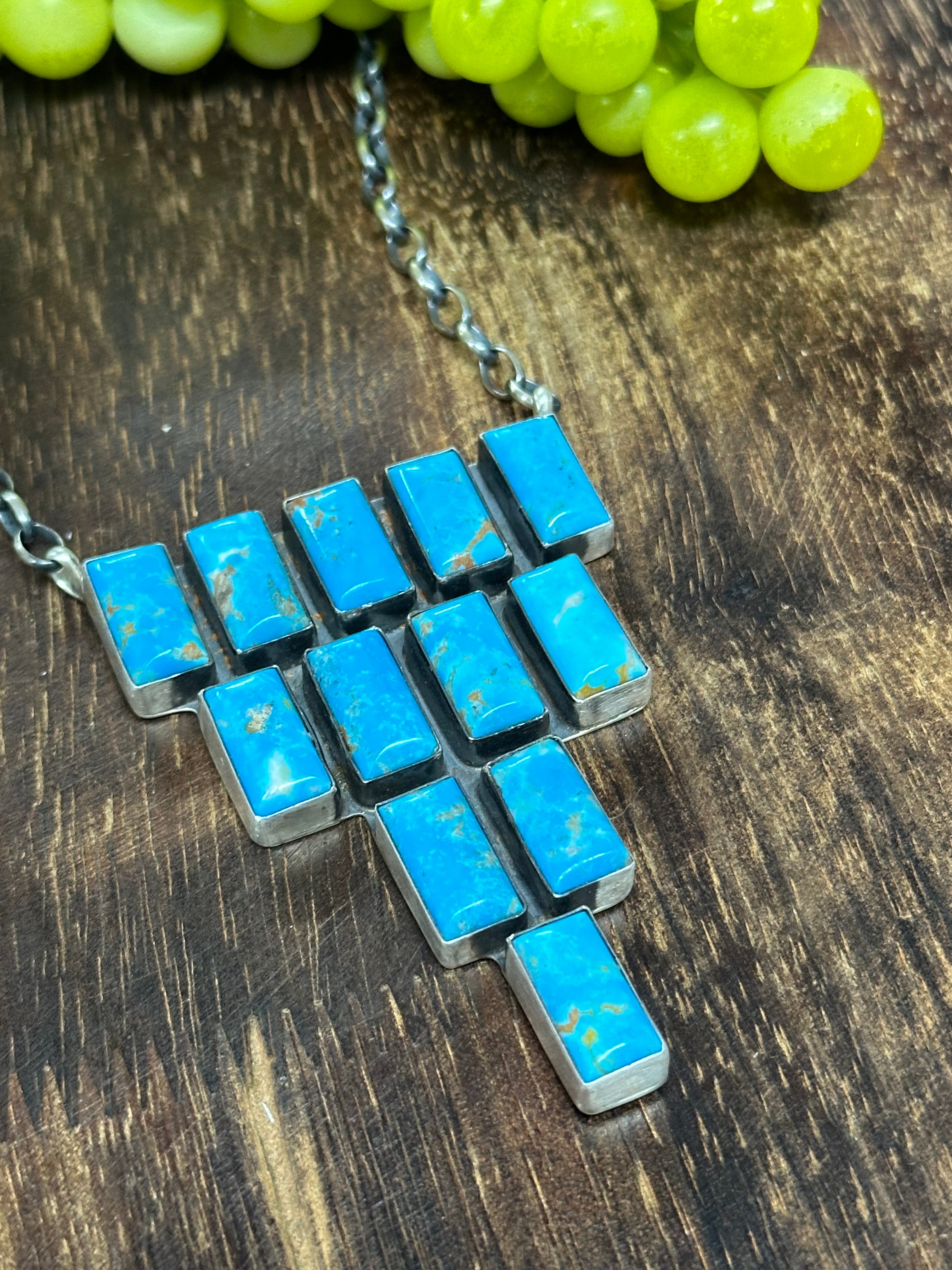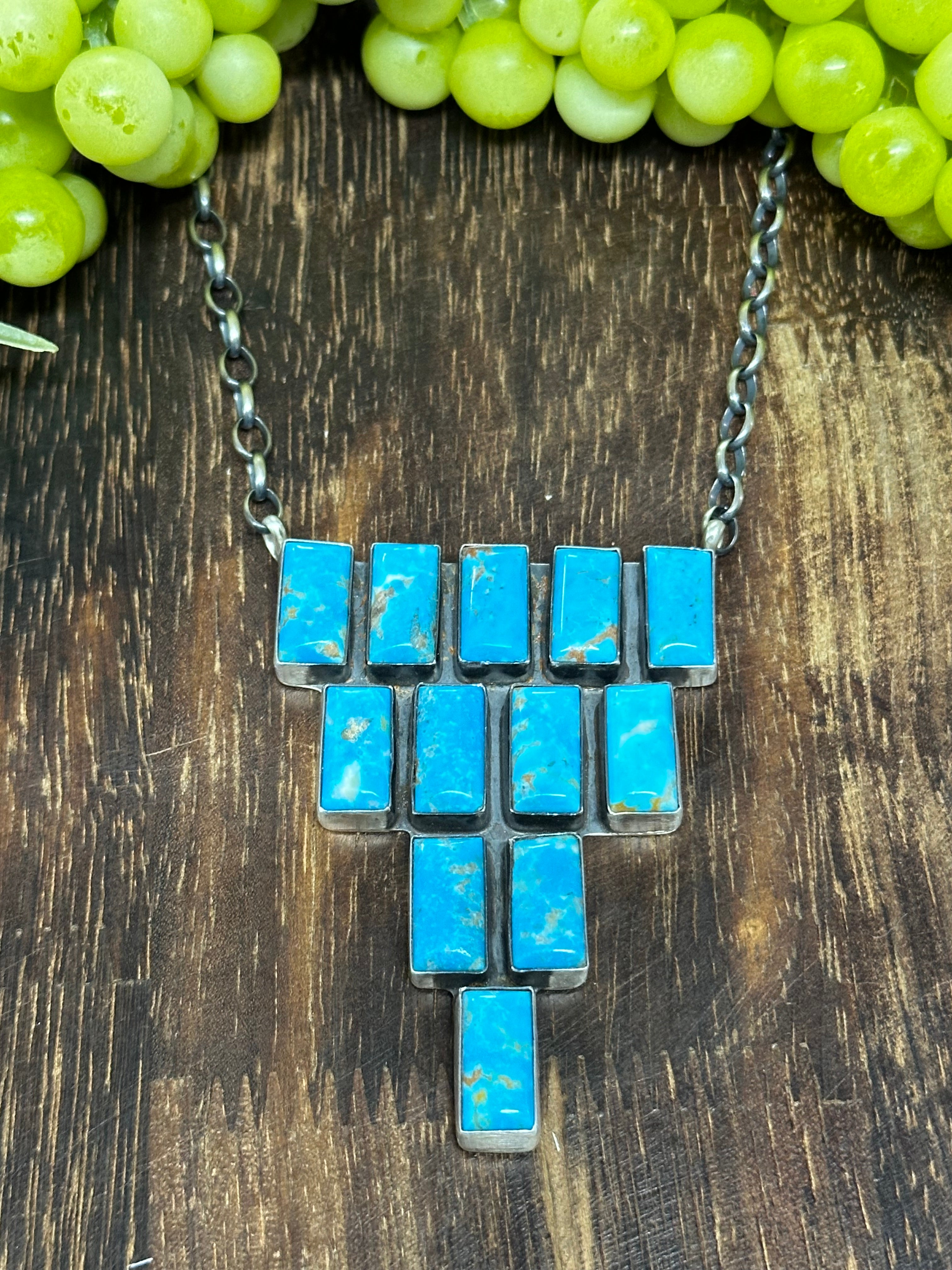 Beautiful Necklace and ring. Donovan Skeets Kingman Turquoise & Sterling Silver Cluster Necklace & Adjustable Ring Set. It measures 25 1/2 inches long with hang while the chain measures 19 inches long. The ring measures 2 1/4 inches long and 1 1/4 inches wide. Stamped sterling silver and signed by artist.
