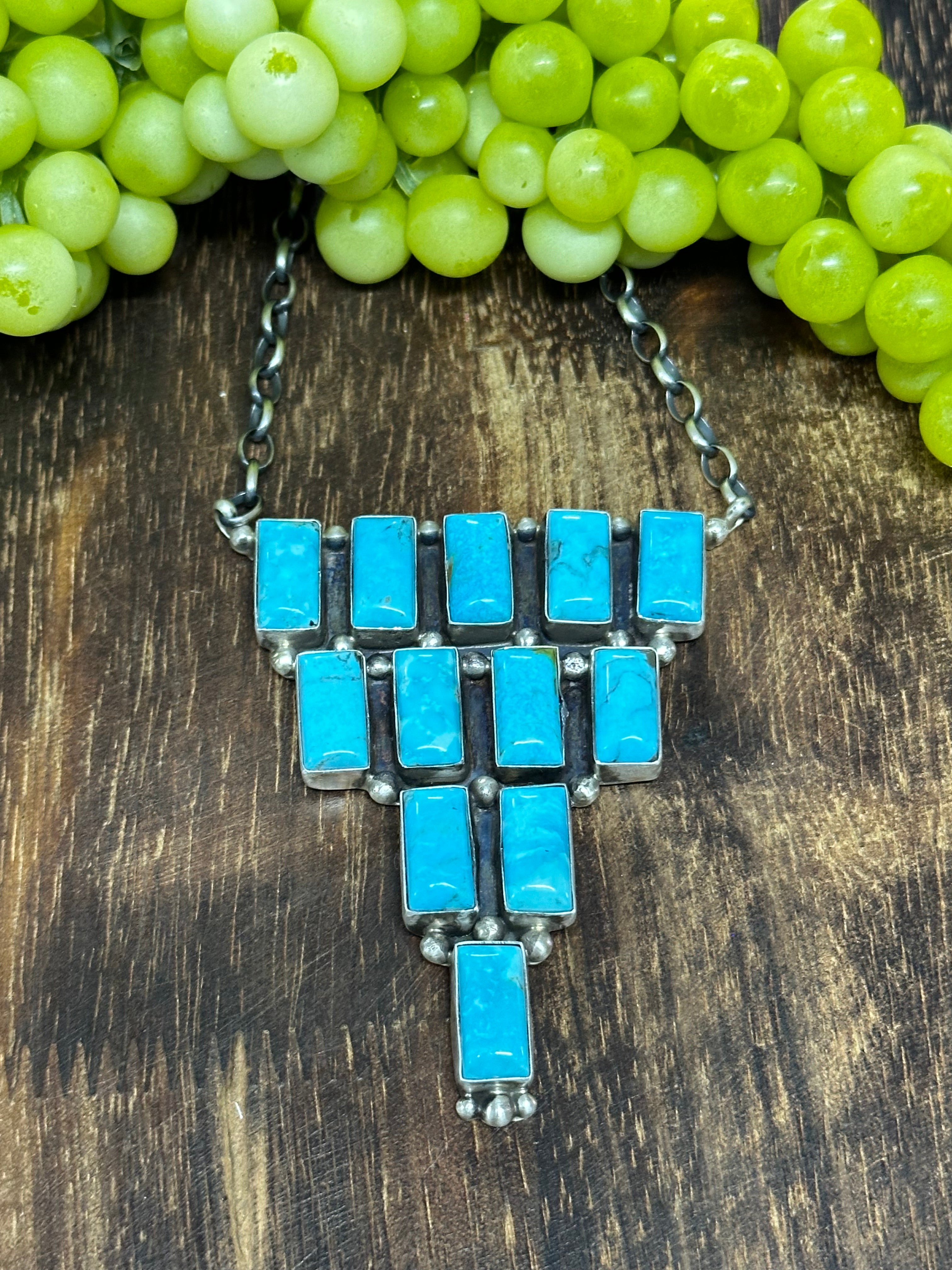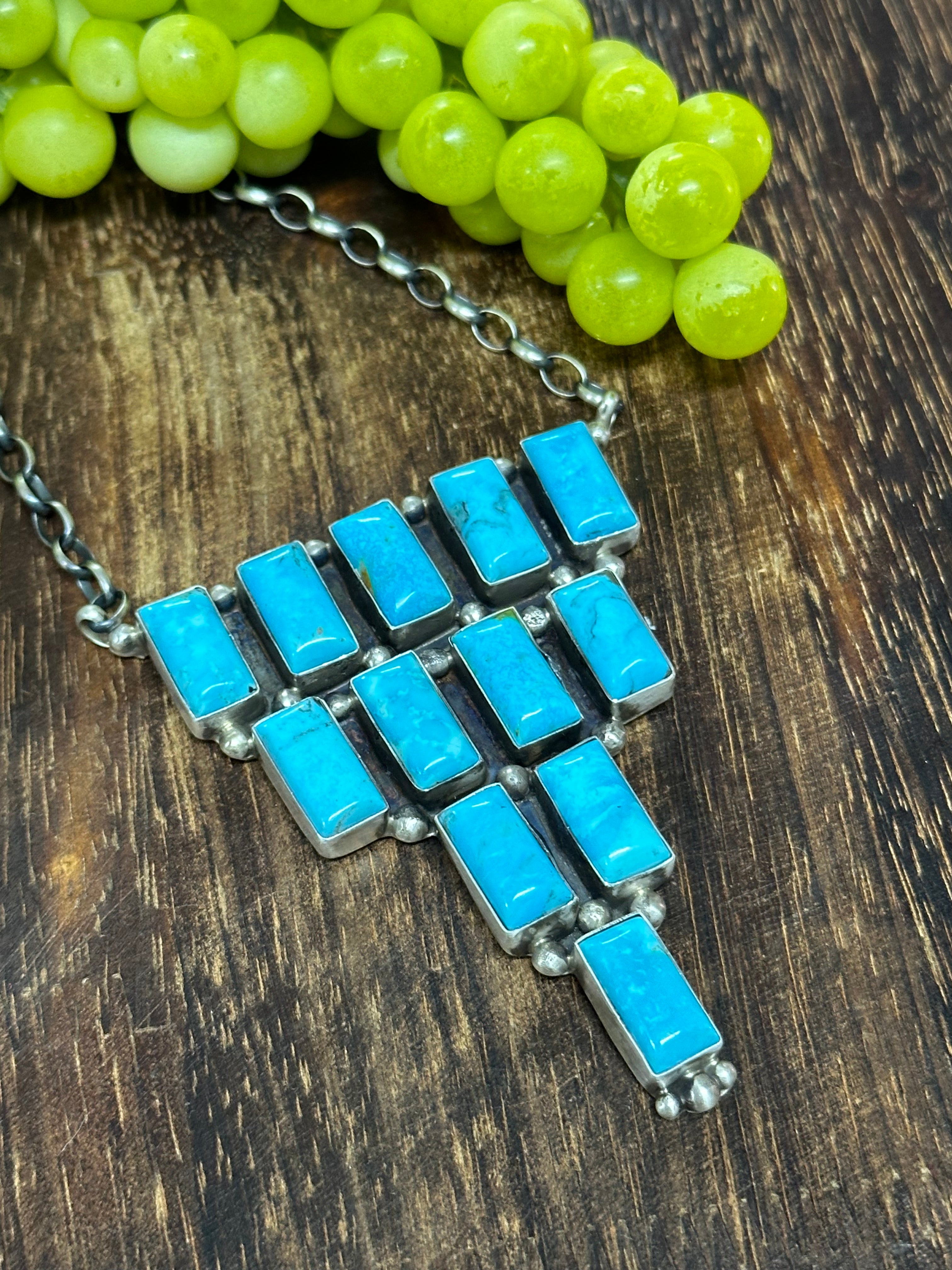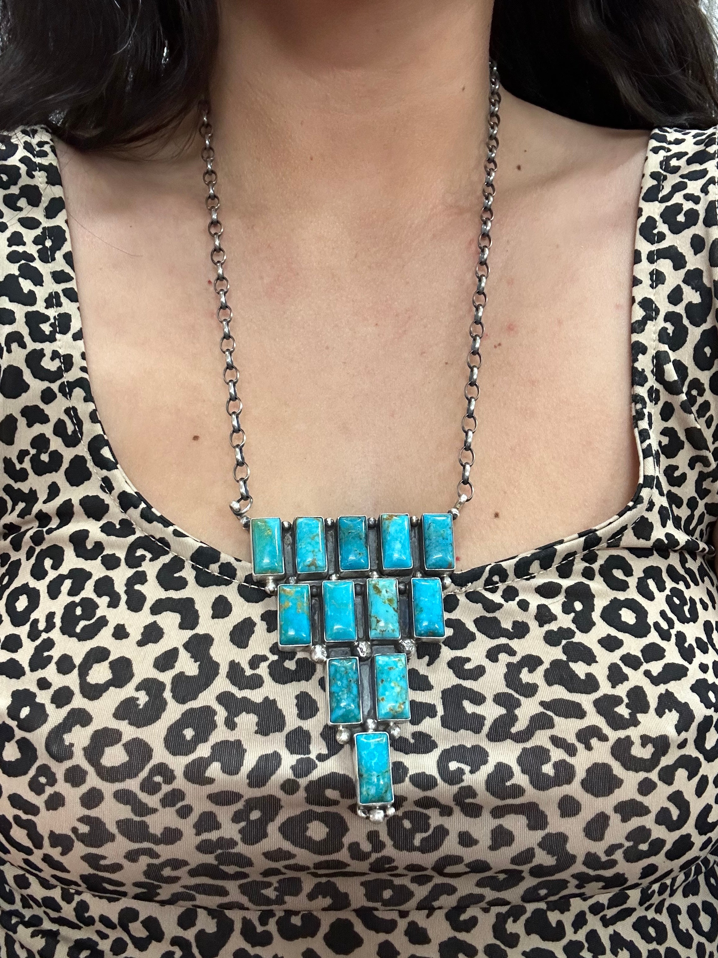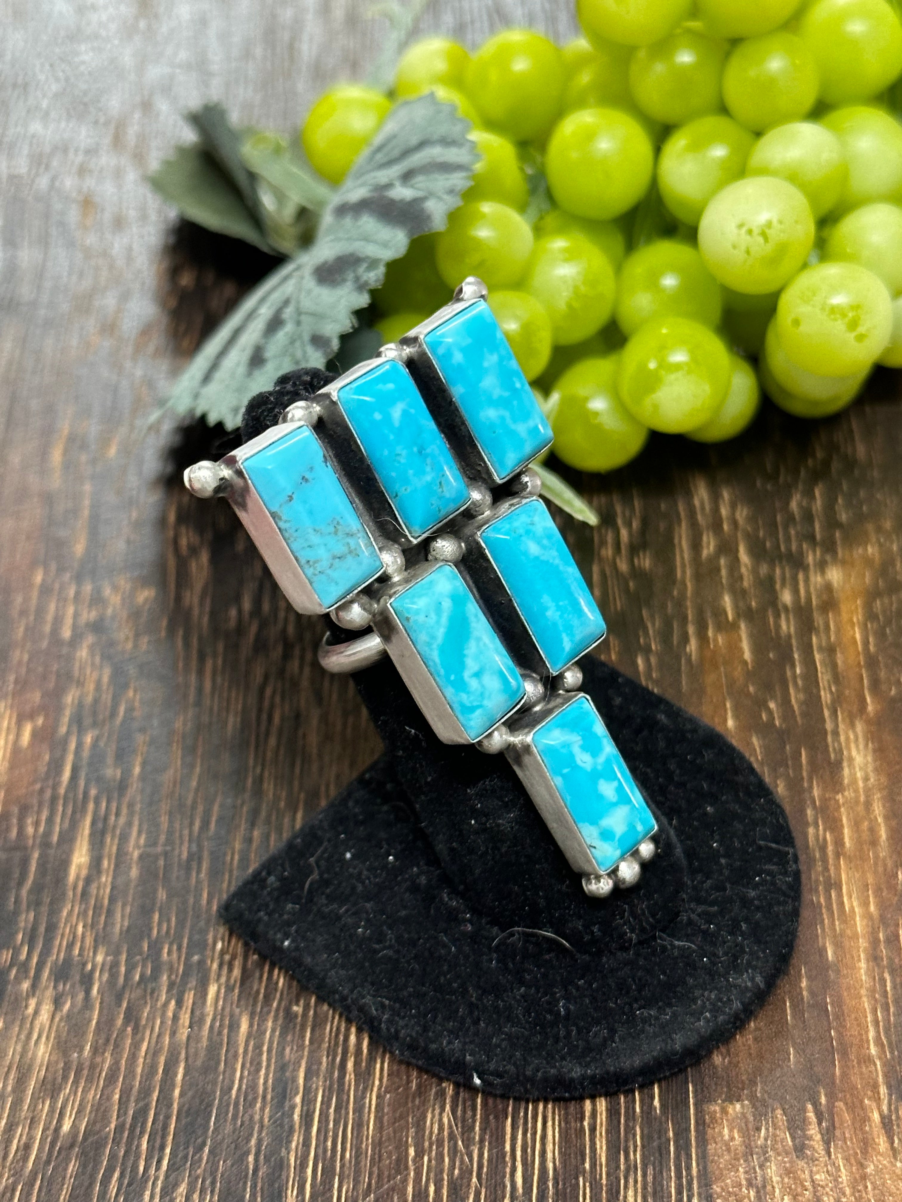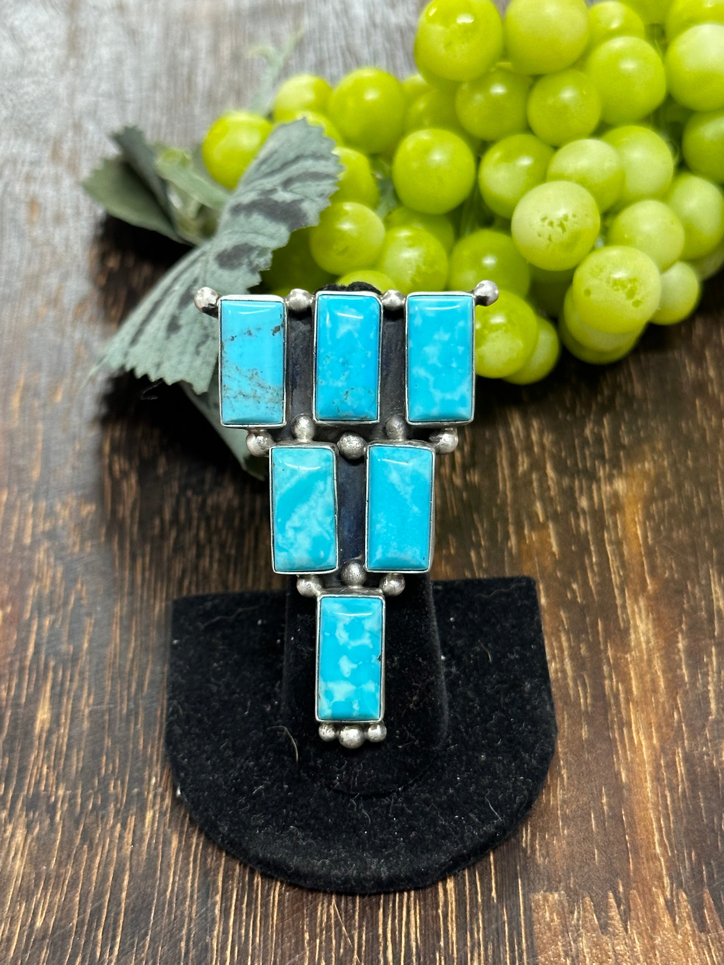 Beautiful Necklace and ring. Donovan Skeets Kingman Turquoise & Sterling Silver Cluster Necklace & Adjustable Ring Set. It measures 25 1/2 inches long with hang while the chain measures 19 inches long. The ring measures 2 1/4 inches long and 1 1/4 inches wide. Stamped sterling silver and signed by artist.