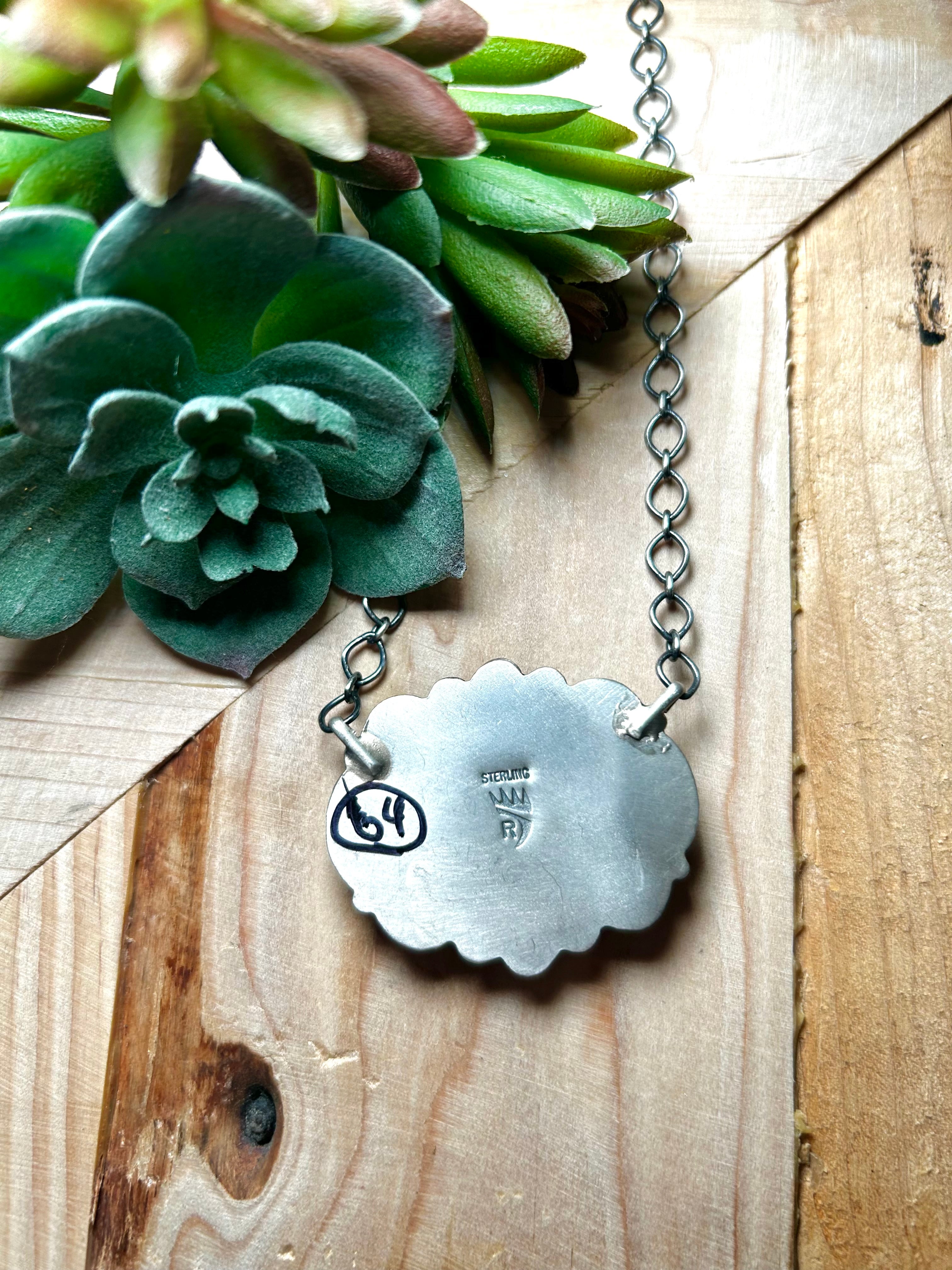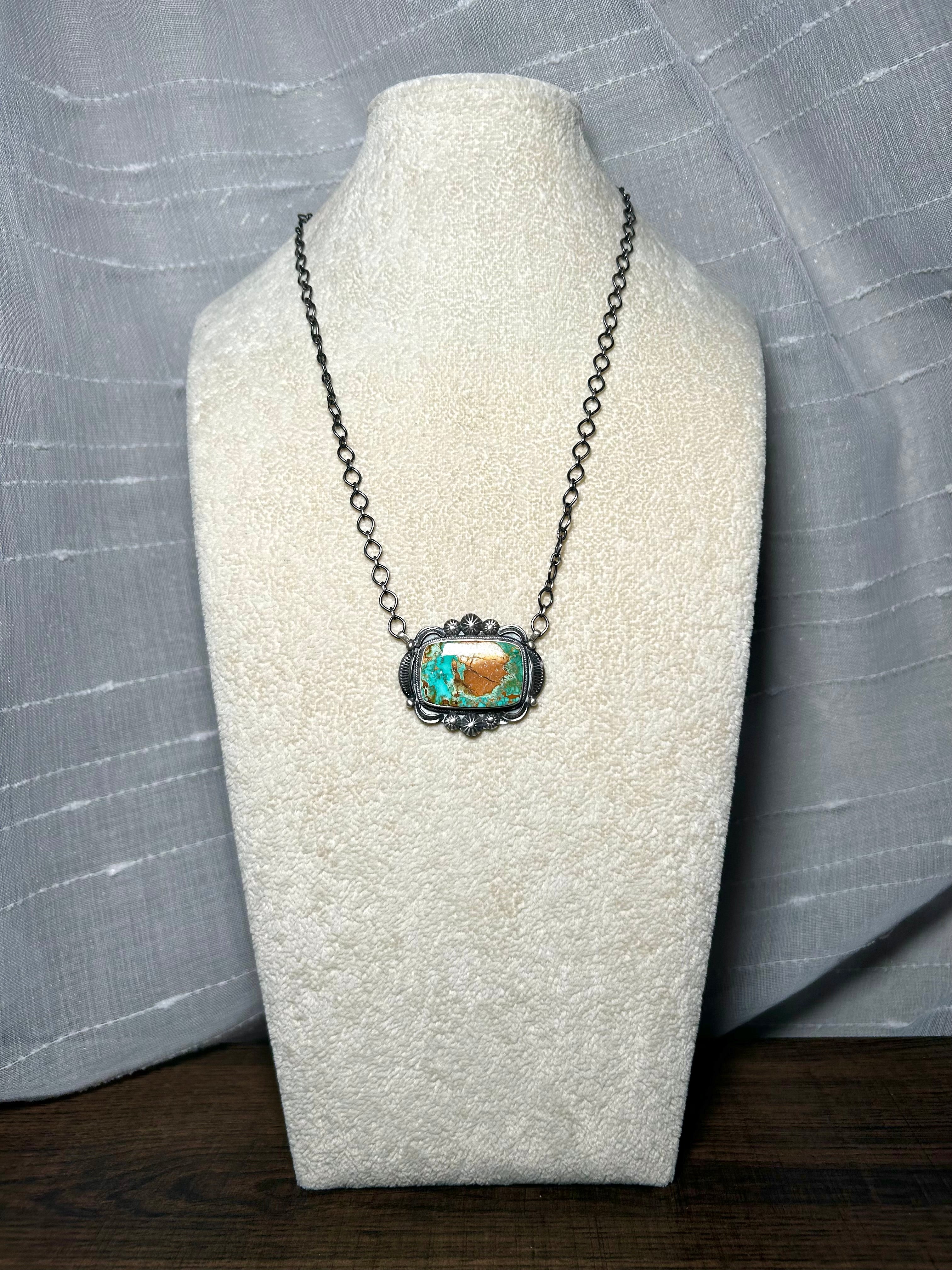 Bennie Ramone Royston Turquoise & Sterling Silver Necklace. It measures 20 3/4 inches long with hang while the chain by itself measures 18 inches long. Signed by the artist and stamped sterling silver.