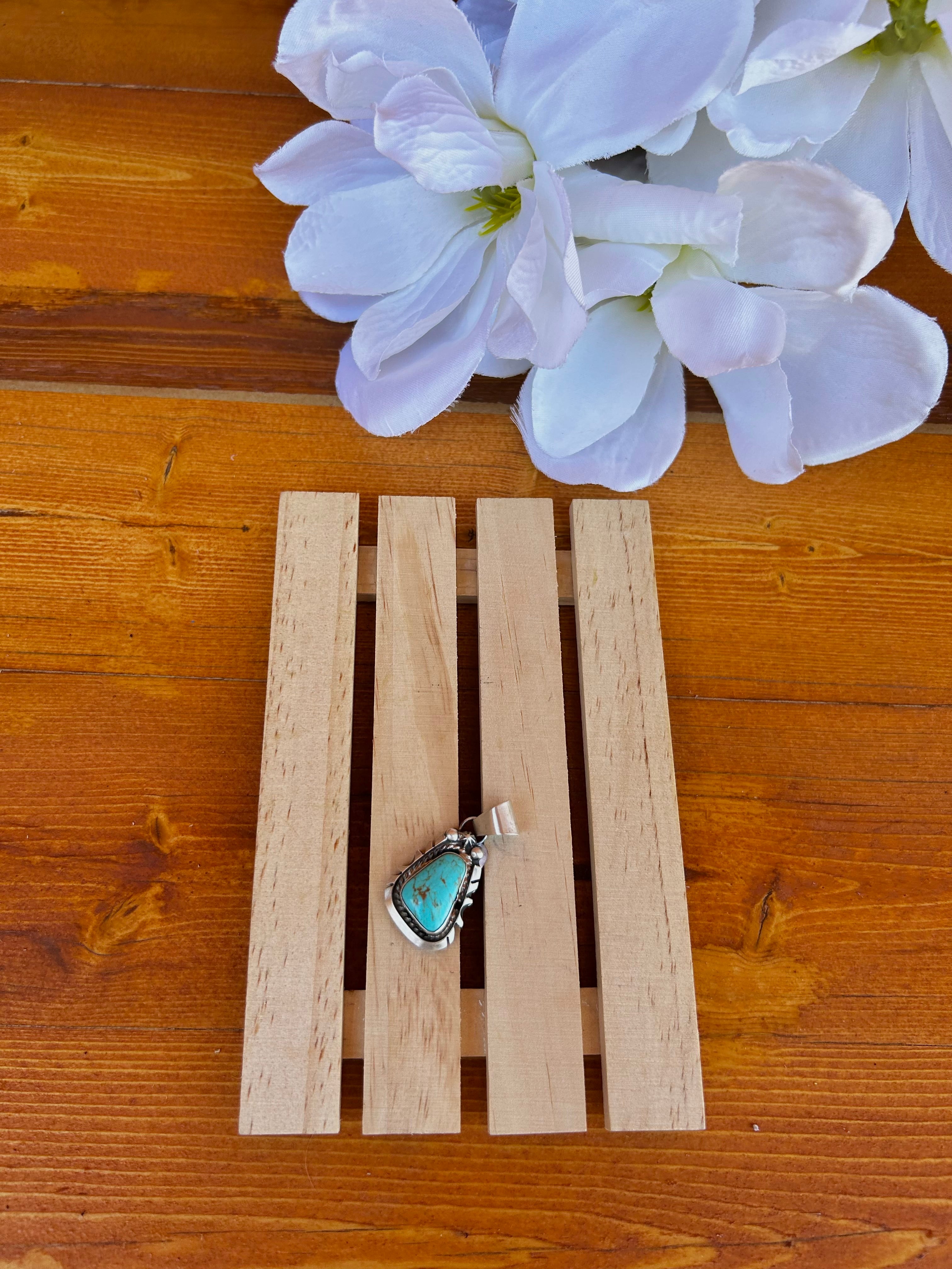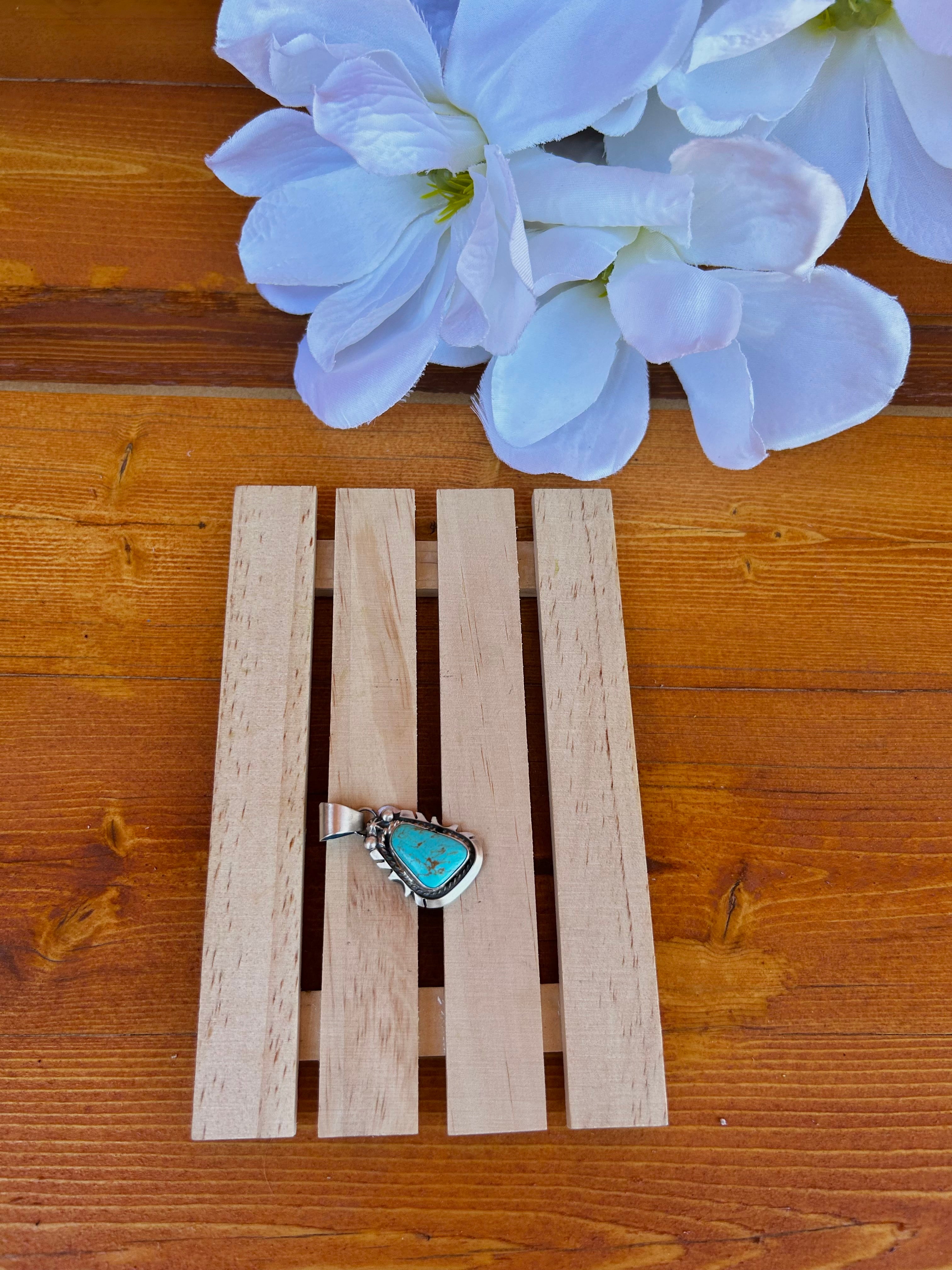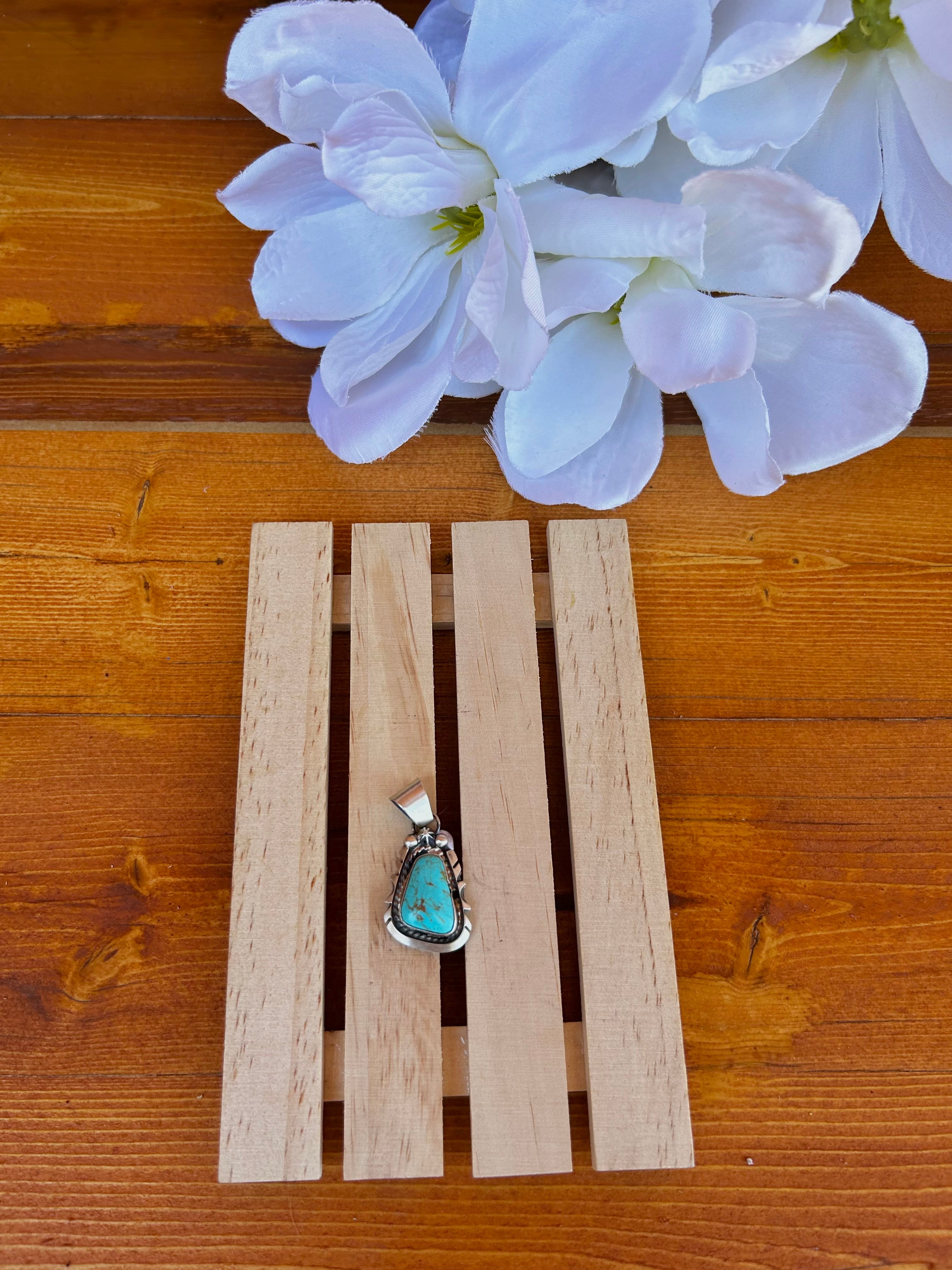 Donovan Skeets Kingman Turquoise & Sterling Silver Pendant. It measures 1 1/2 inches long and 5/8 of an inch wide. Pendant Only. Signed by the artist and stamped sterling silver.
