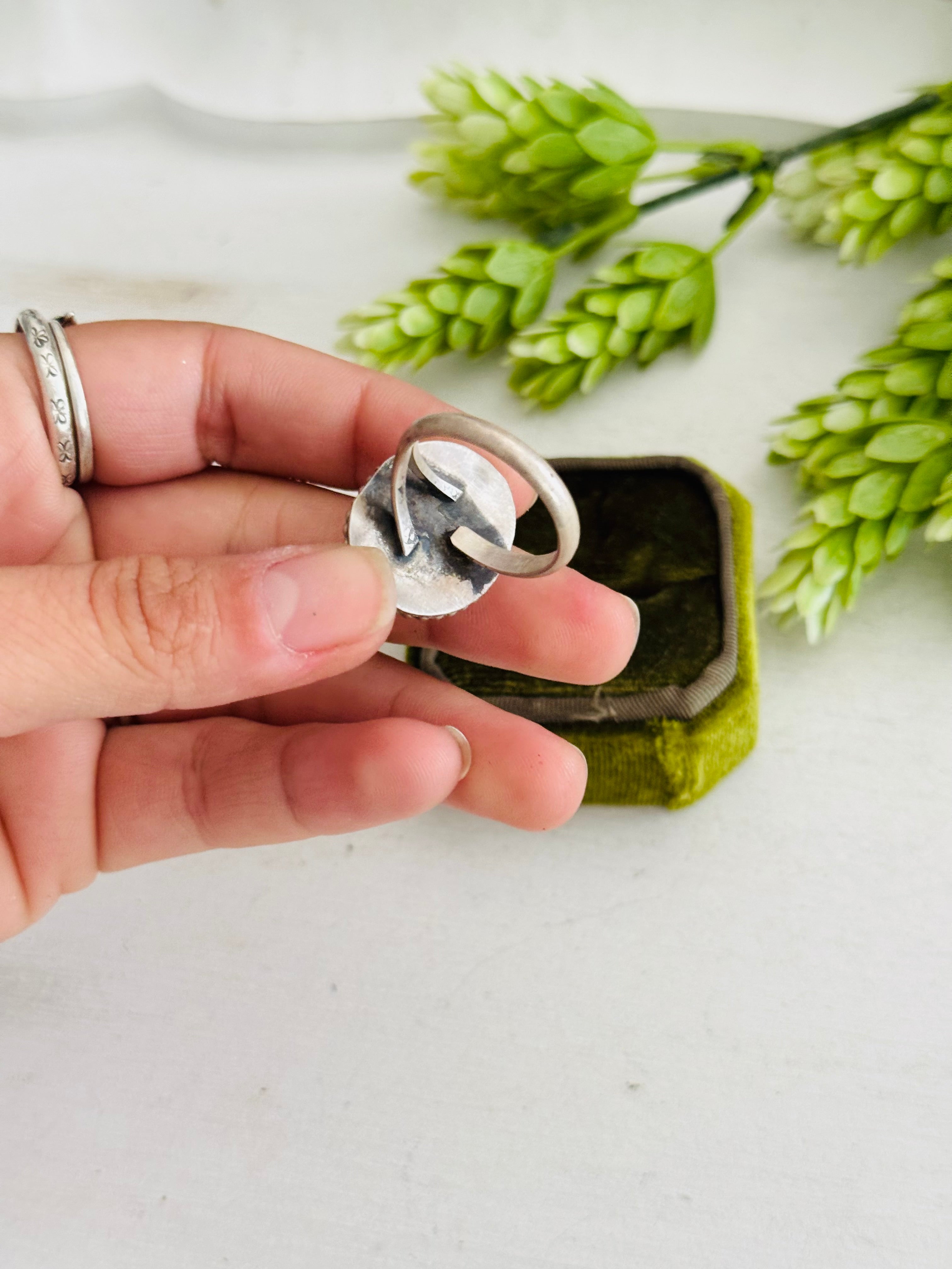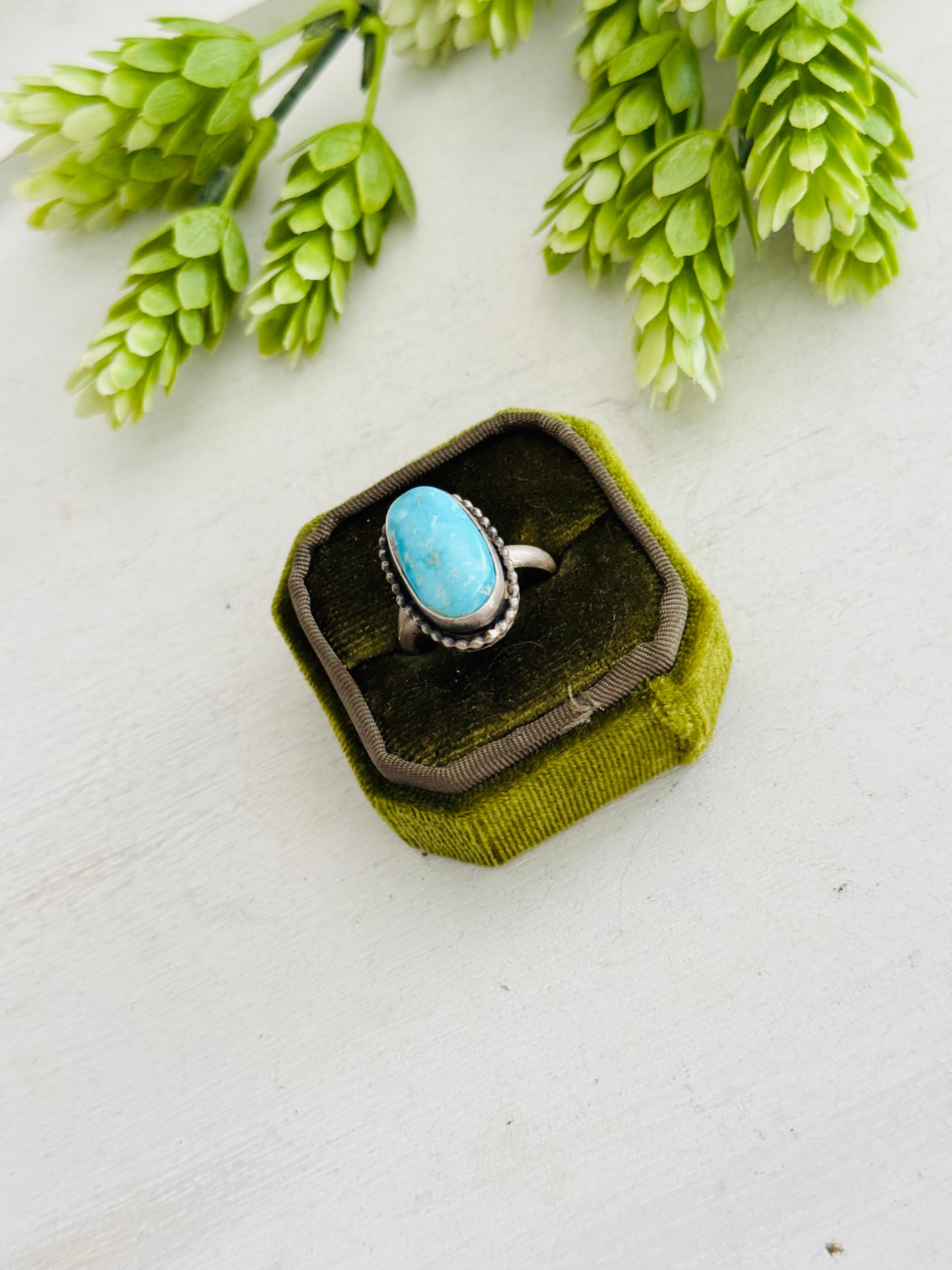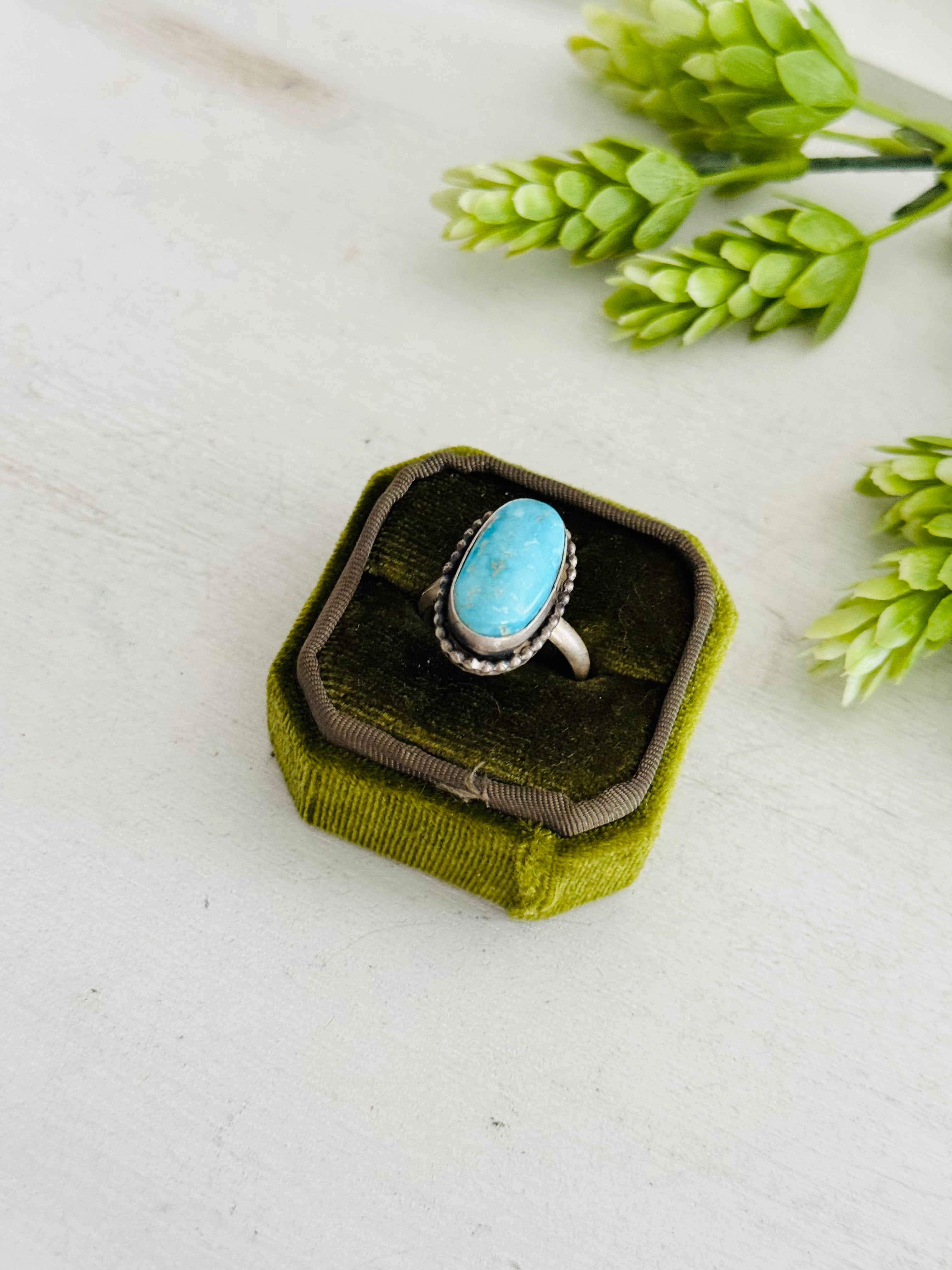 Eli Skeets Blue Ridge Turquoise & Sterling Silver Adjustable Ring. It measures 1 inch long and 5/8 of an inch wide. Signed by the artist and stamped sterling silver.