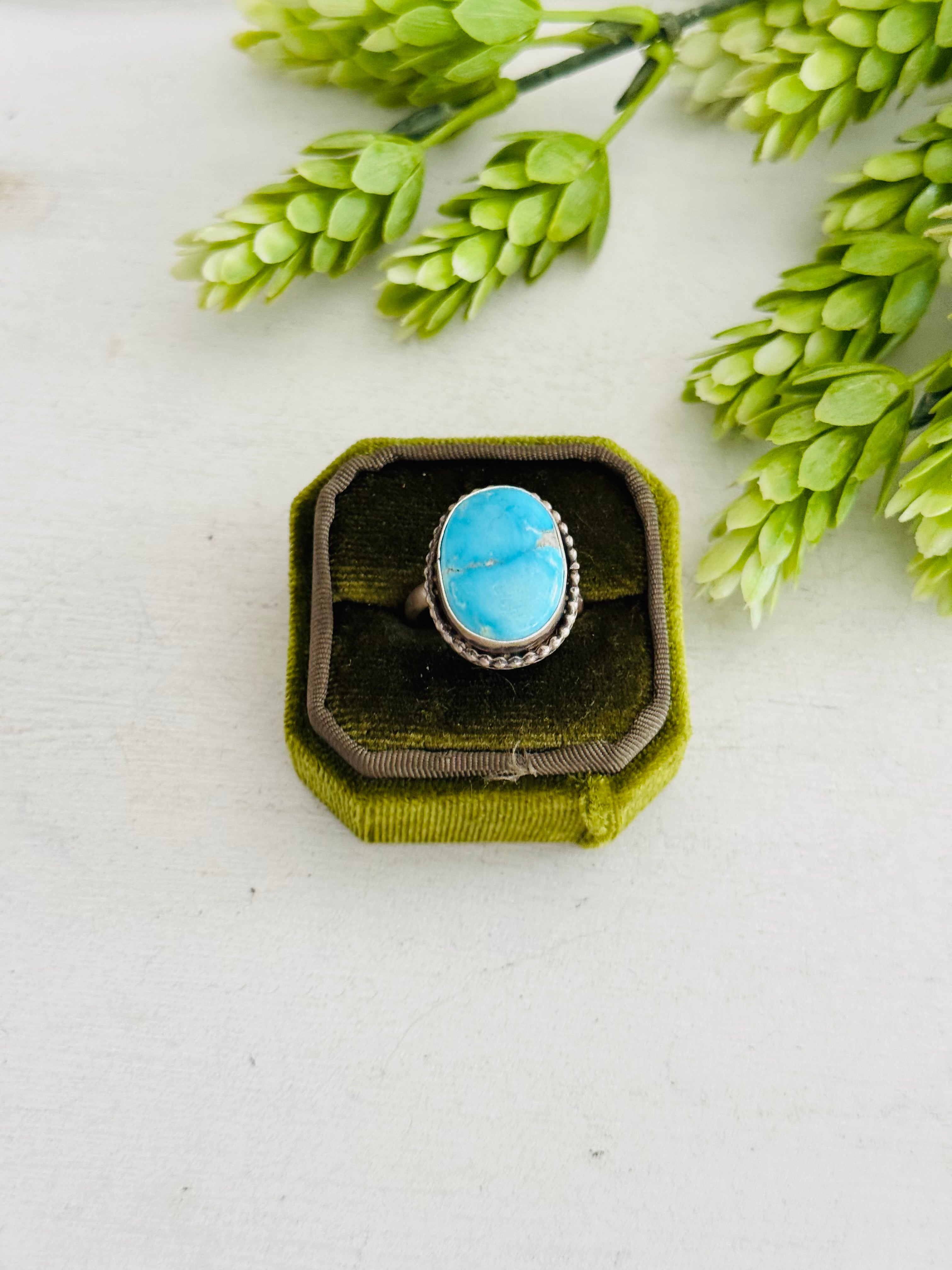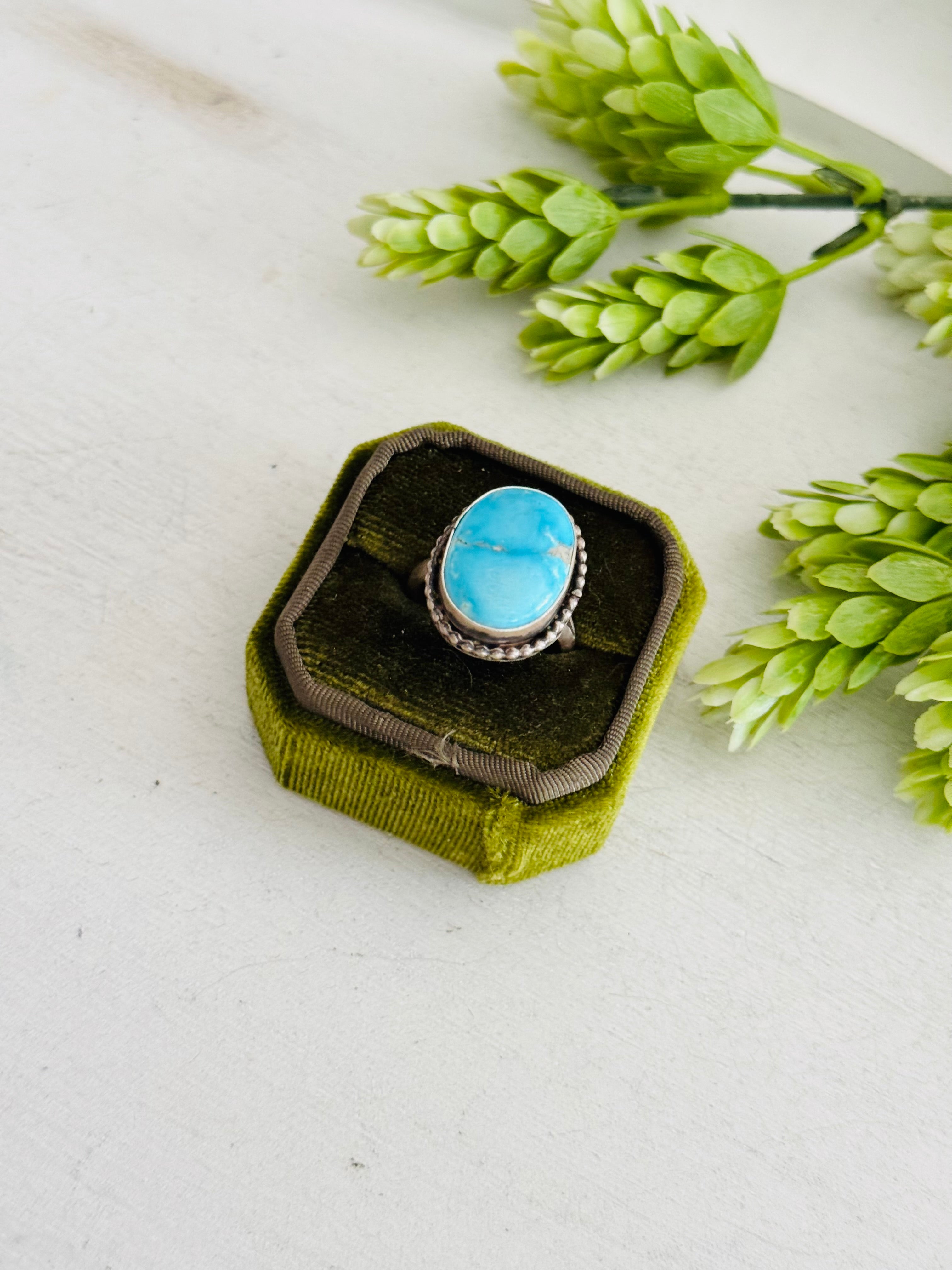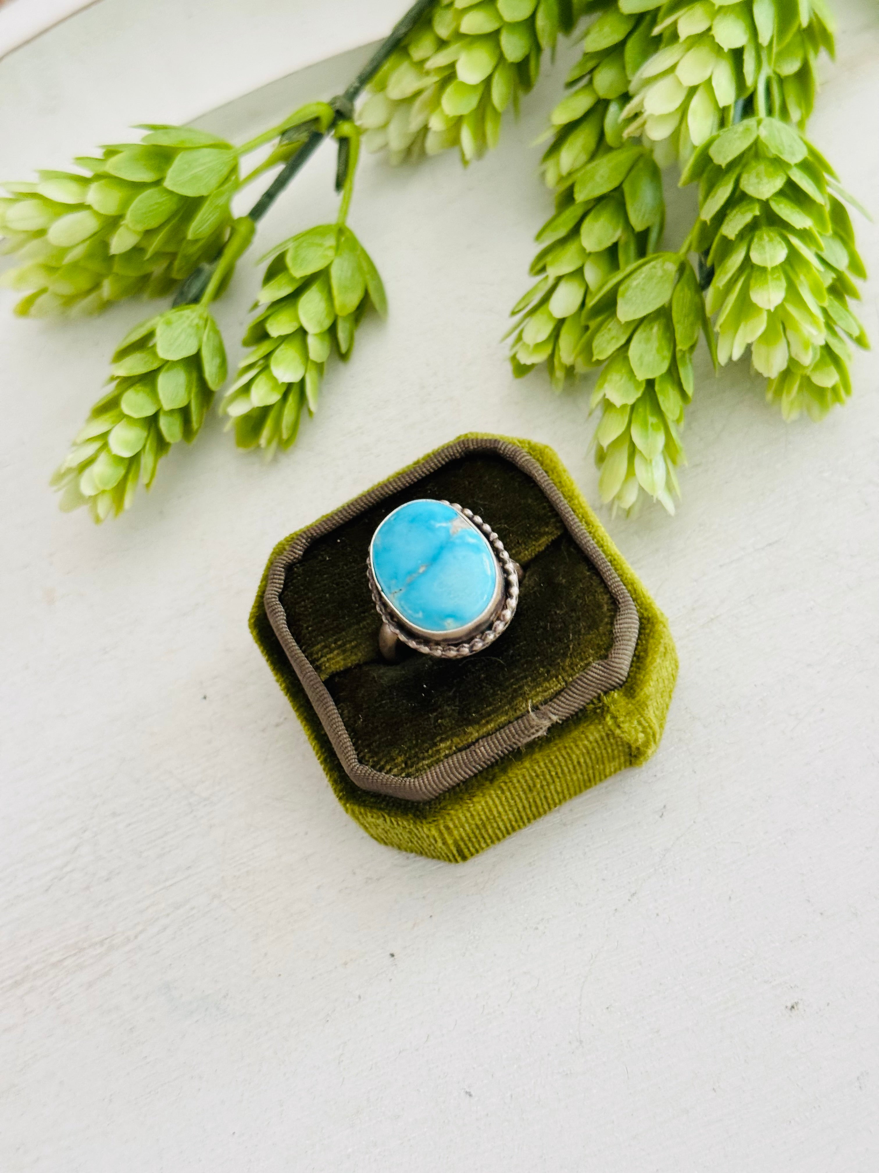 Eli Skeets Blue Ridge Turquoise & Sterling Silver Adjustable Ring. It measures 1 inch long and 3/4 of an inch wide. Signed by the artist and stamped sterling silver.
