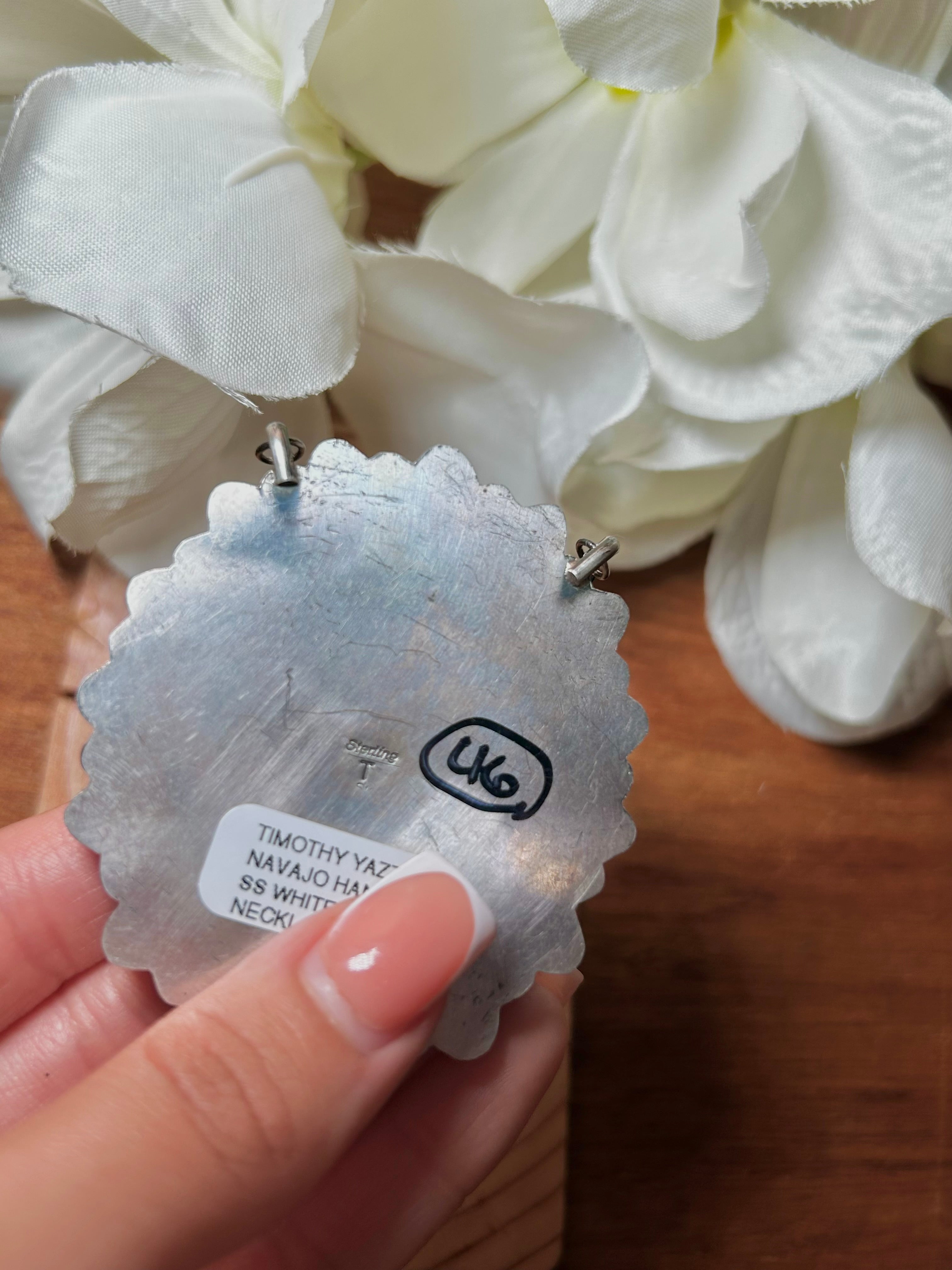 Timothy Yazzie White Buffalo and Sterling Silver Necklace. It measures 24 inches long with hang while the chain measures 19 inches long. Signed by the artist and stamped sterling silver.