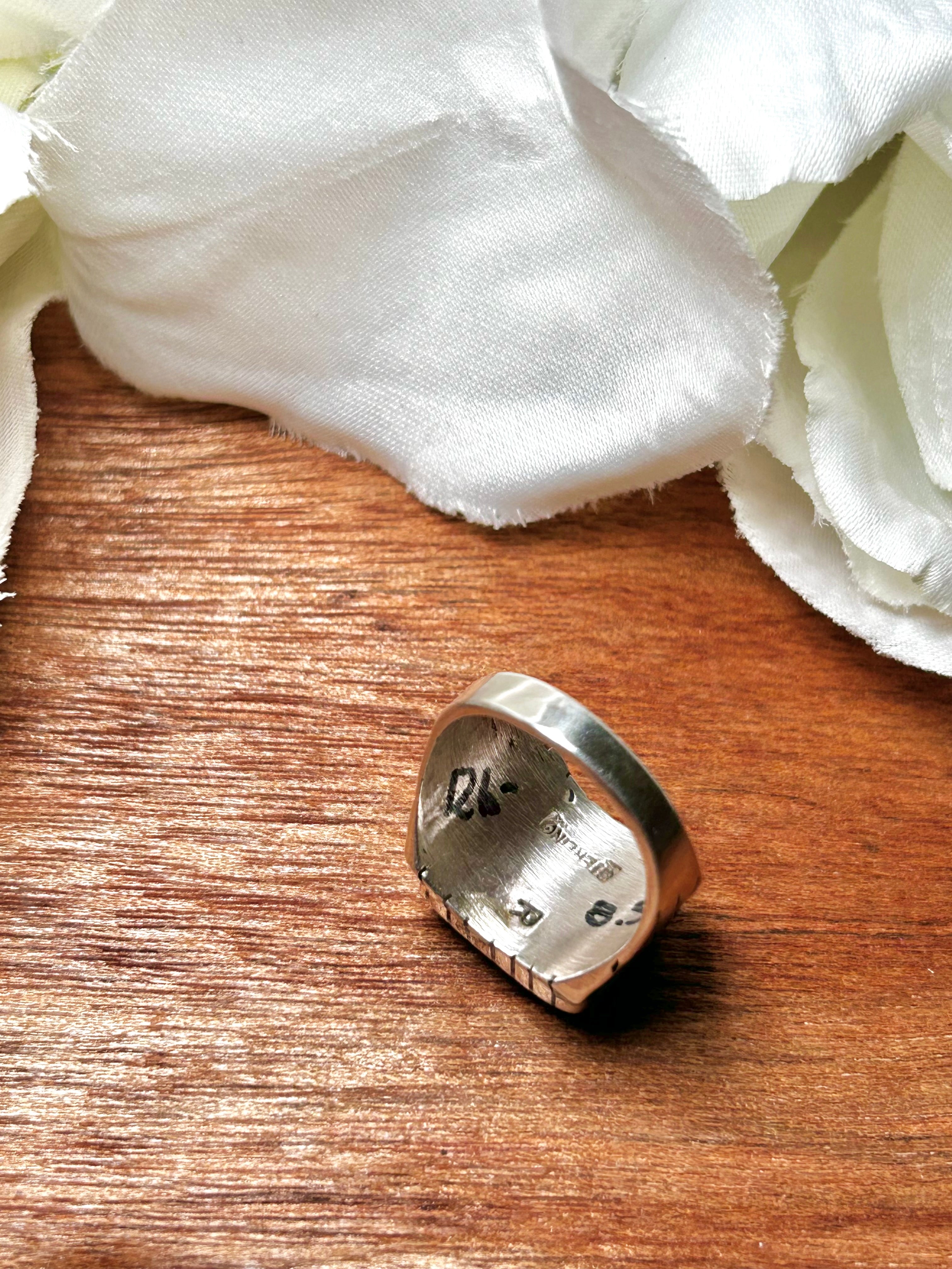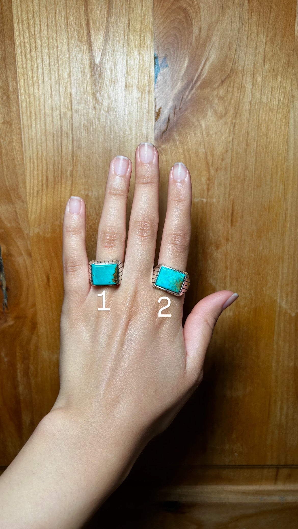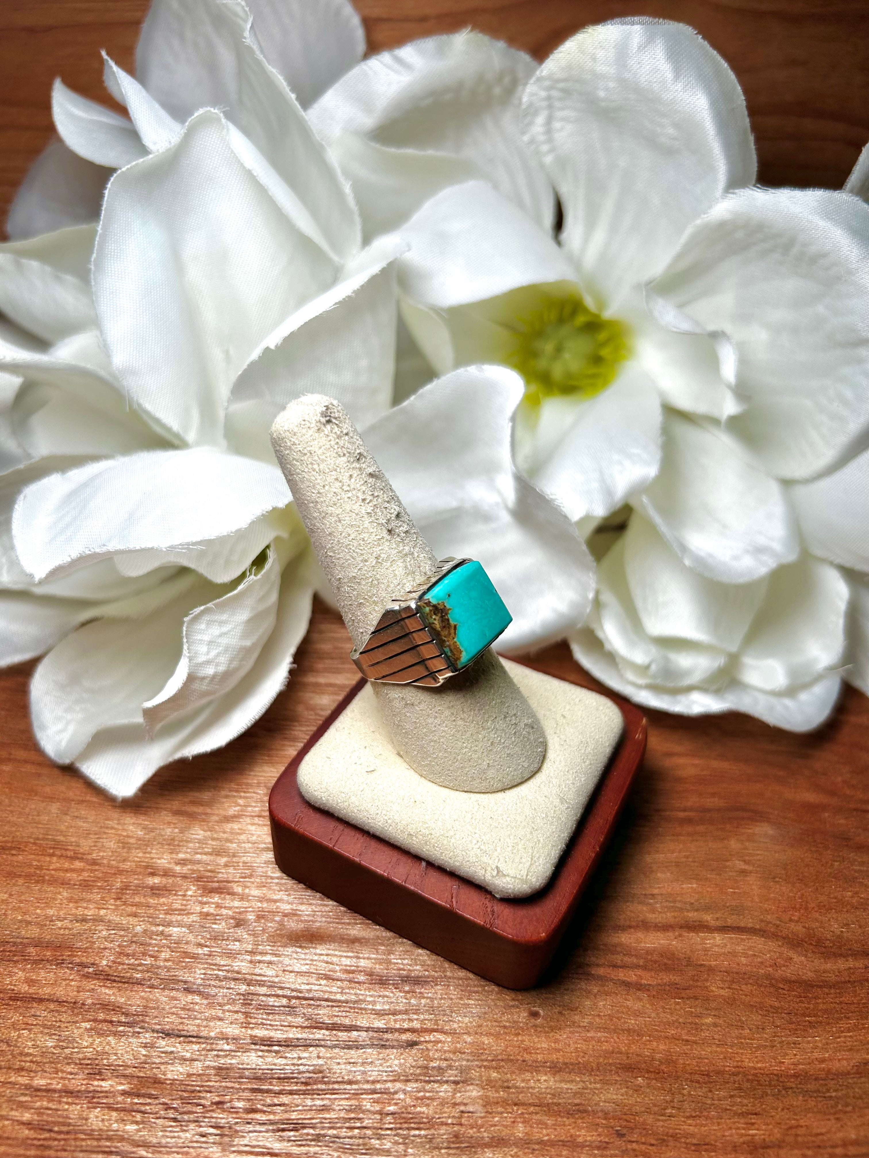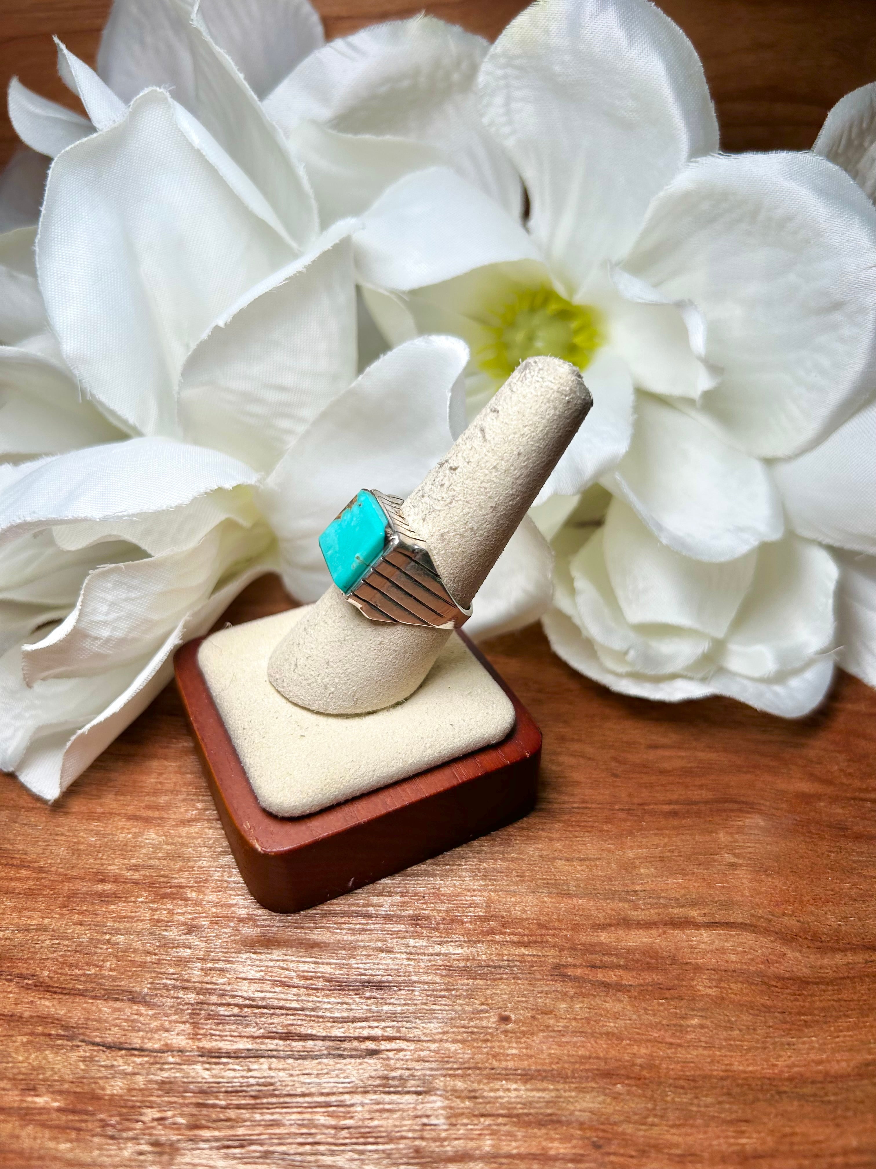 Ray Jack Kingman Turquoise & Sterling Silver Cluster Ring. It measures just over 5/8!of an inch long and it measures 5/8 of an inch wide. Signed by the artist and stamped sterling silver.