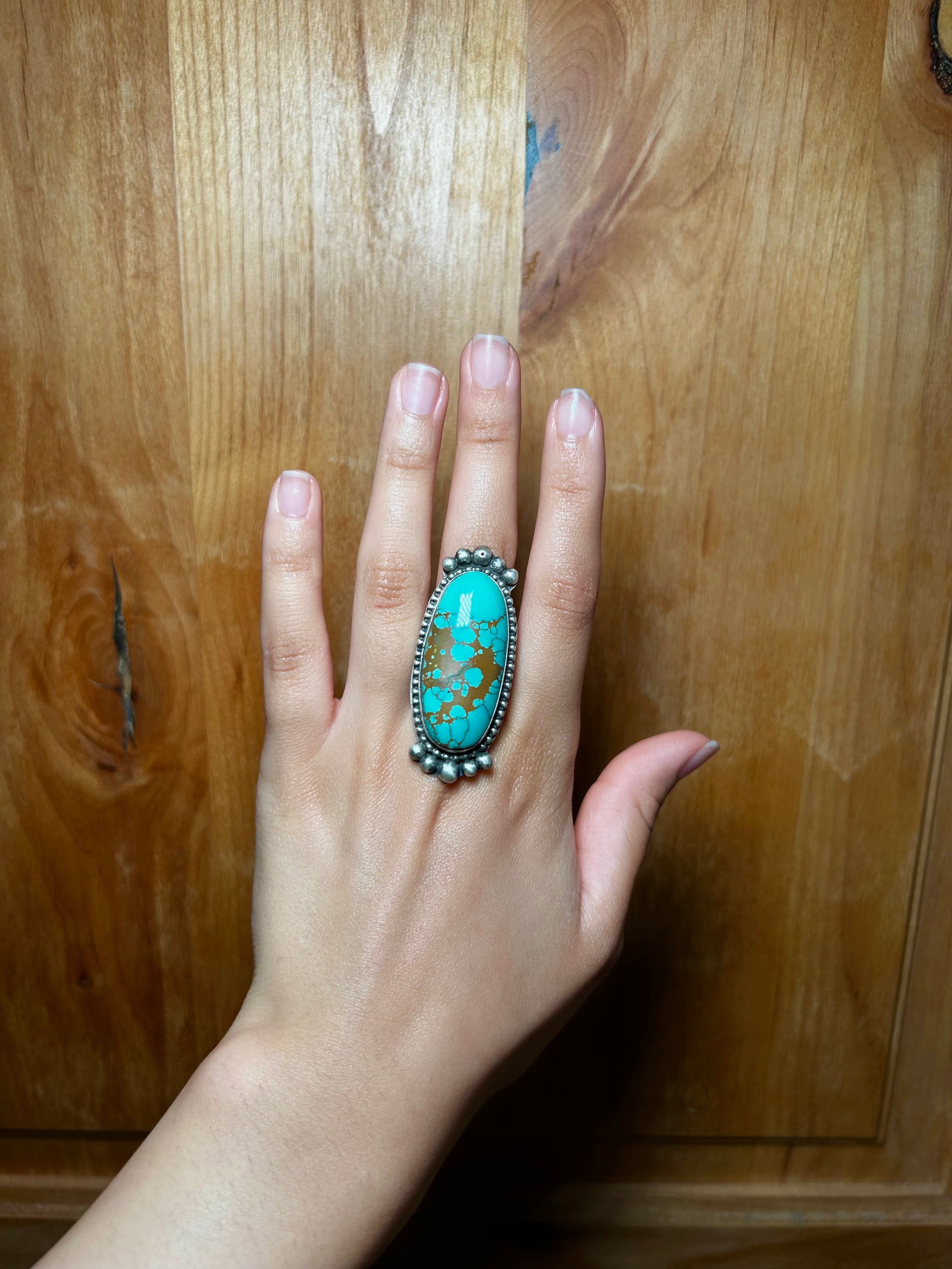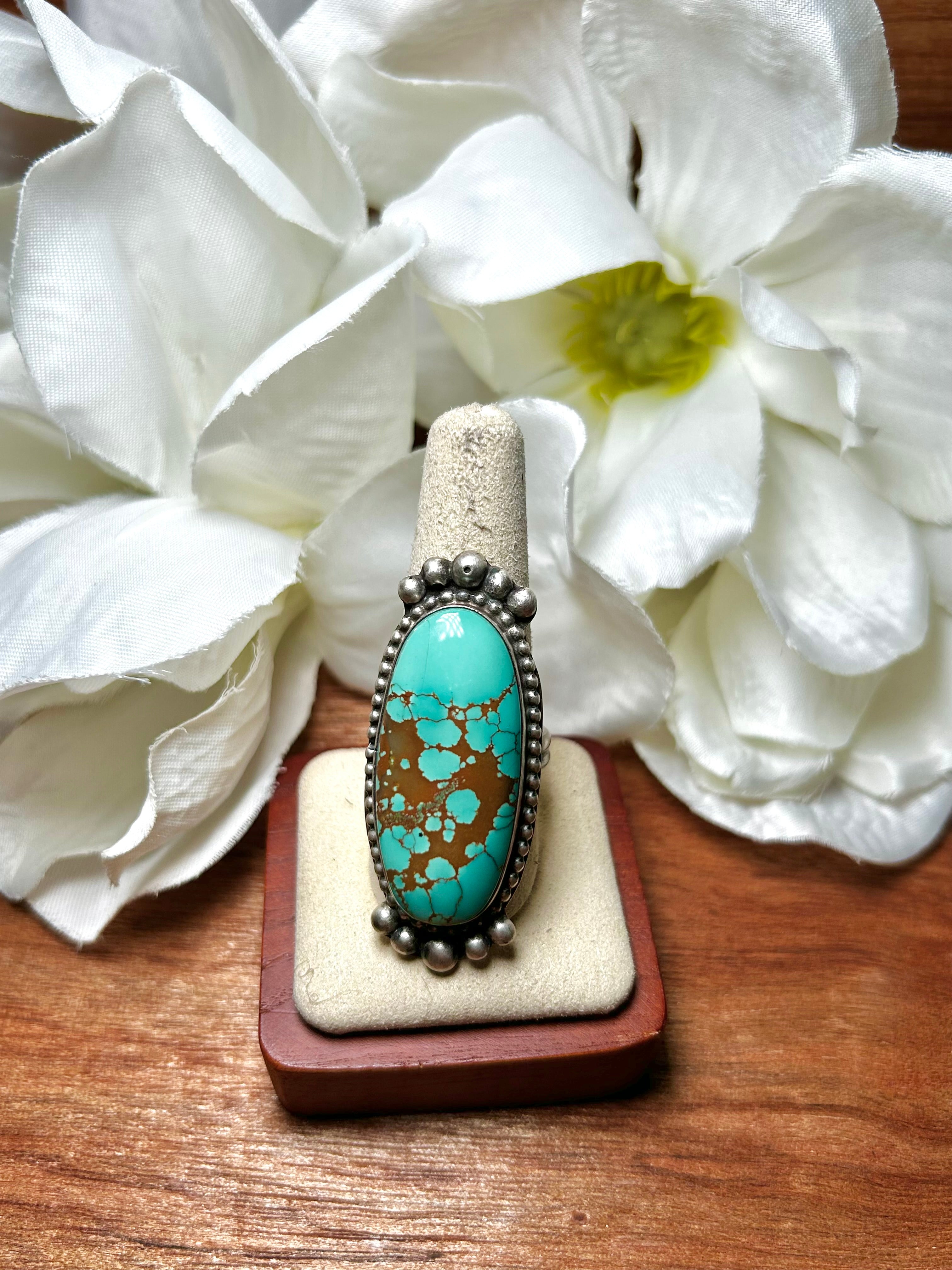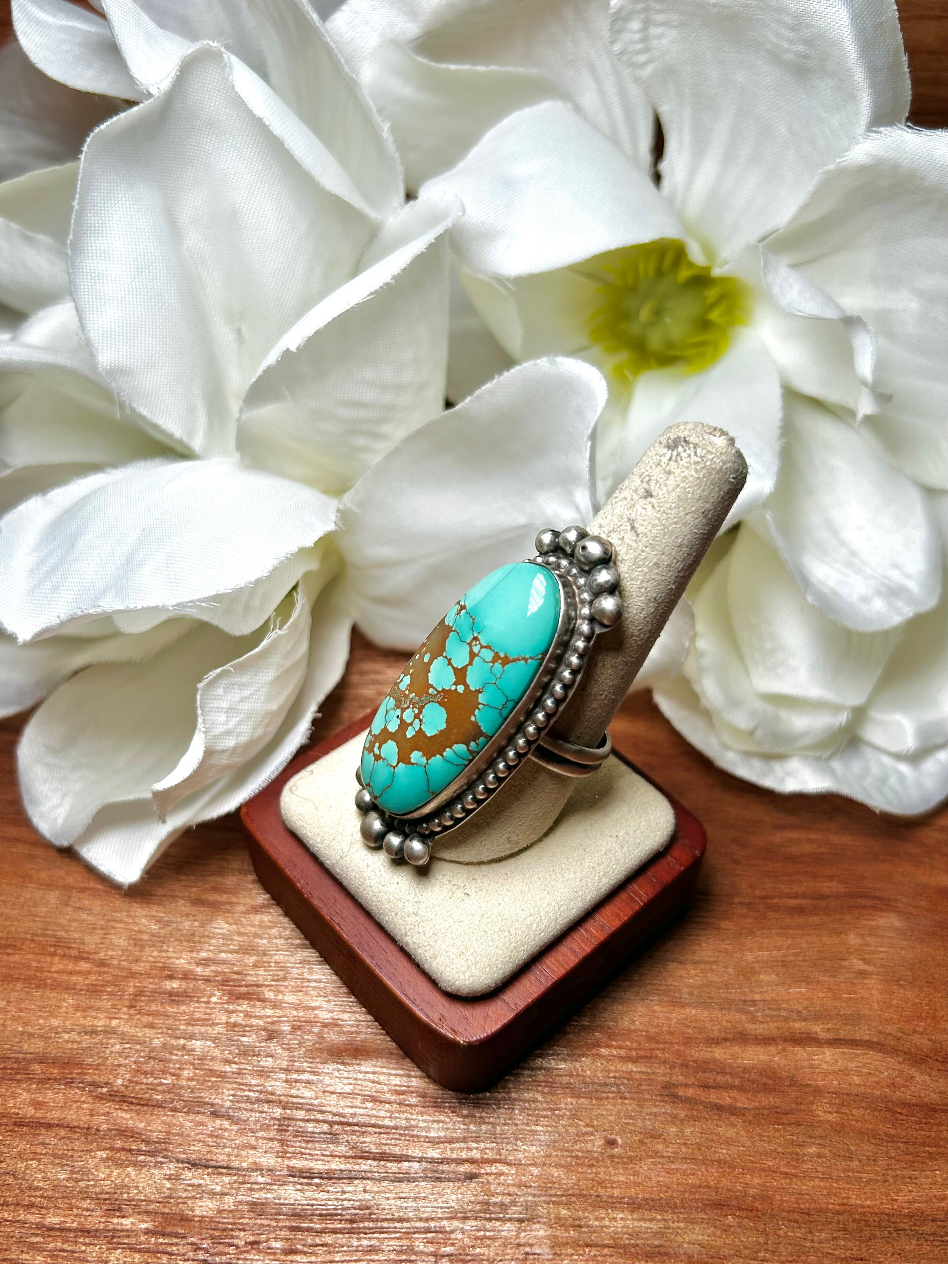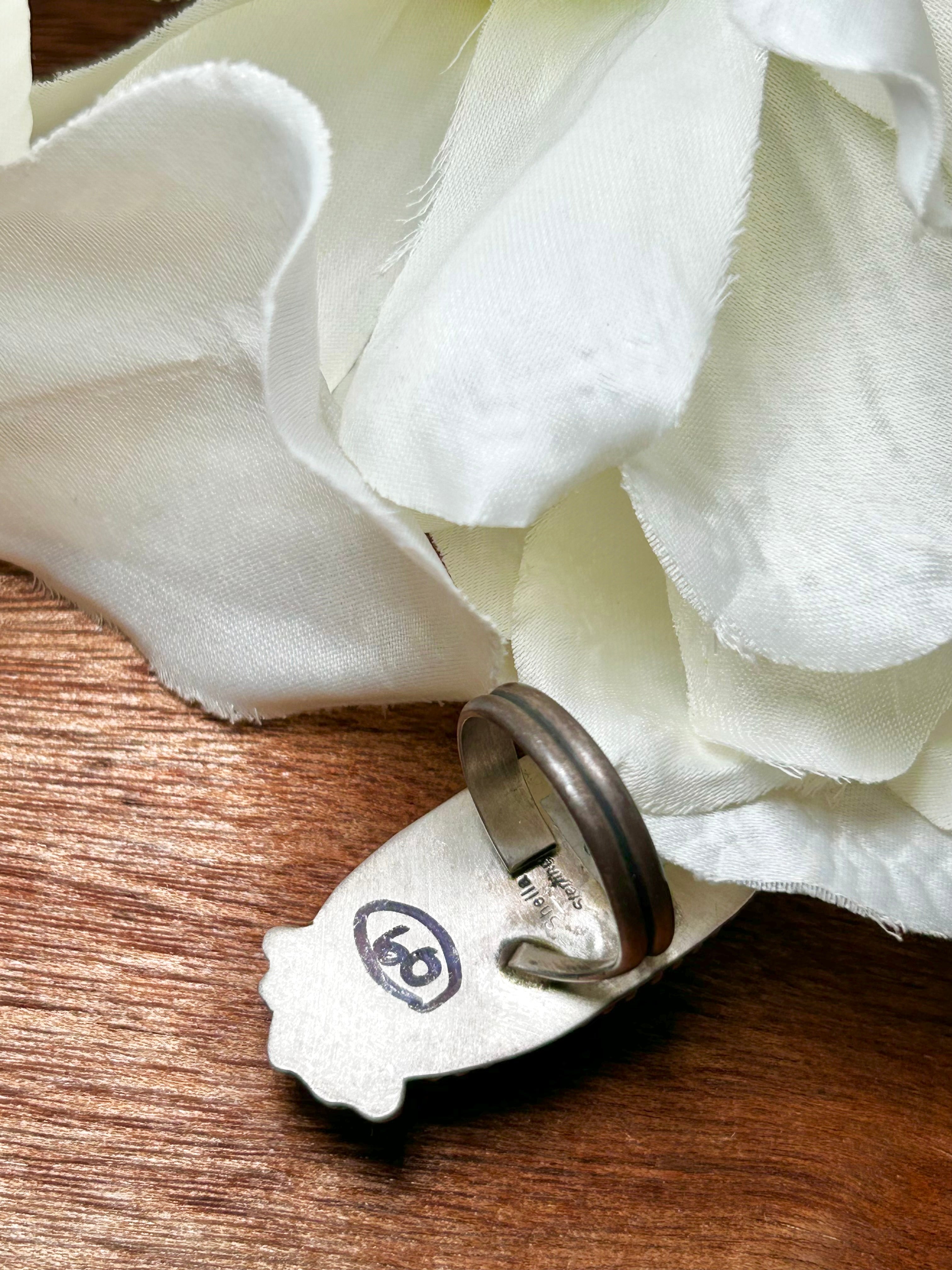 Sheila Becenti Pilot Mountain Turquoise & Sterling Silver Cluster Adjustable Ring. It measures 2 inches long and it measures 7/8 of an inch wide. Signed by the artist and stamped sterling silver.