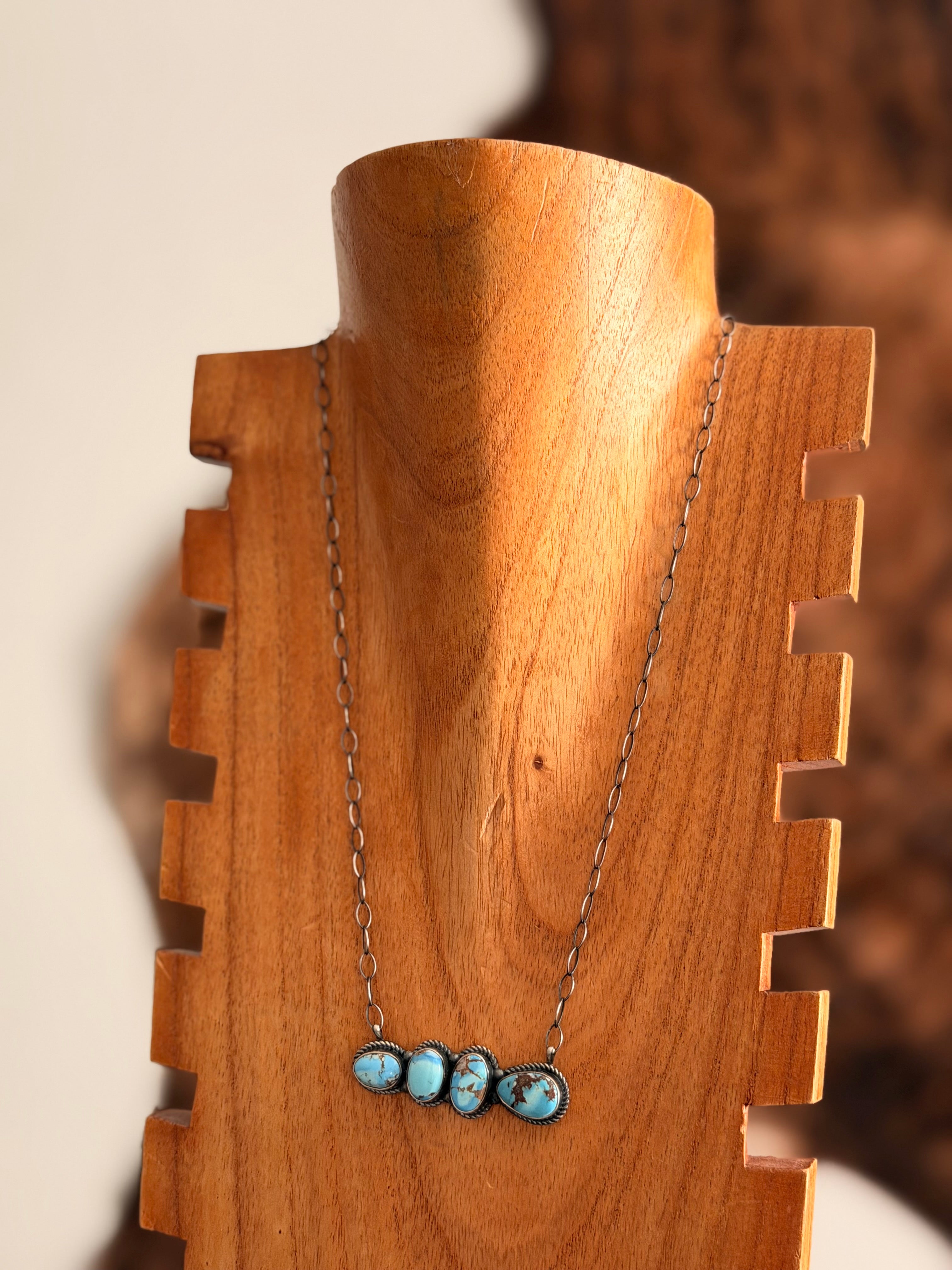 Eli Skeets Golden Hills Turquoise & Sterling Silver Bar Necklace. It measures 20 inches long with hang while the chain measures 19 inches long. Signed by the artist and stamped sterling silver.