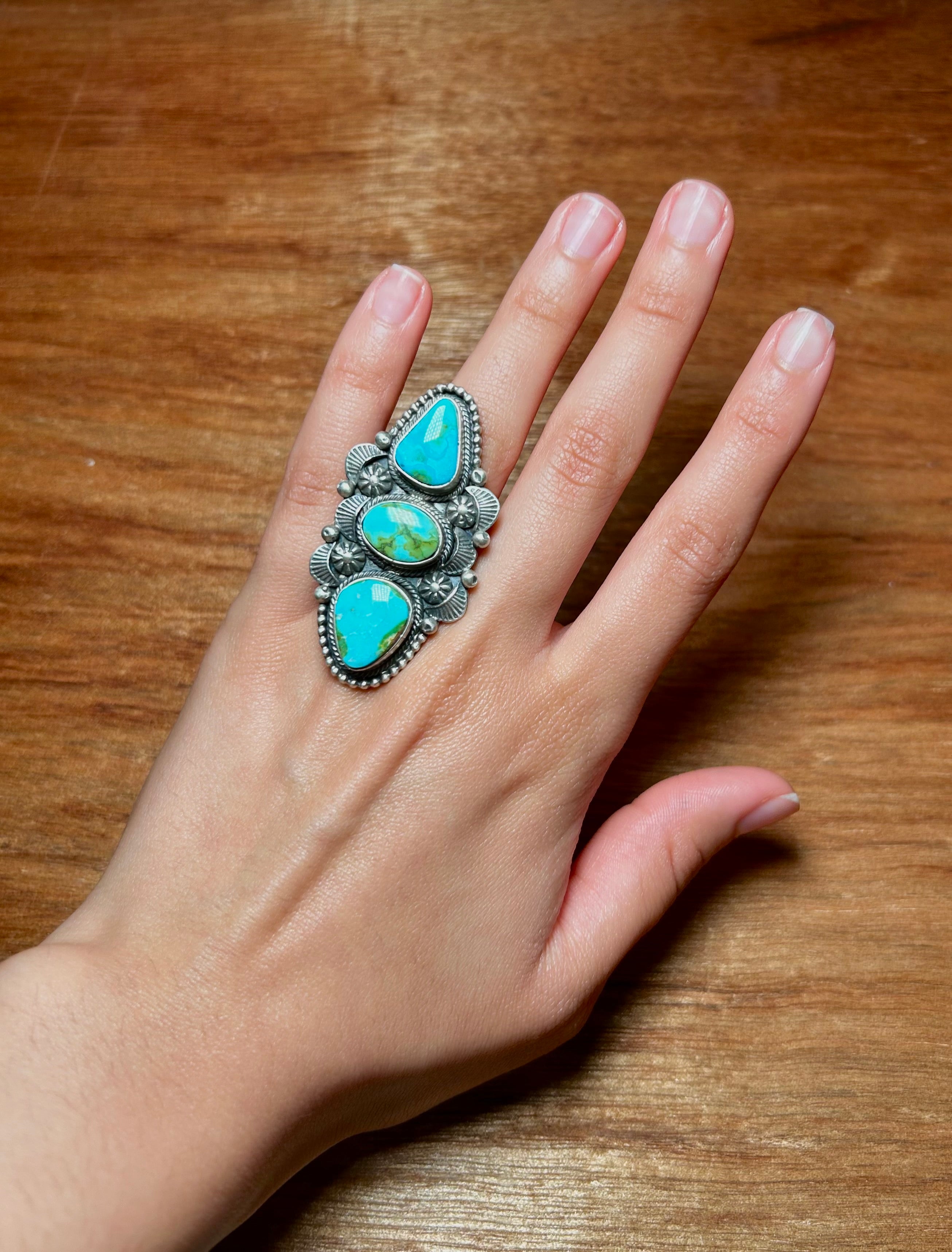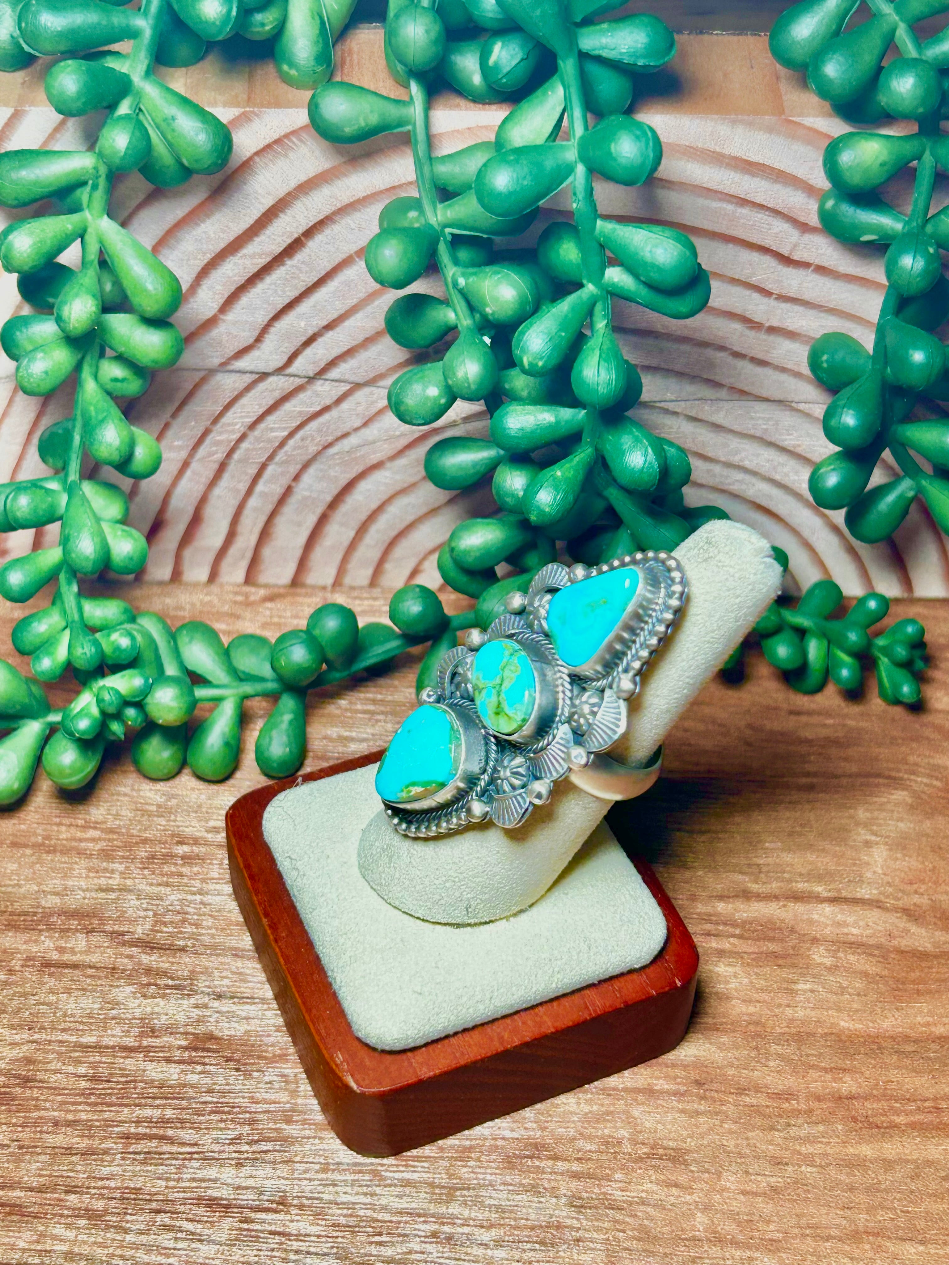 Eli Skeets Made Sonoran Mountain Turquoise & Sterling Silver Ring Size 7.5. It measures 2 inches long and 1 inch wide. Signed by the artist and stamped sterling silver.