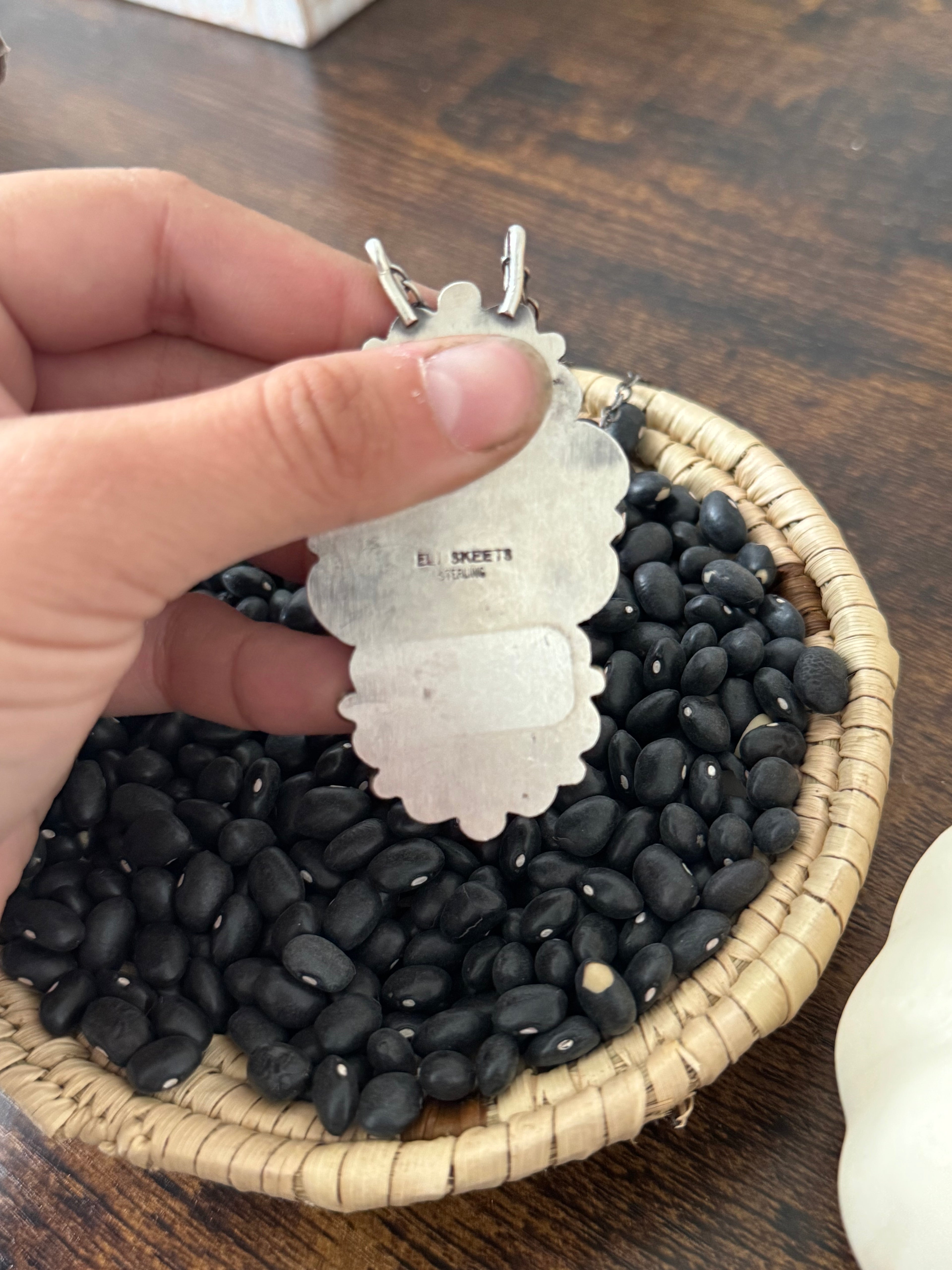 Eli Skeets Sonoran Mountain Turquoise & Sterling Silver Cluster Necklace. It measures 24 1/2 inches long with hang while the chain by itself measures 19 inches long. Signed by the artist and stamped sterling silver.