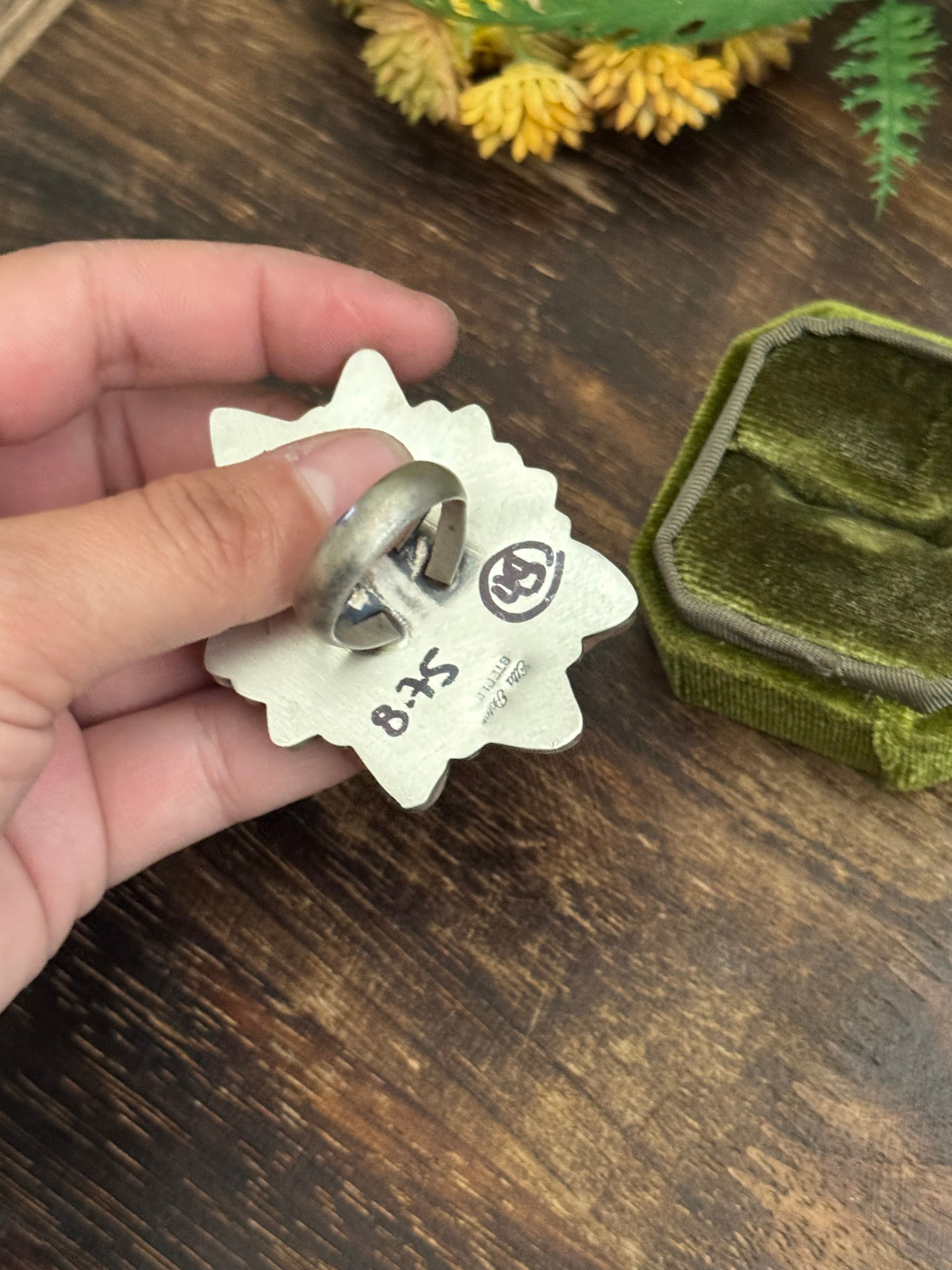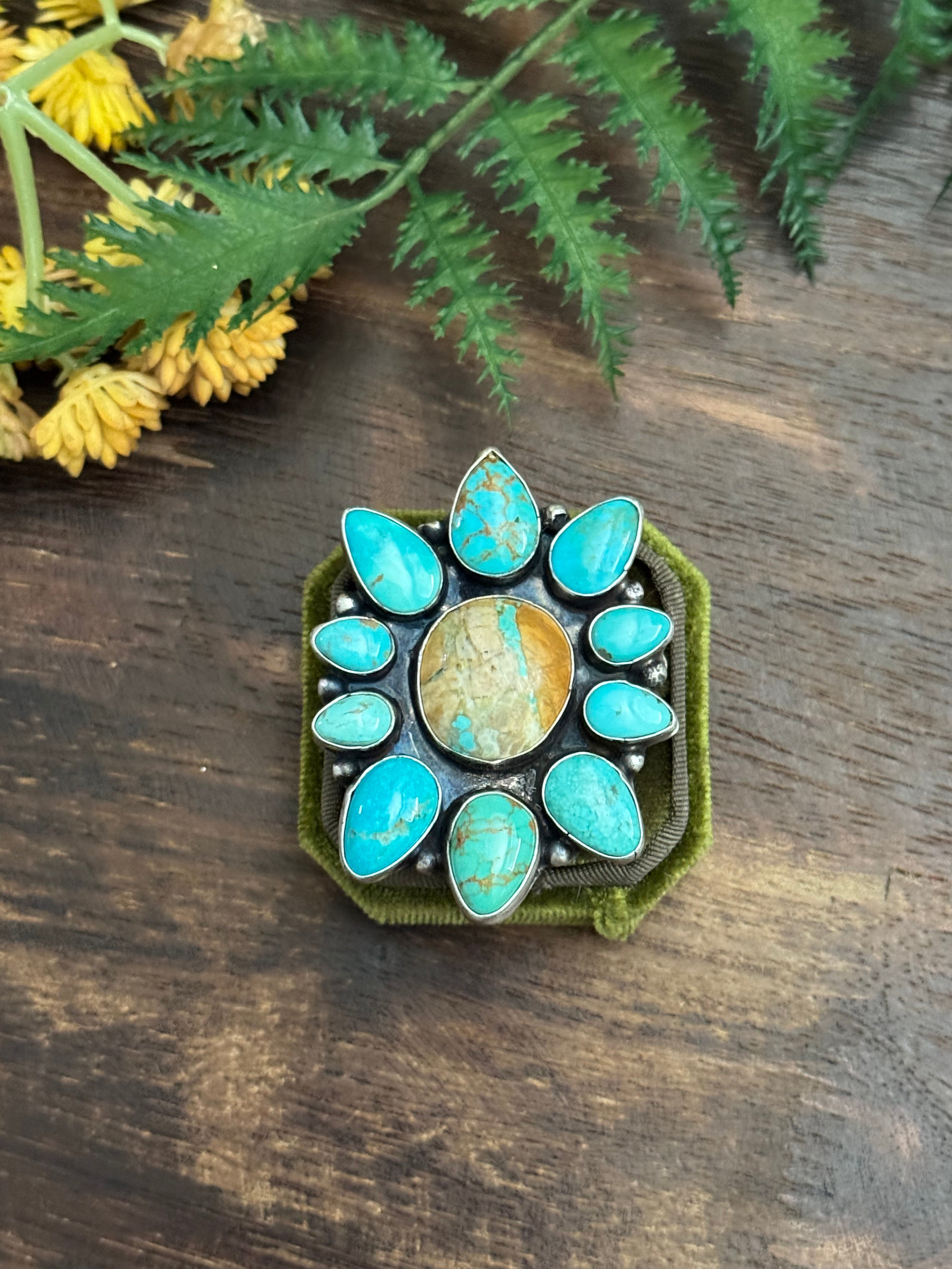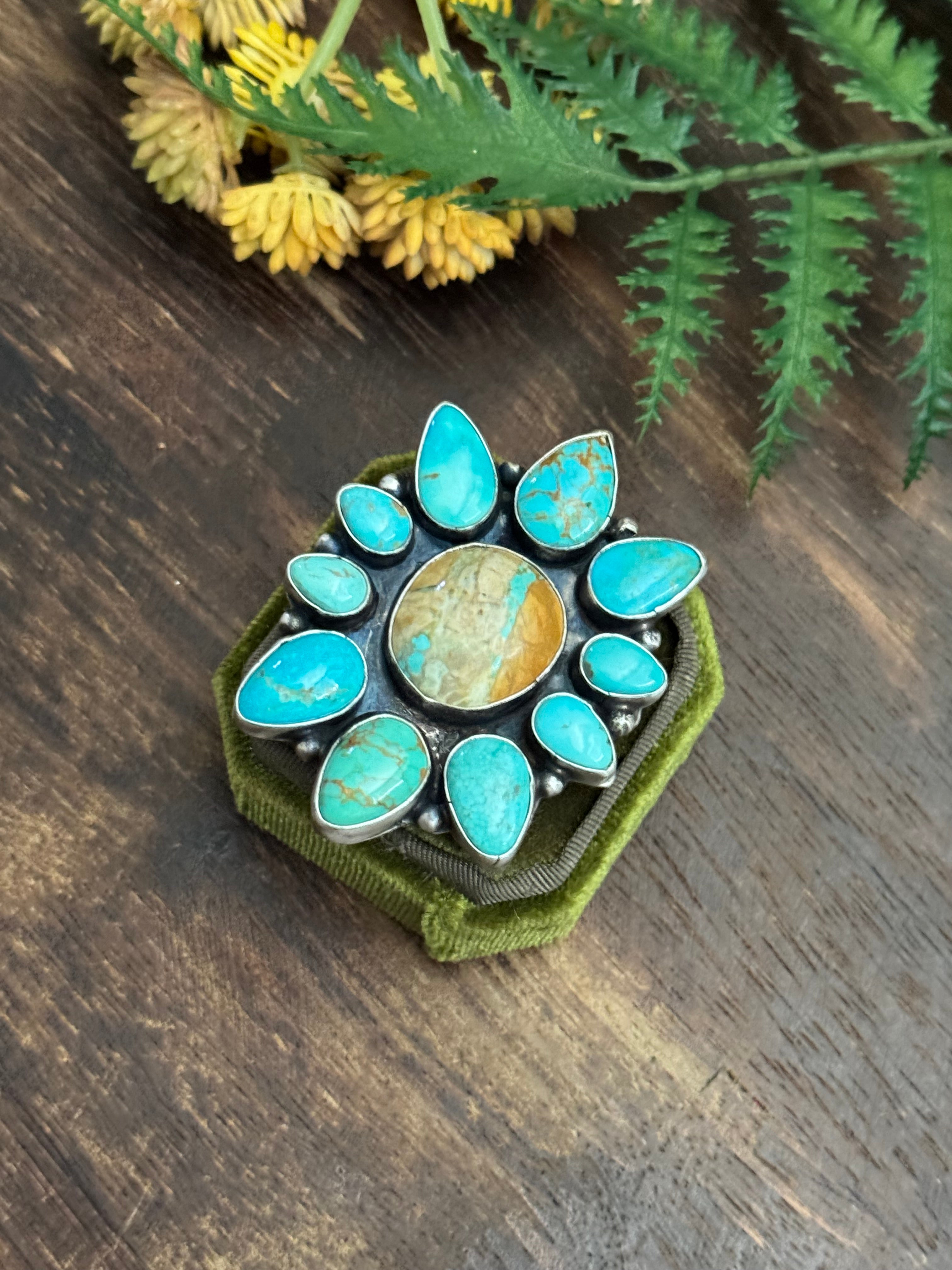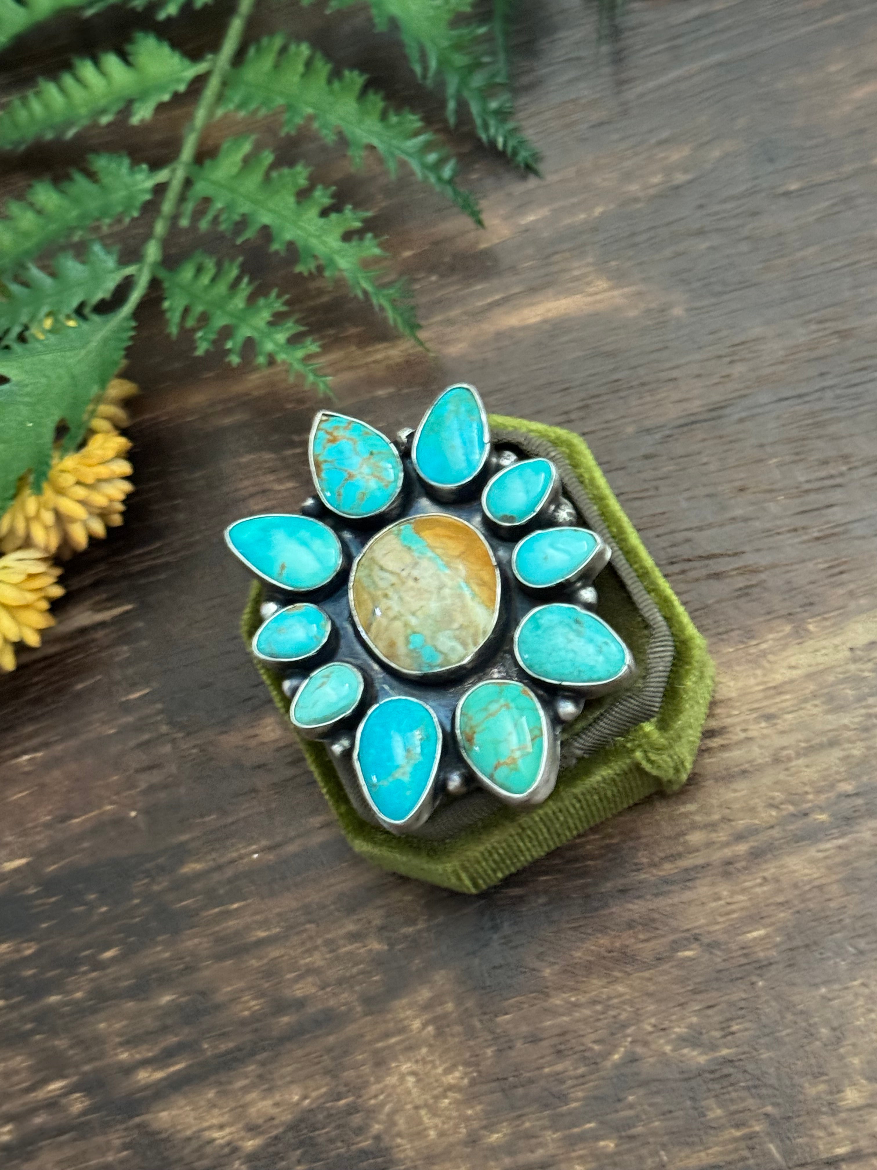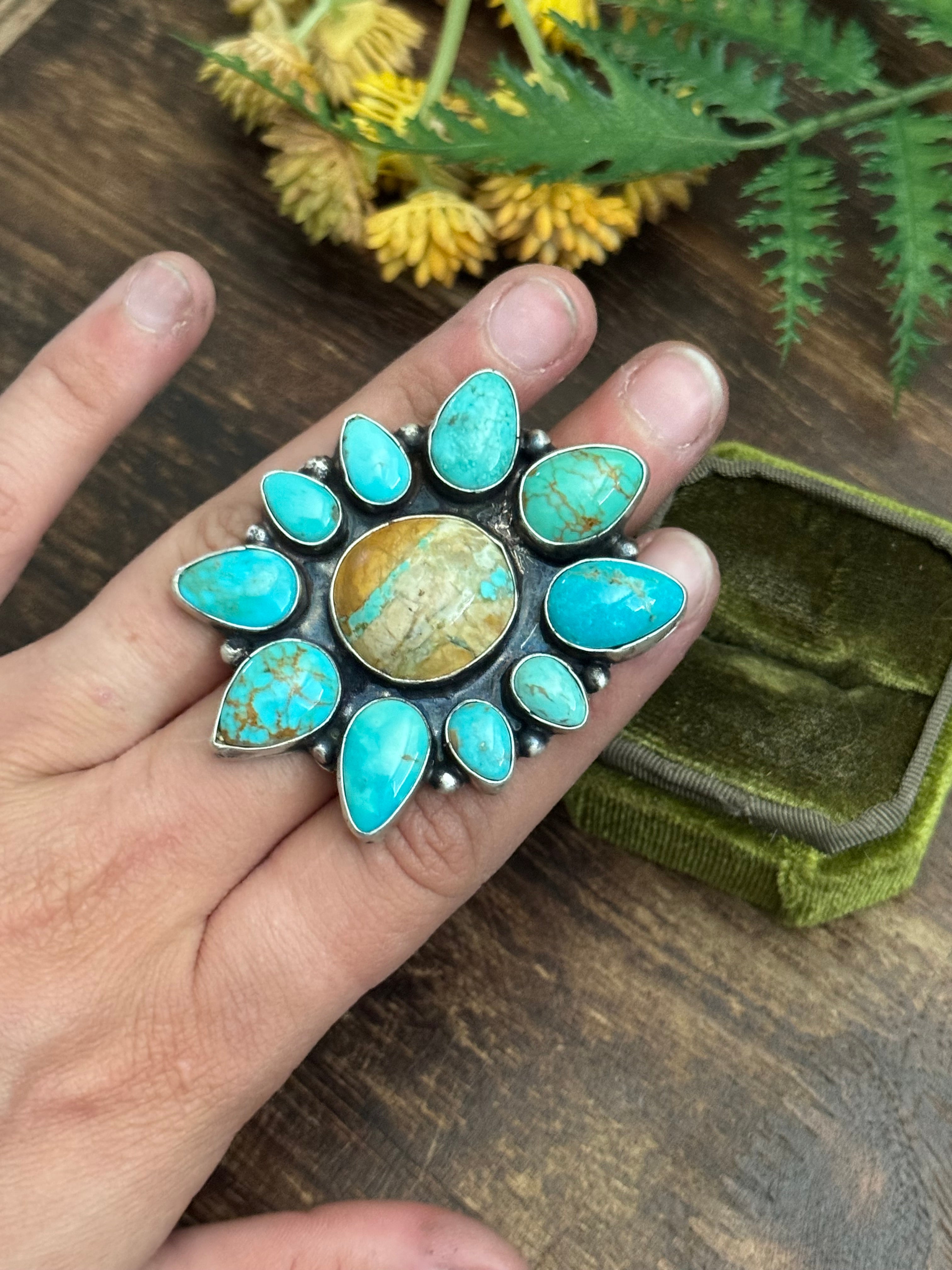 Ella Peters Multi Turquoise & Sterling Sliver Cluster Ring Size 8.75. It measures 2 1/8 inches long and 1 5/8 inches wide. Signed by the artist and stamped sterling silver.