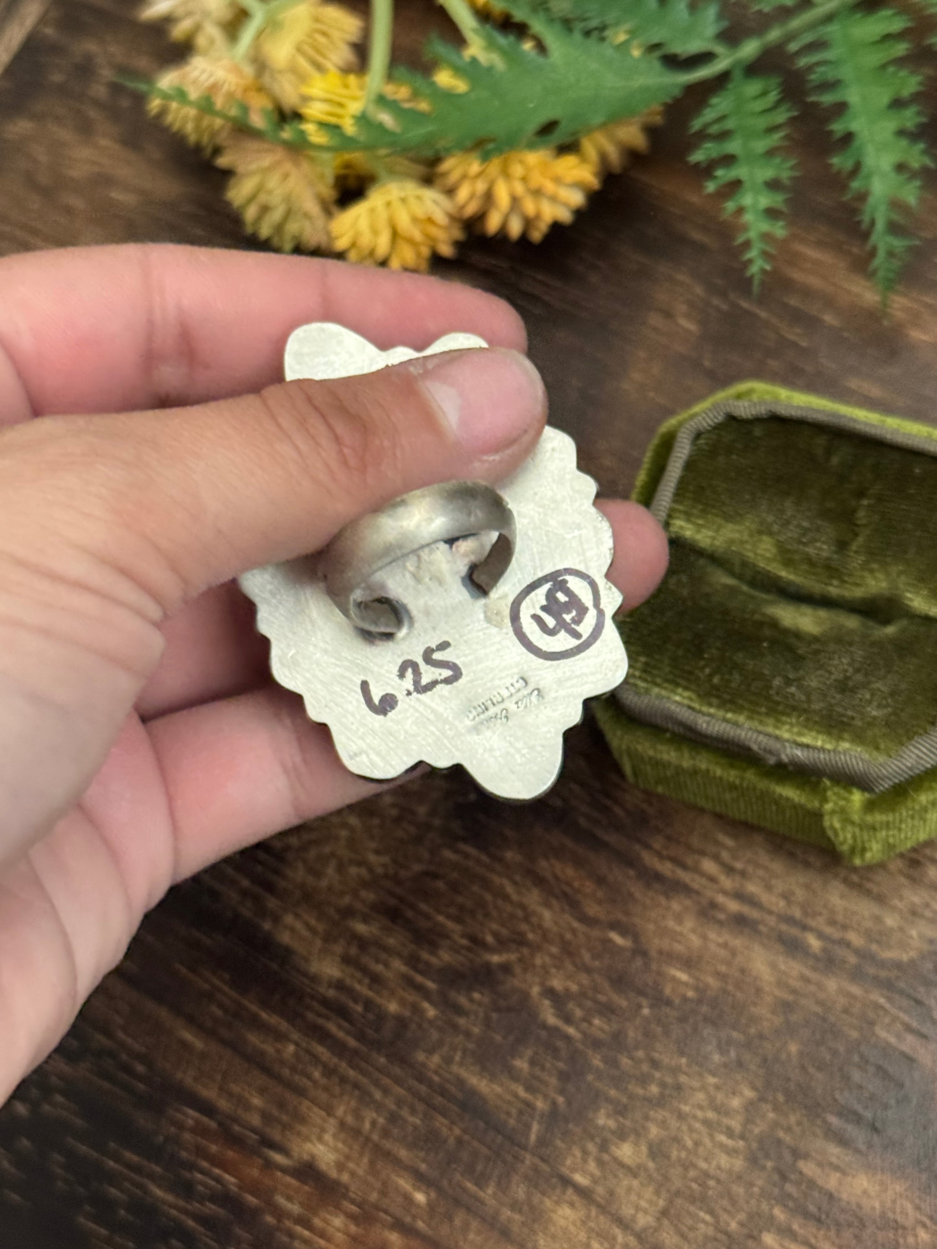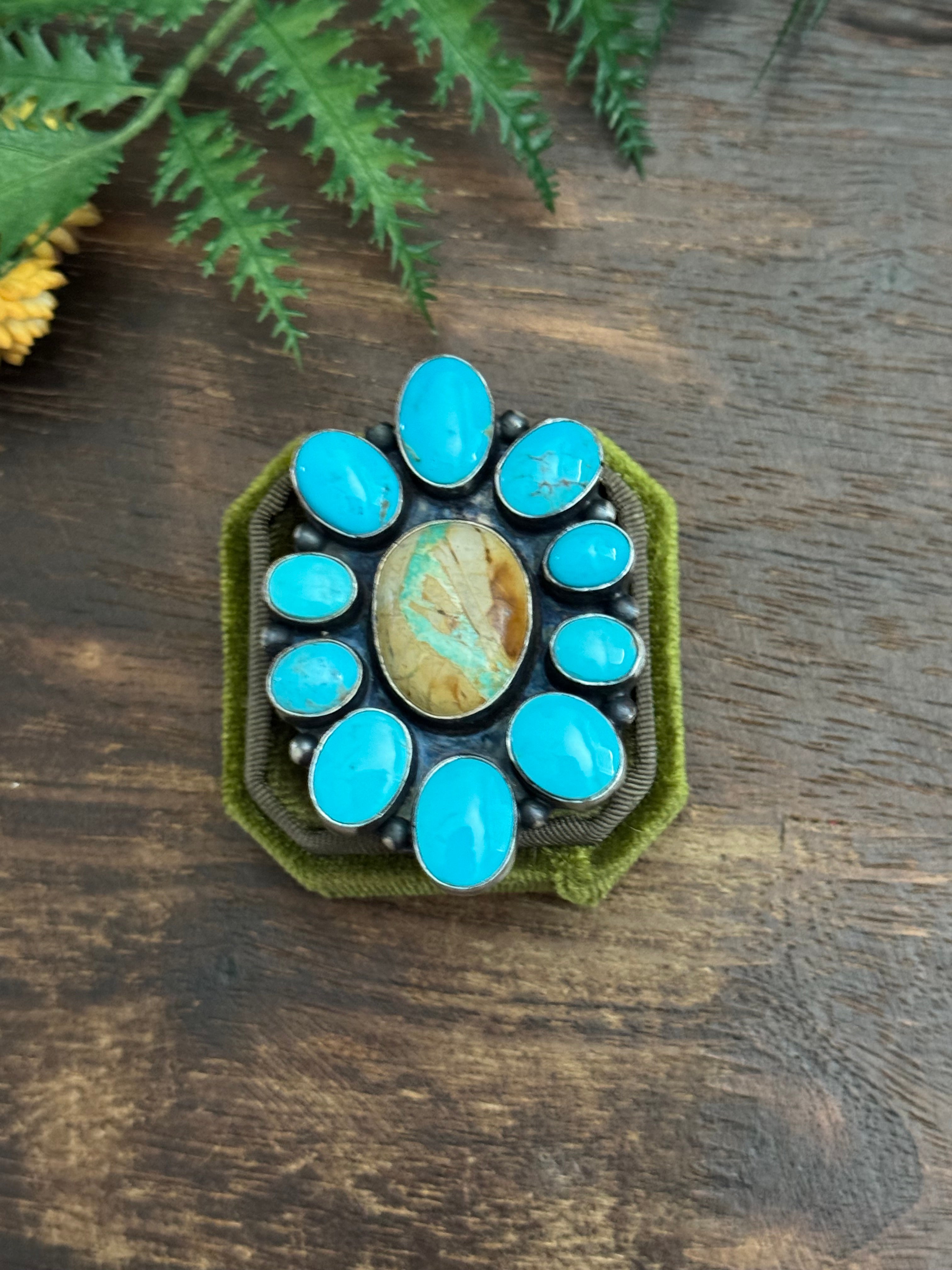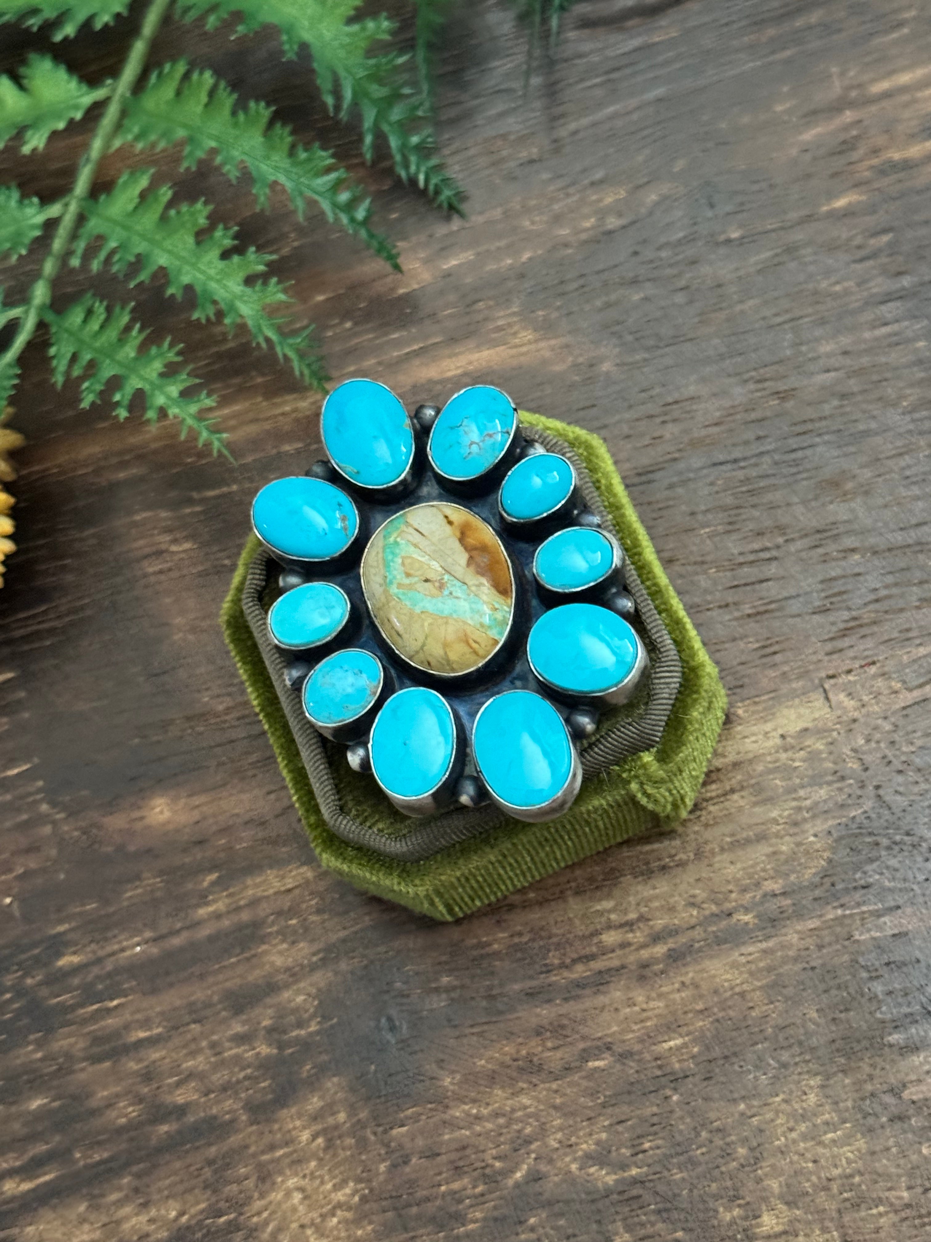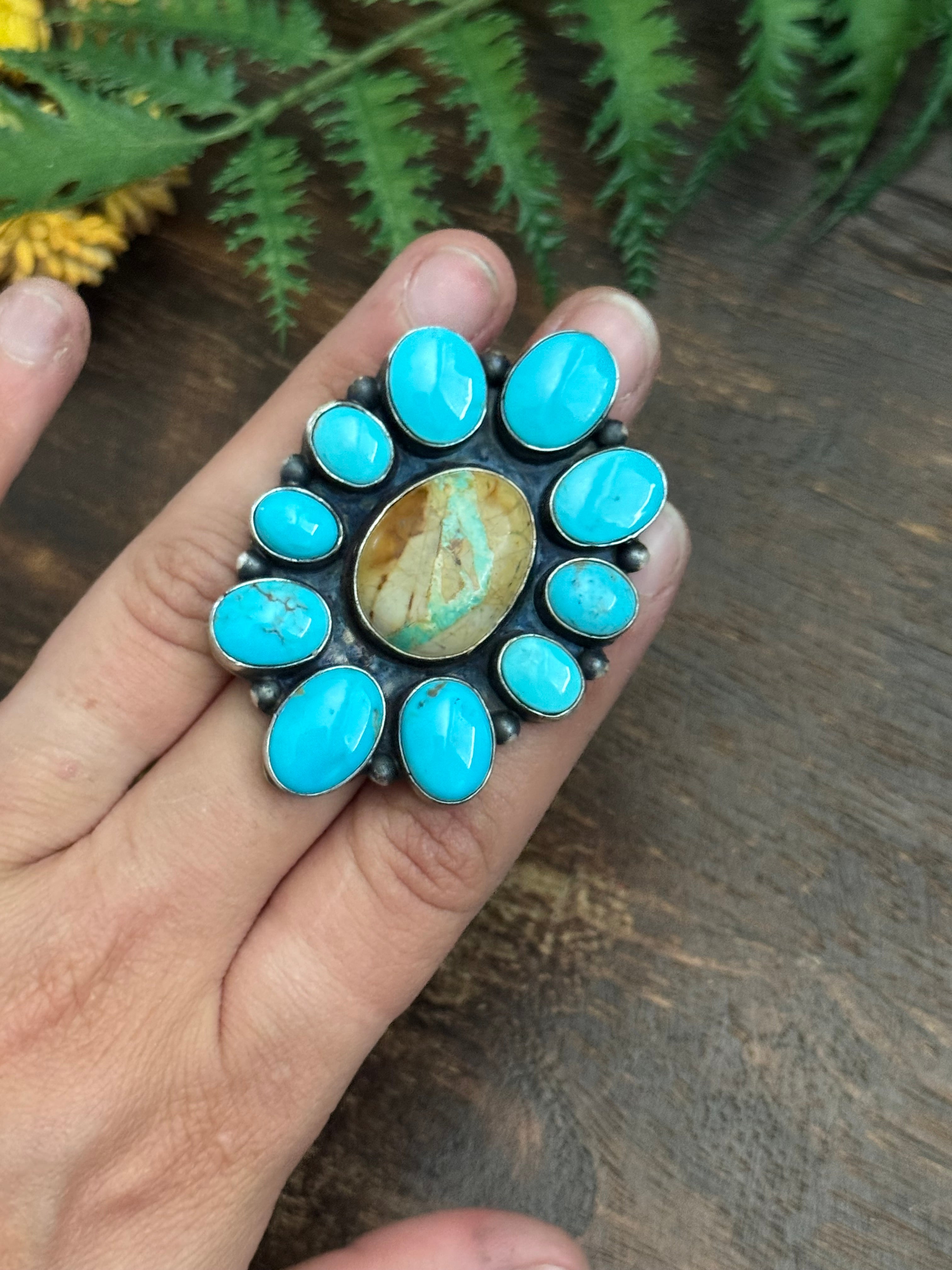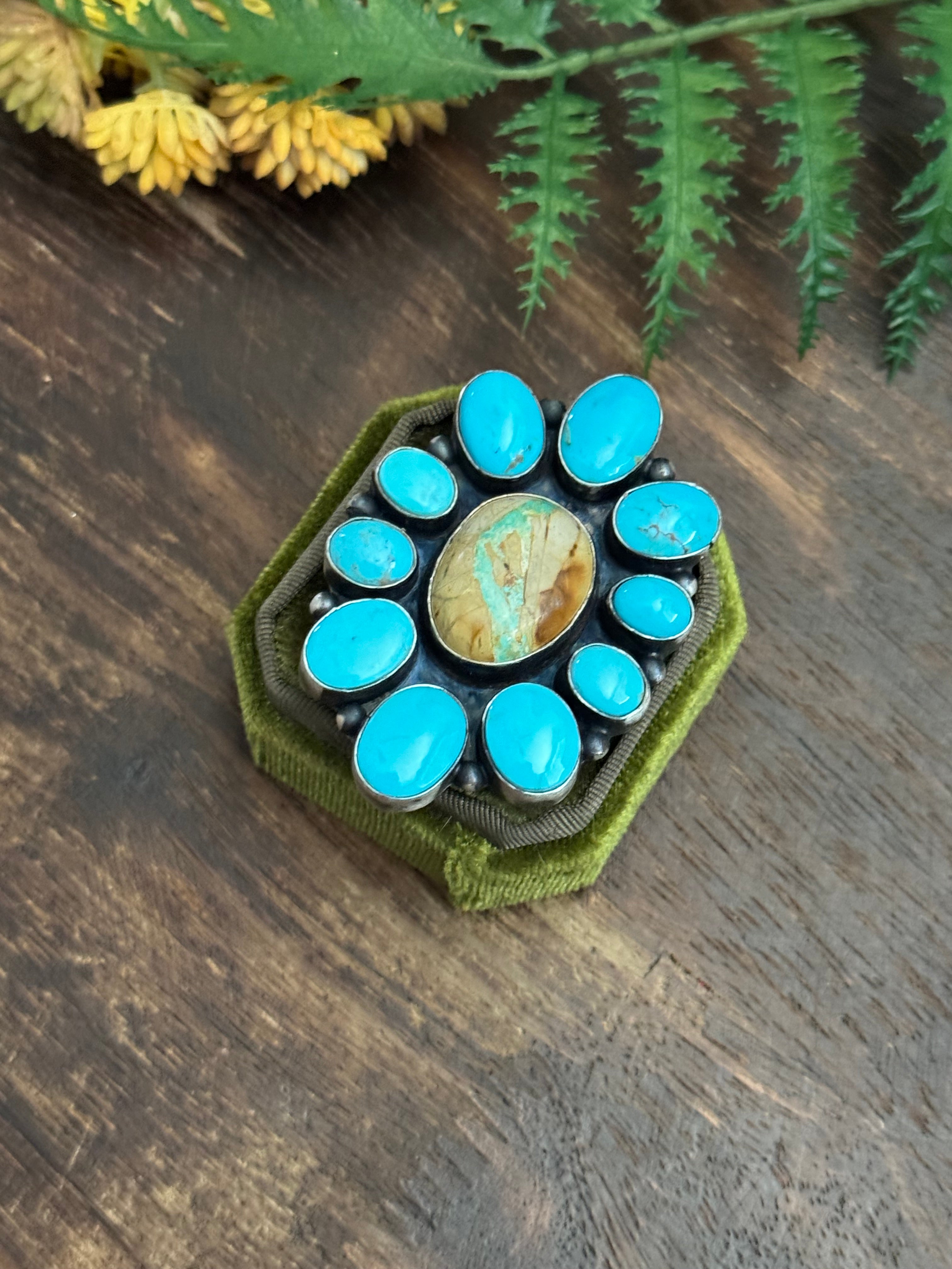 Ella Peters Multi Turquoise & Sterling Sliver Cluster Ring Size 6.25. It measures 2 1/2 inches long and 1 3/8 inches wide. Signed by the artist and stamped sterling silver.