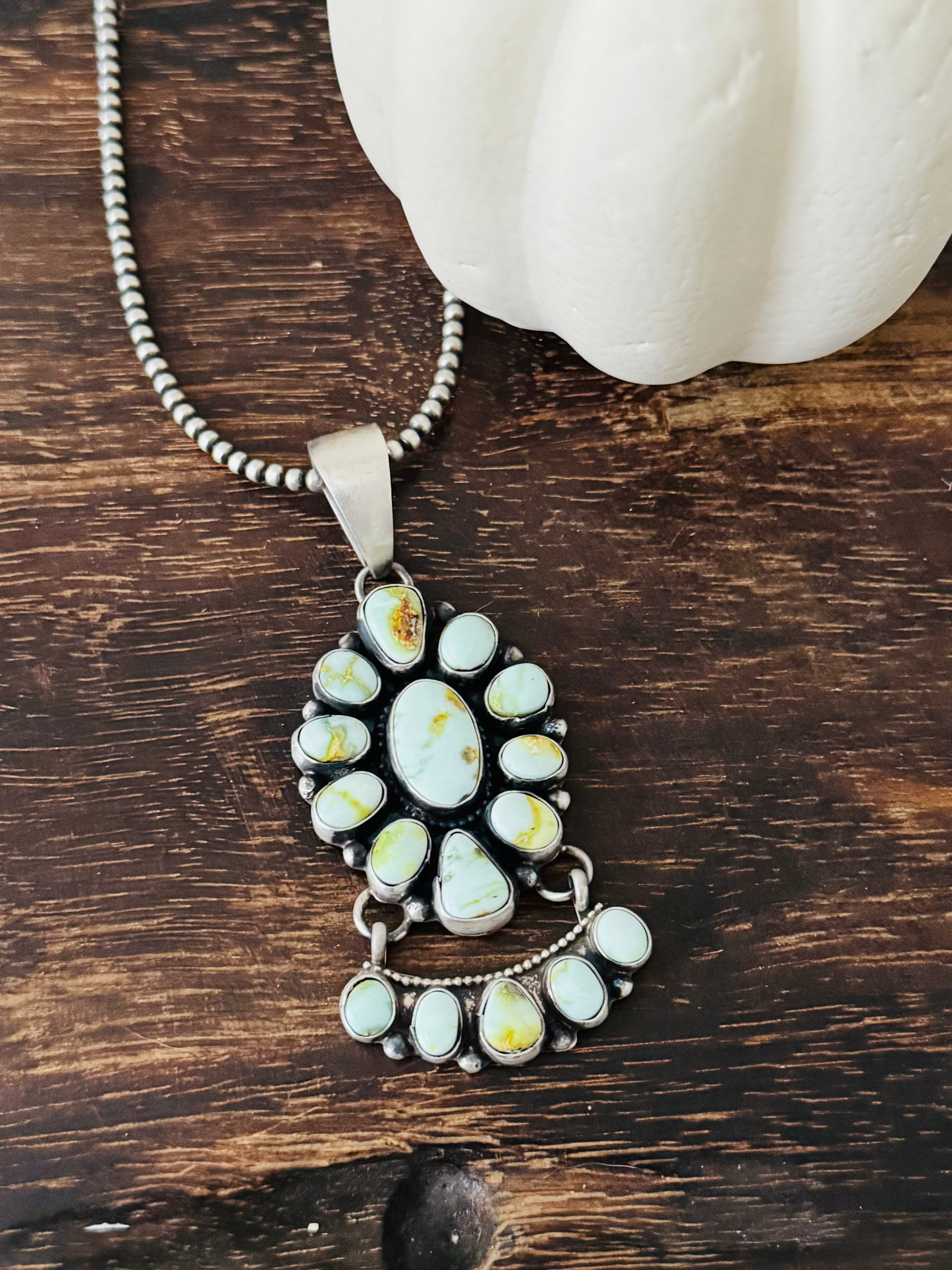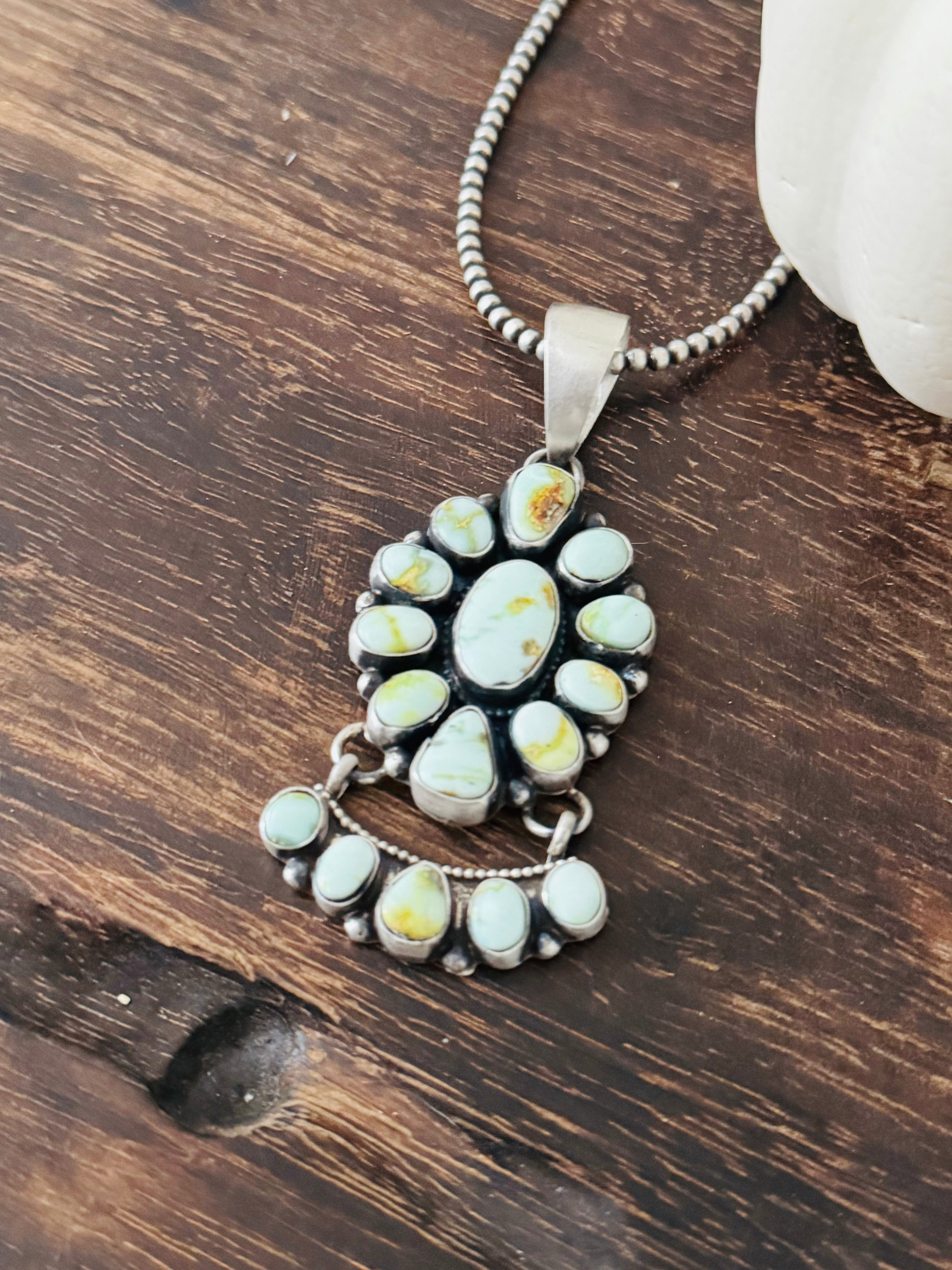 Ella Peters Palomino Variscite & Sterling Silver Cluster Pendant. It measures 3 1/4 inches long and 1 5/8 inches wide. Pendant Only! Signed by the artist and stamped sterling silver.
