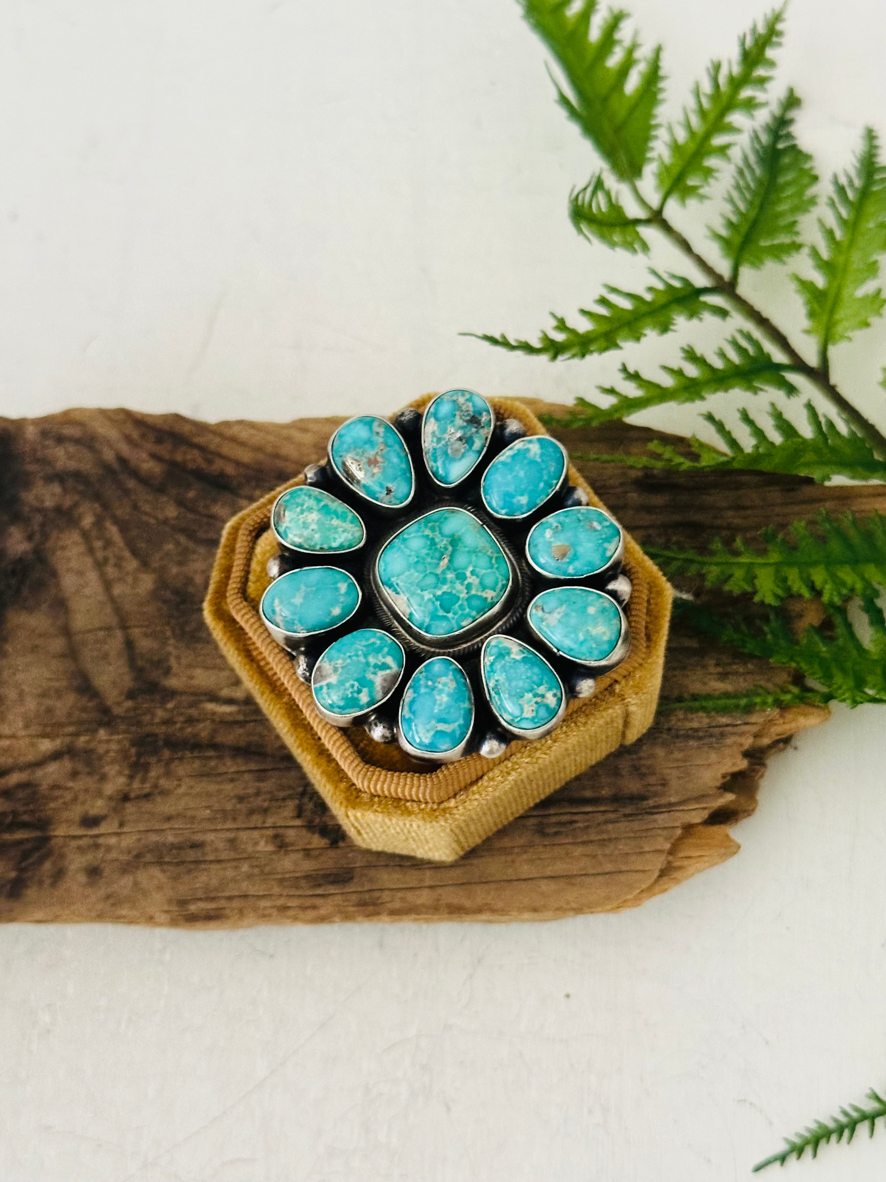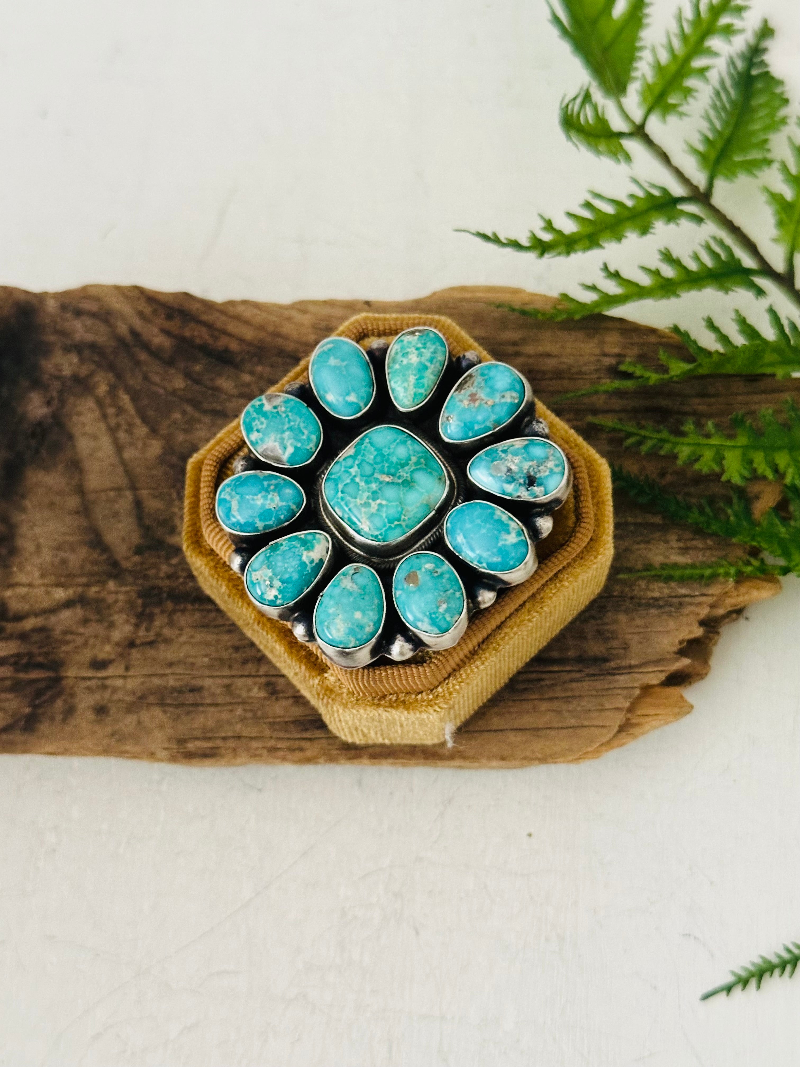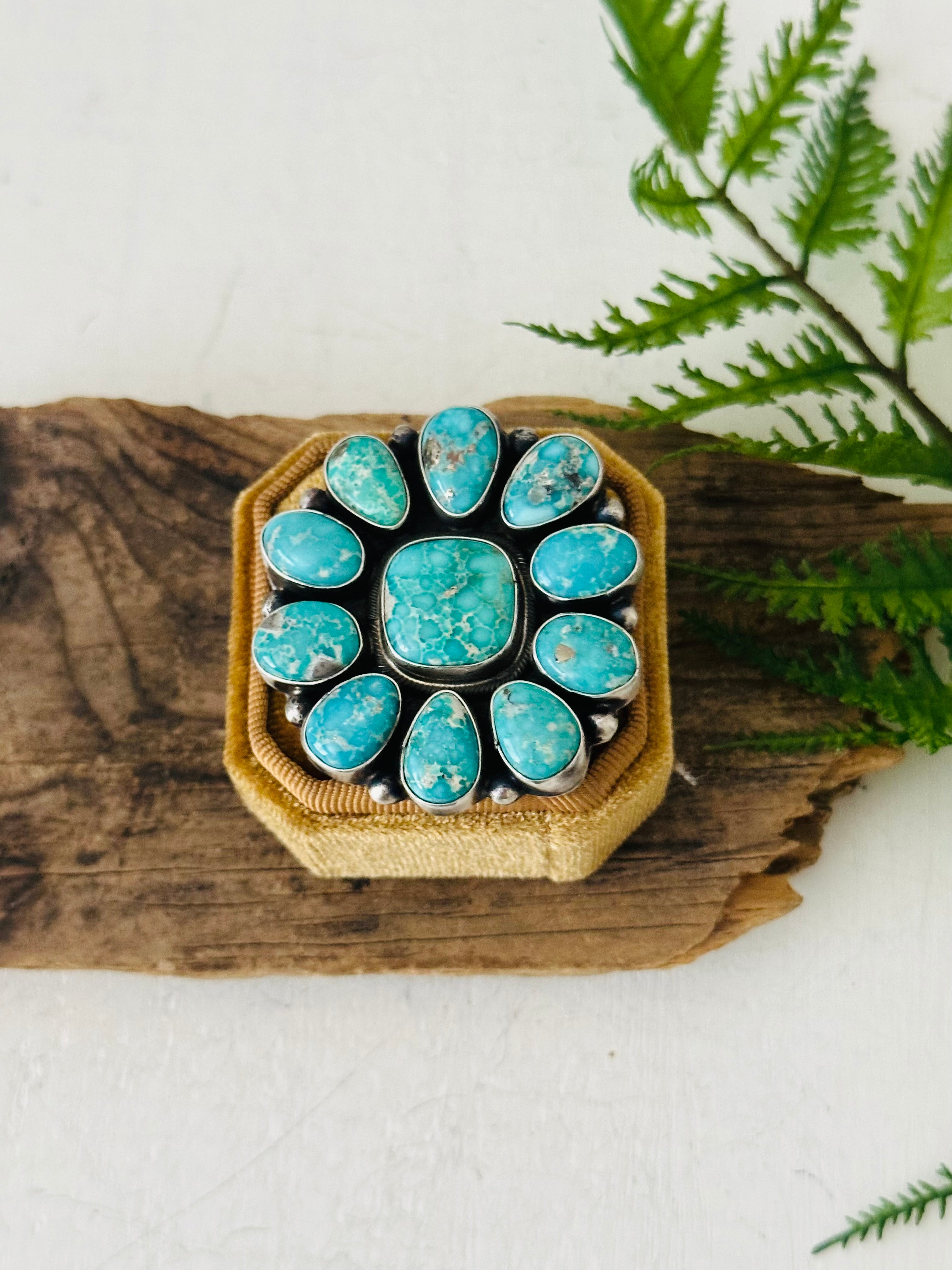 Ella Peters White Water Turquoise & Sterling Silver Ring Size 5.5. It measures 1 7/8 inches long and 1 7/8 inches wide. Signed by the artist and stamped sterling silver.