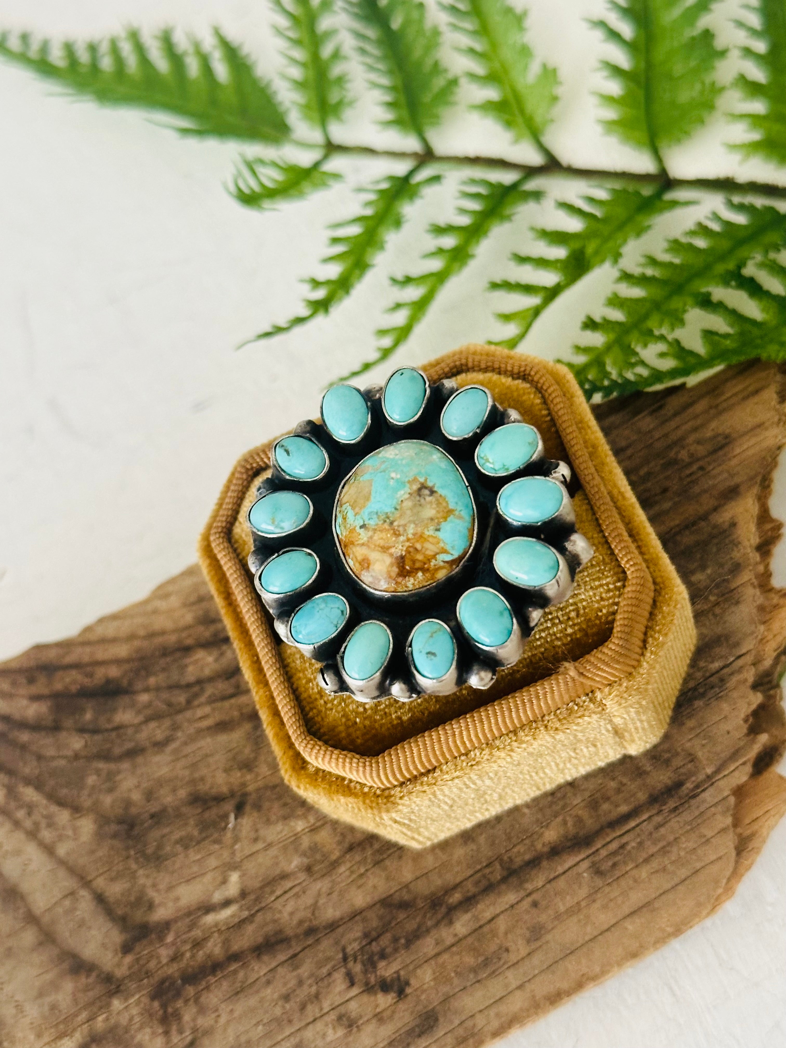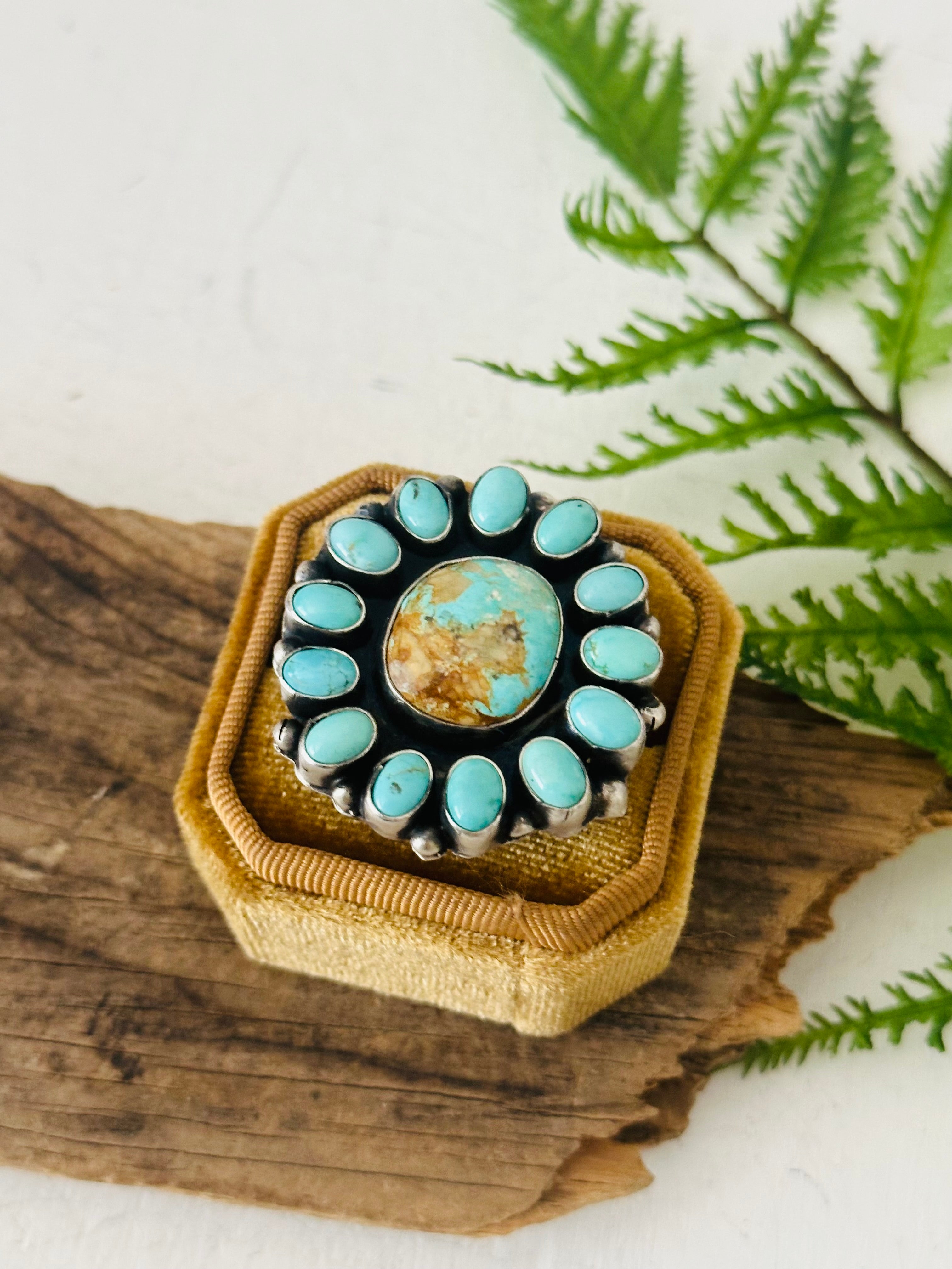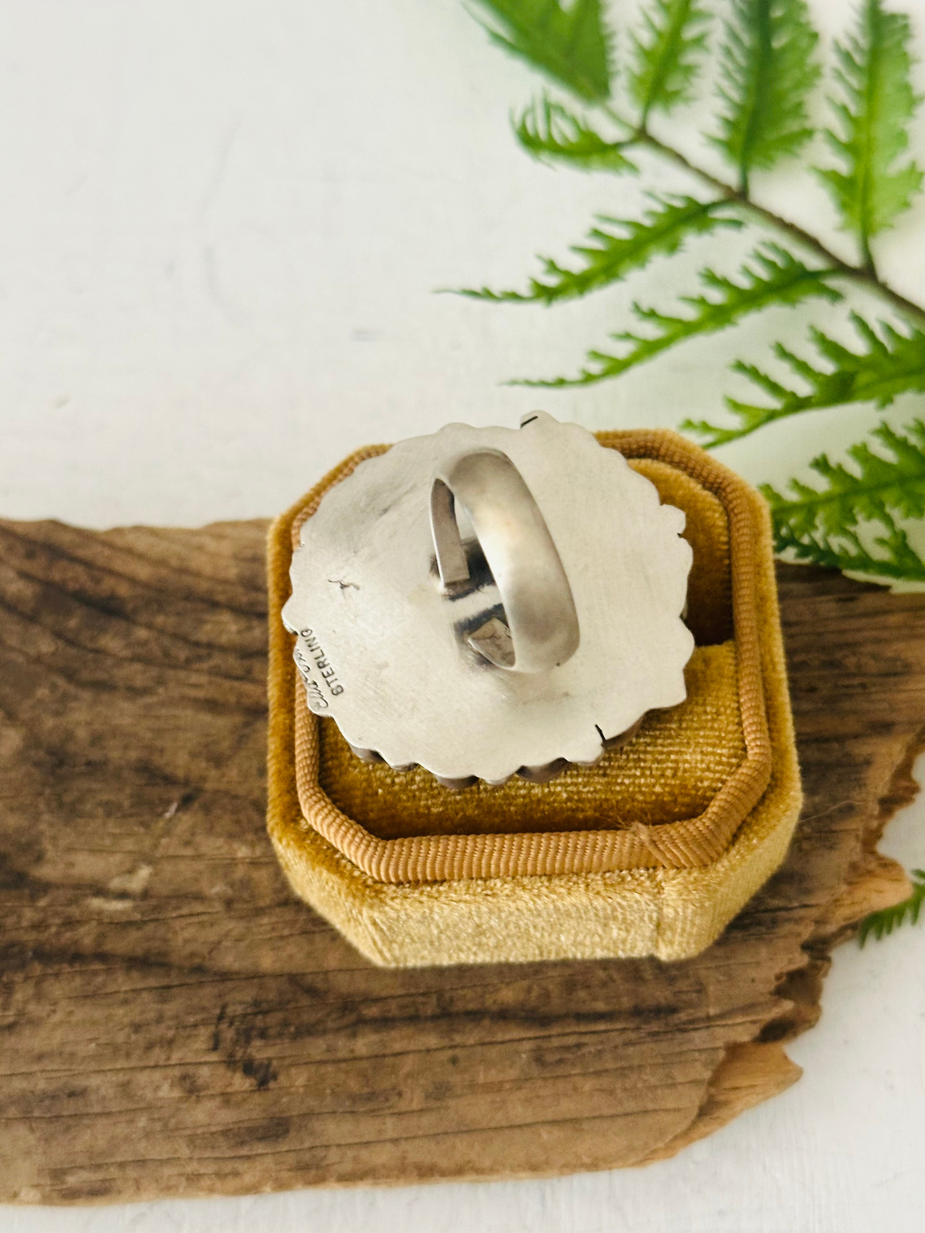 Ella Peters Royston Turquoise & Sterling Silver Ring Size 6.25. It measures 1 1/2 inches long and 1 3/8 inches wide. Signed by the artist and stamped sterling silver.