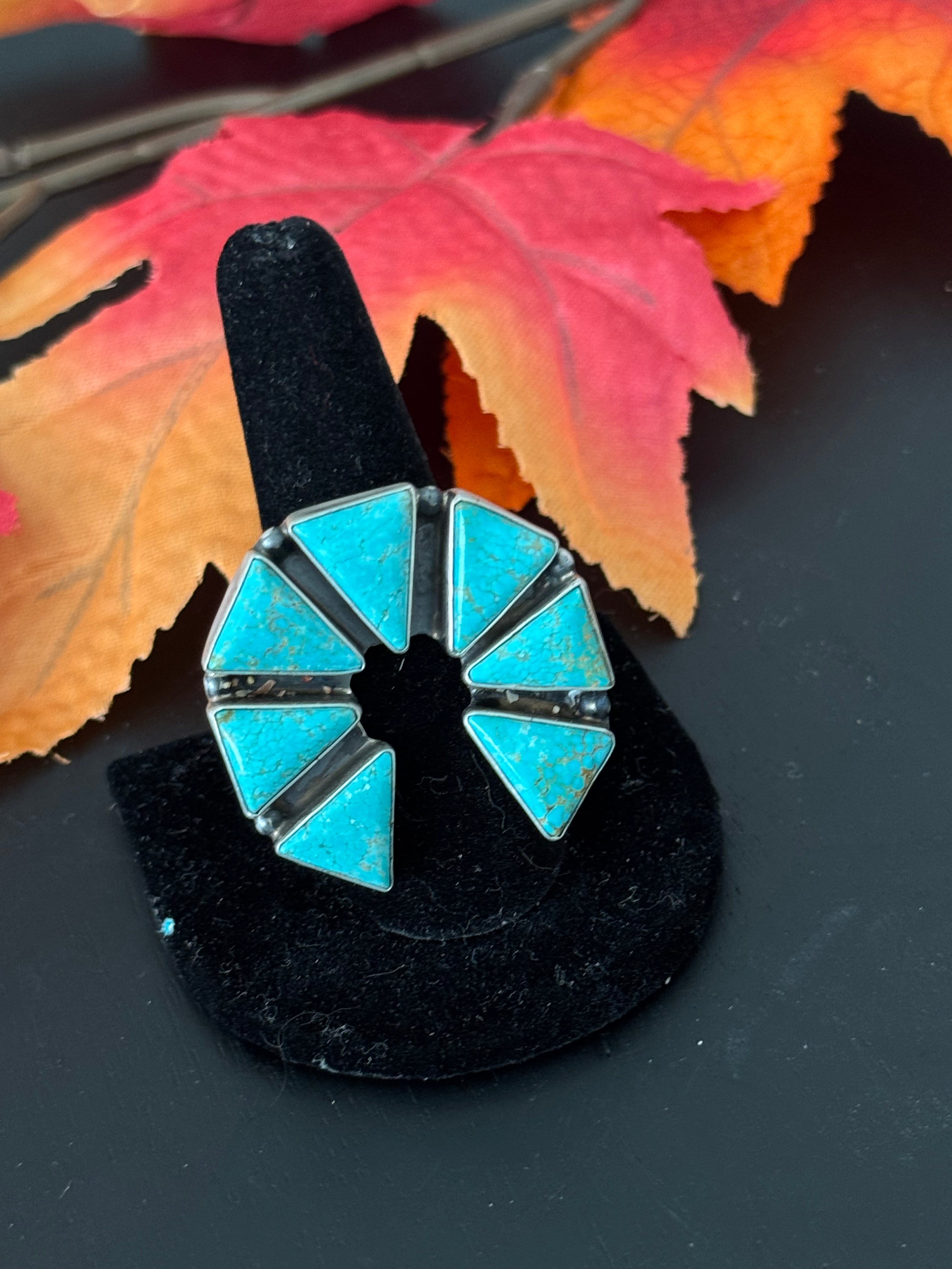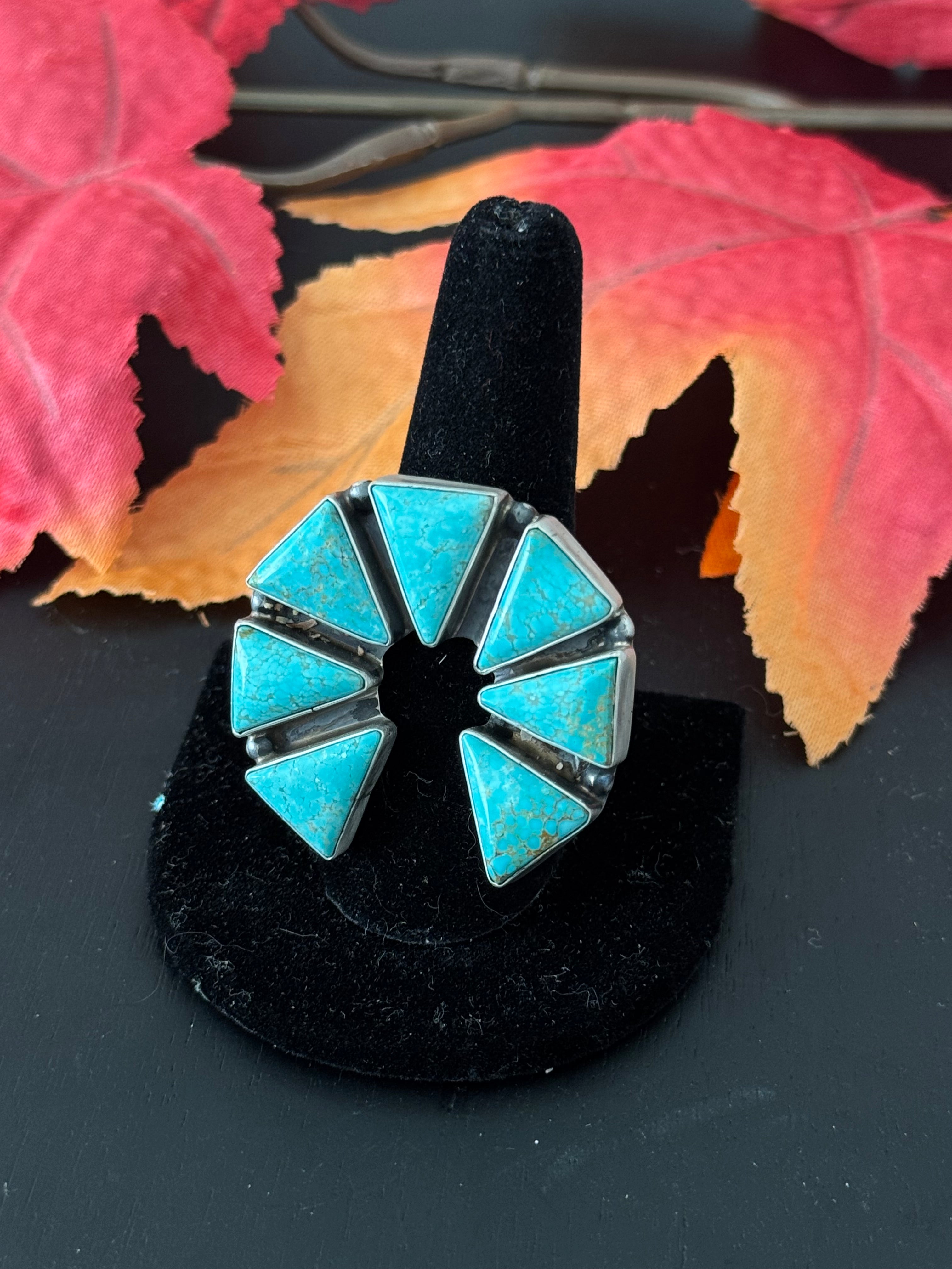 Beautiful naja ring. Elouise Kee #8 Turquoise & Sterling Silver Adjustable Cluster Naja Ring. It measures 1 1/2 inches long and just over 1 3/8 inches wide. Signed by the artist and stamped sterling silver.