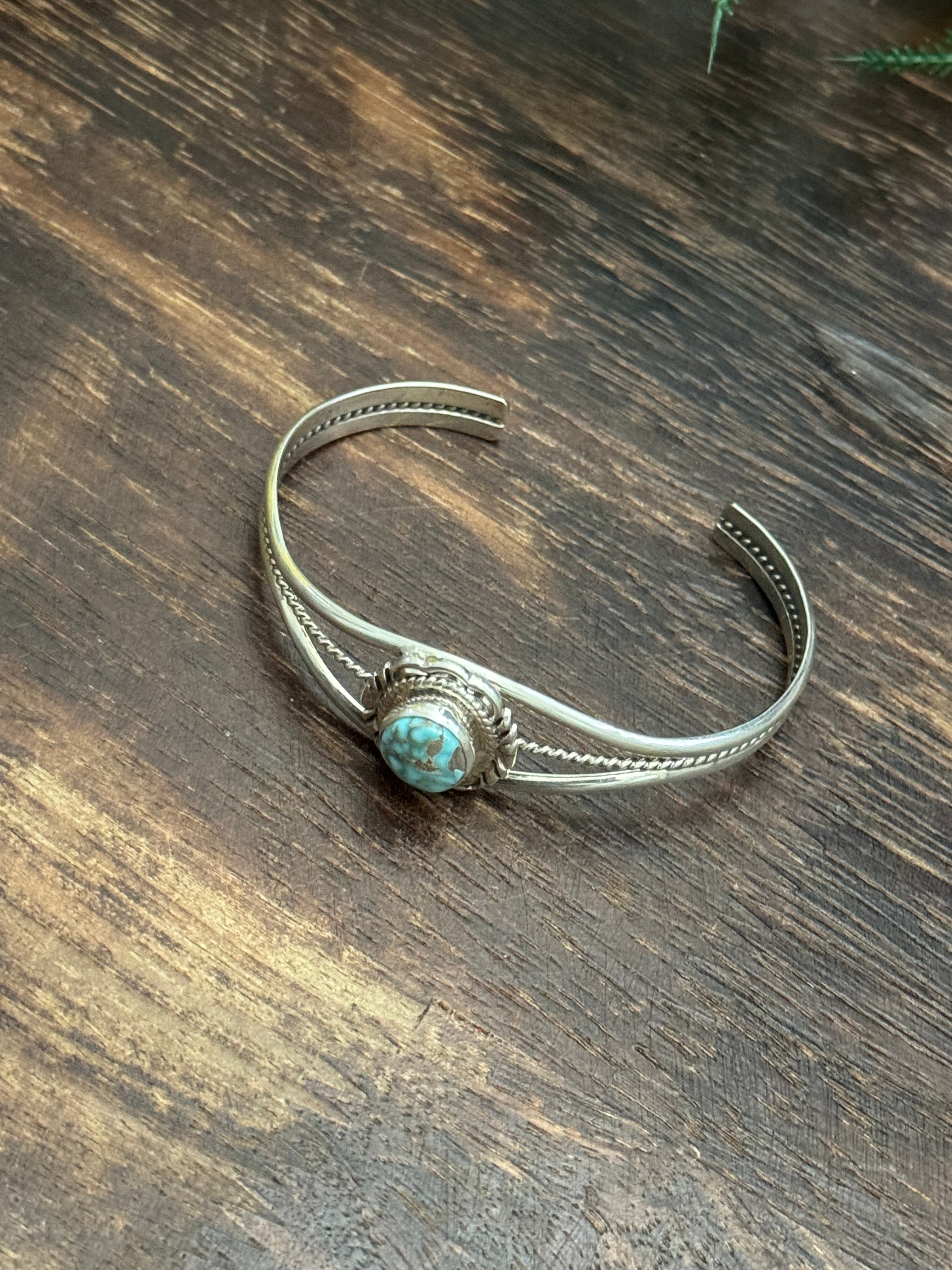 Navajo Made Dry Creek Turquoise & Sterling Silver Cuff Bracelet. Unique stones in this piece! It measures just under 3/4 of an inch wide with an inside circumference of 5 5/8 inches and a gap of 1 inch. Signed by the artist and stamped sterling silver.