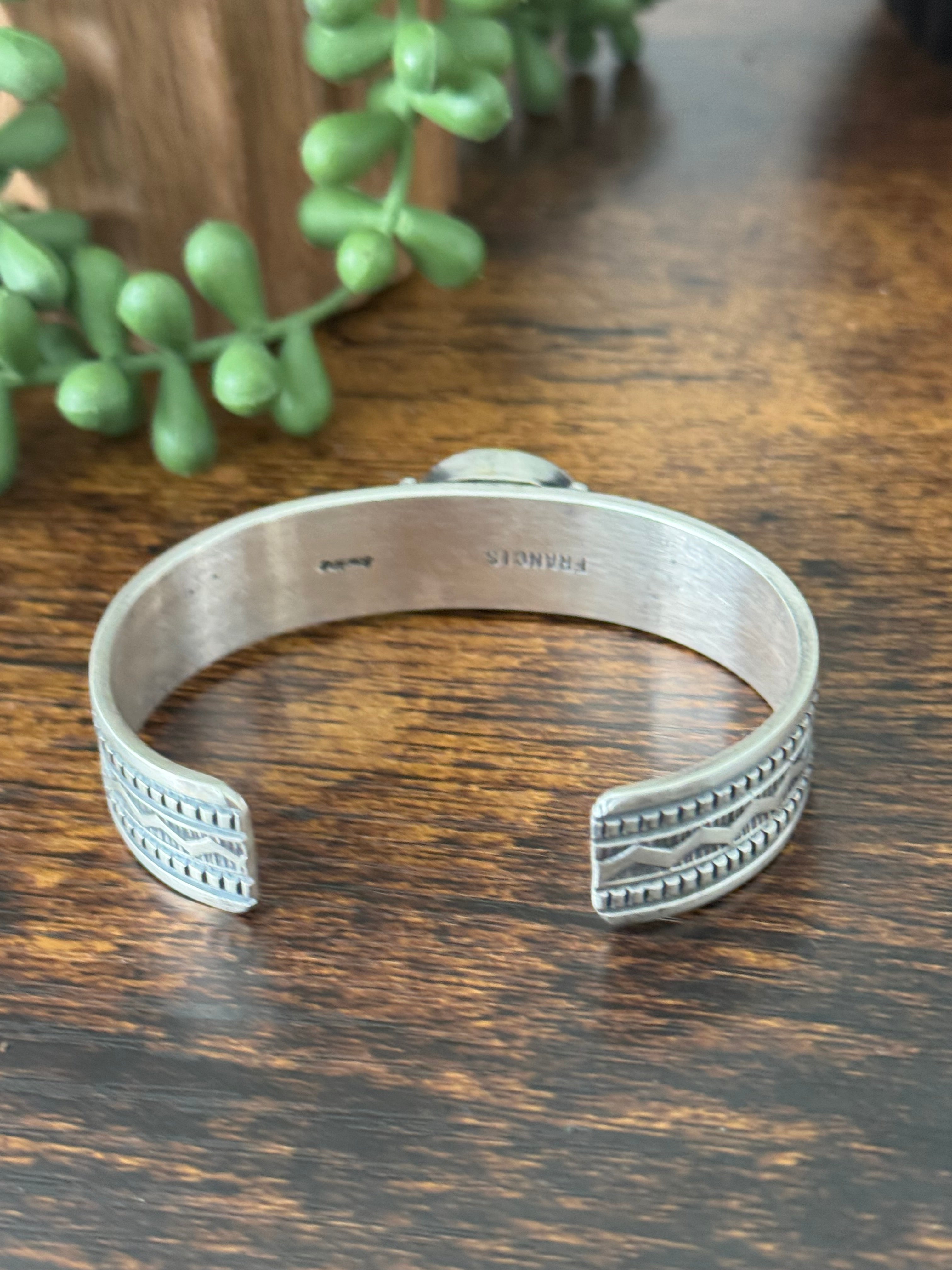 A stunning piece by Francis Yazzie Palomino Variscite and Sterling Silver Cuff Bracelet. Unique stones in this piece! It measures 5/8 of an inch wide with an inside circumference of 5 3/4 inches and a gap of 1 1/8 inches. Signed by the artist and stamped sterling silver.
